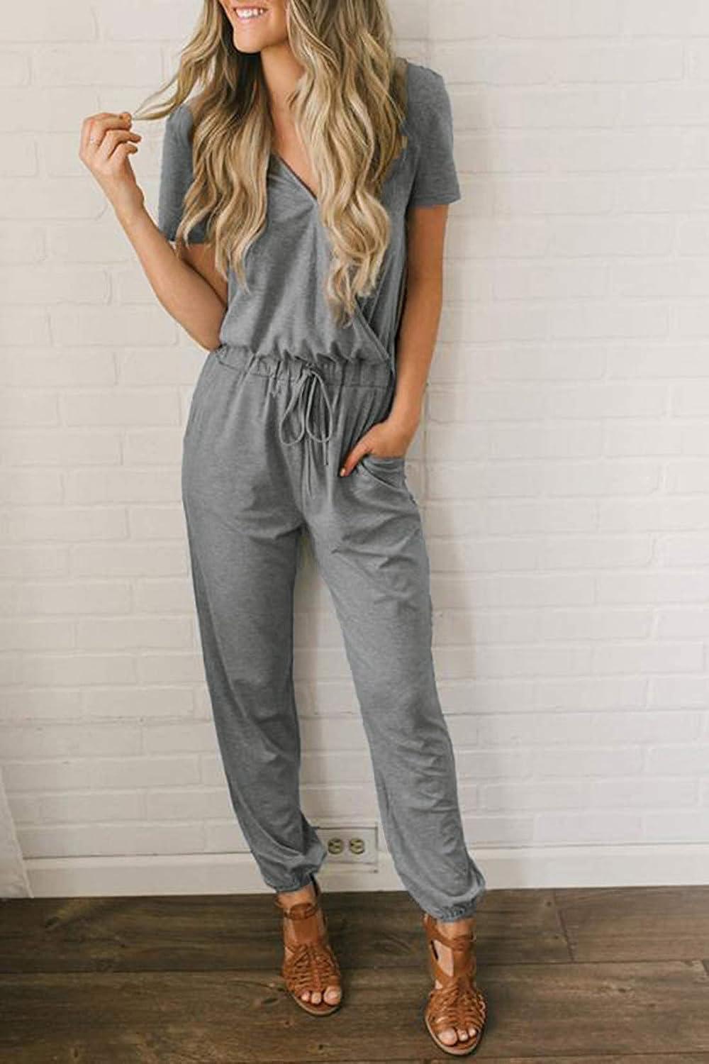 imagePRETTYGARDEN Jumpsuits for Women Dressy 2025 Summer Casual Short Sleeve Romper Spring Airport Beach Vacation Travel OutfitsGrey