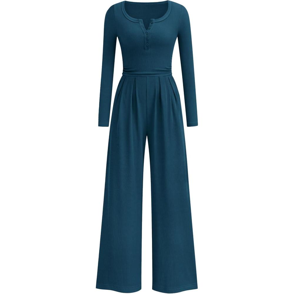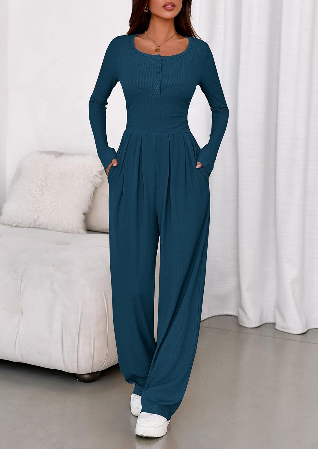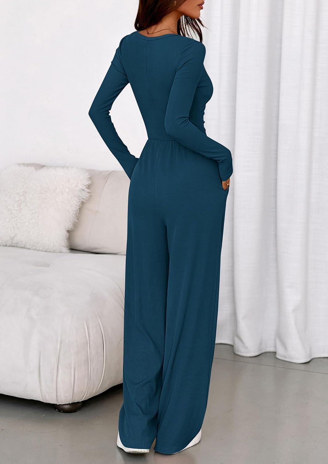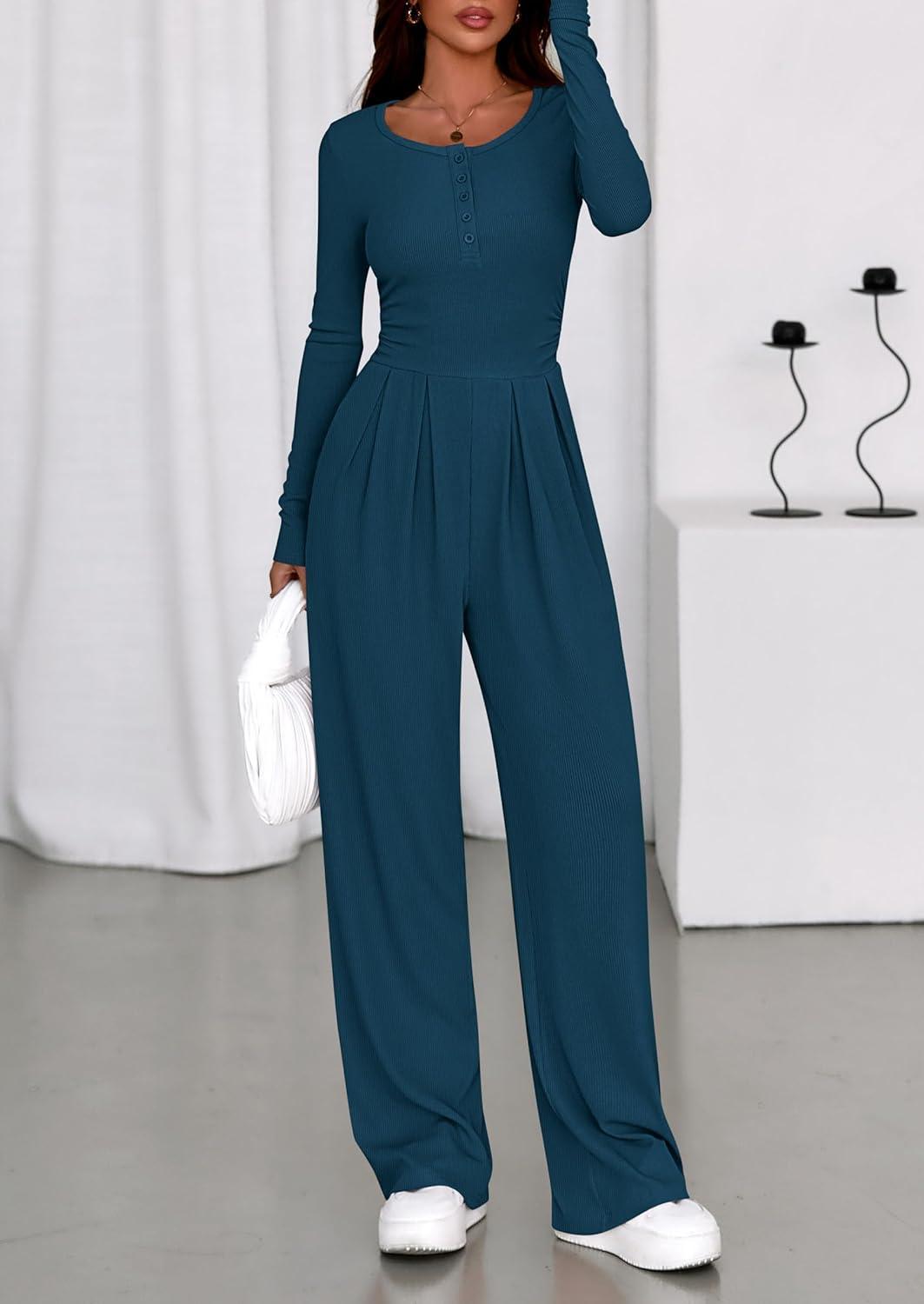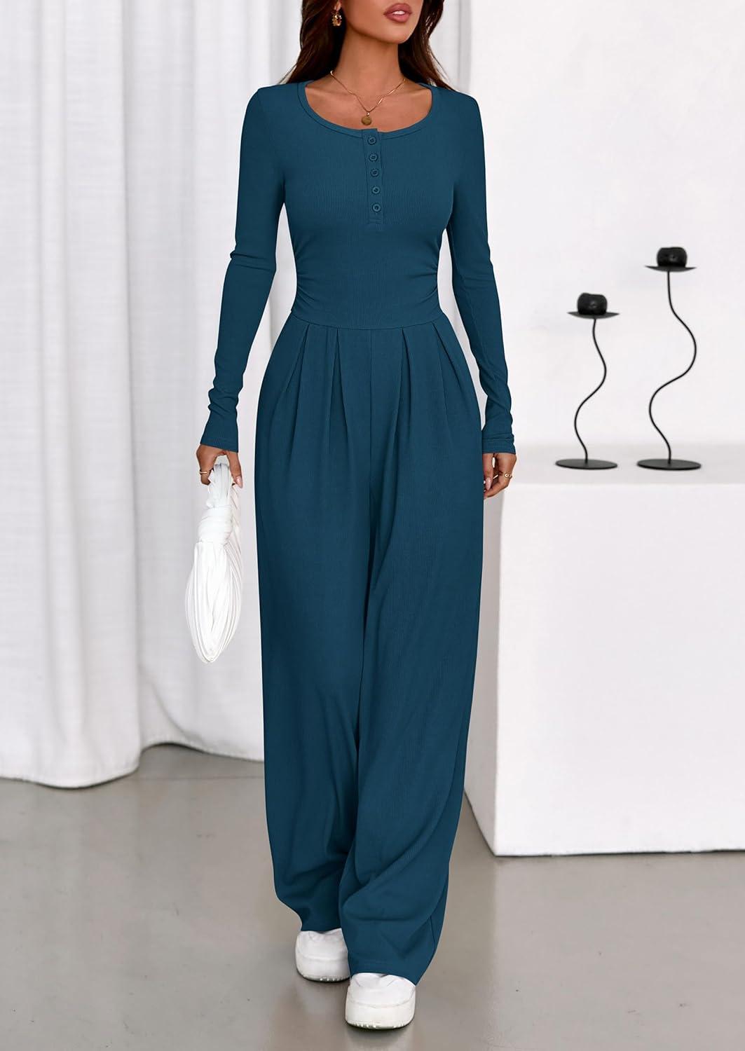 PRETTYGARDEN Jumpsuits for Women Dressy Casual 2025 Fall One Piece Outfits Long Sleeve Wide Leg Pants Romper Fashion Clothing(Lake Blue)