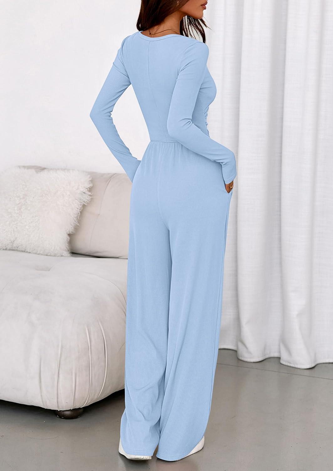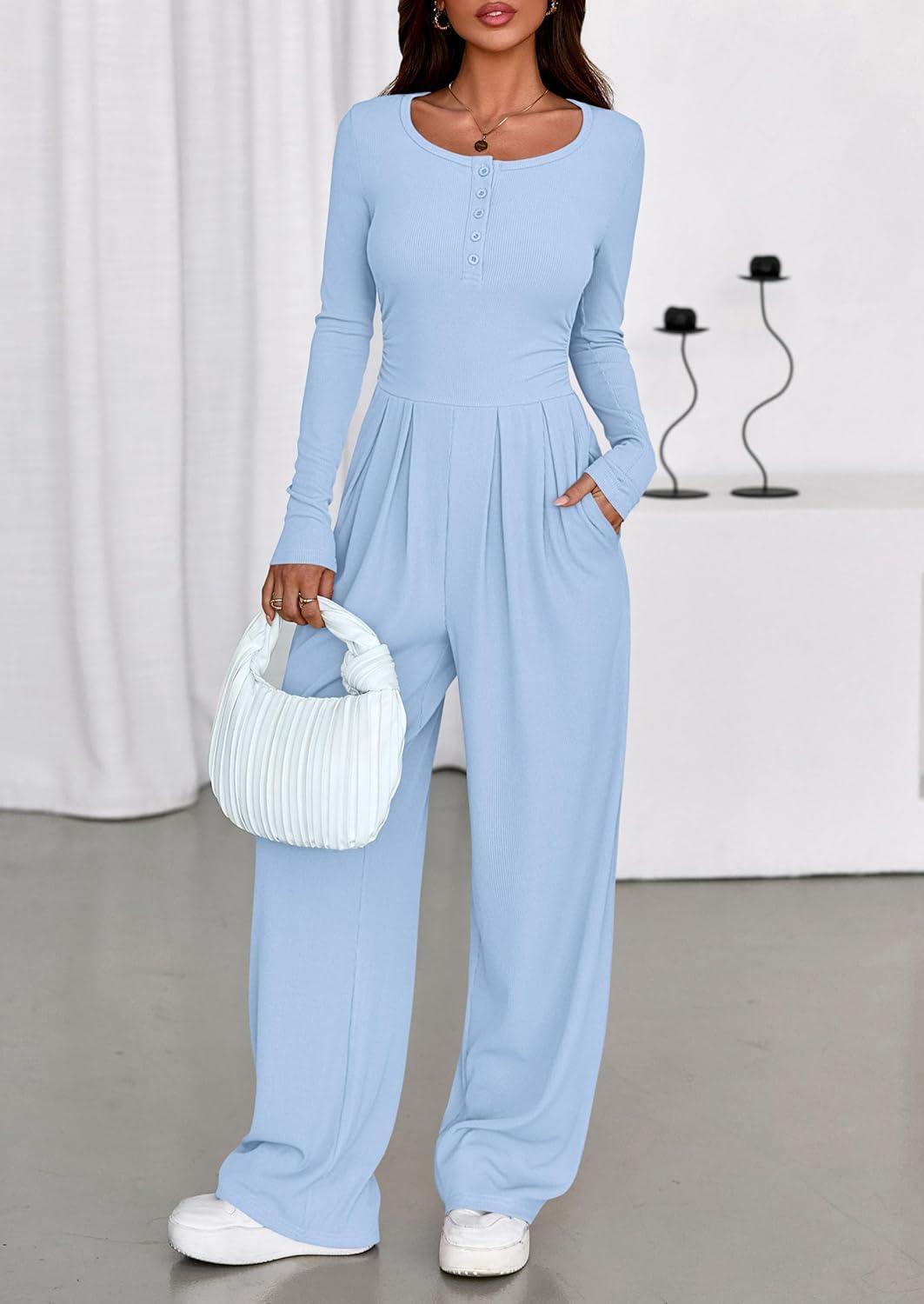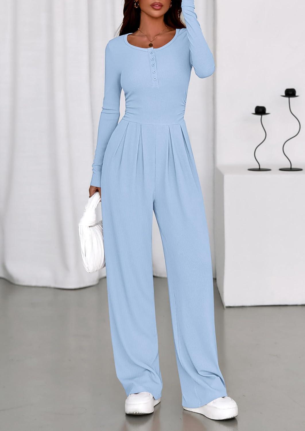PRETTYGARDEN Jumpsuits for Women Dressy Casual 2025 Fall One Piece Outfits Long Sleeve Wide Leg Pants Romper Fashion Clothing(Light Blue)