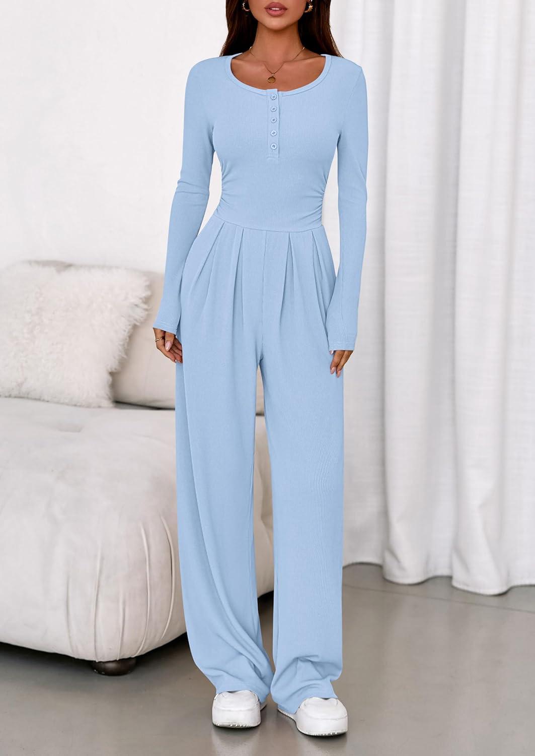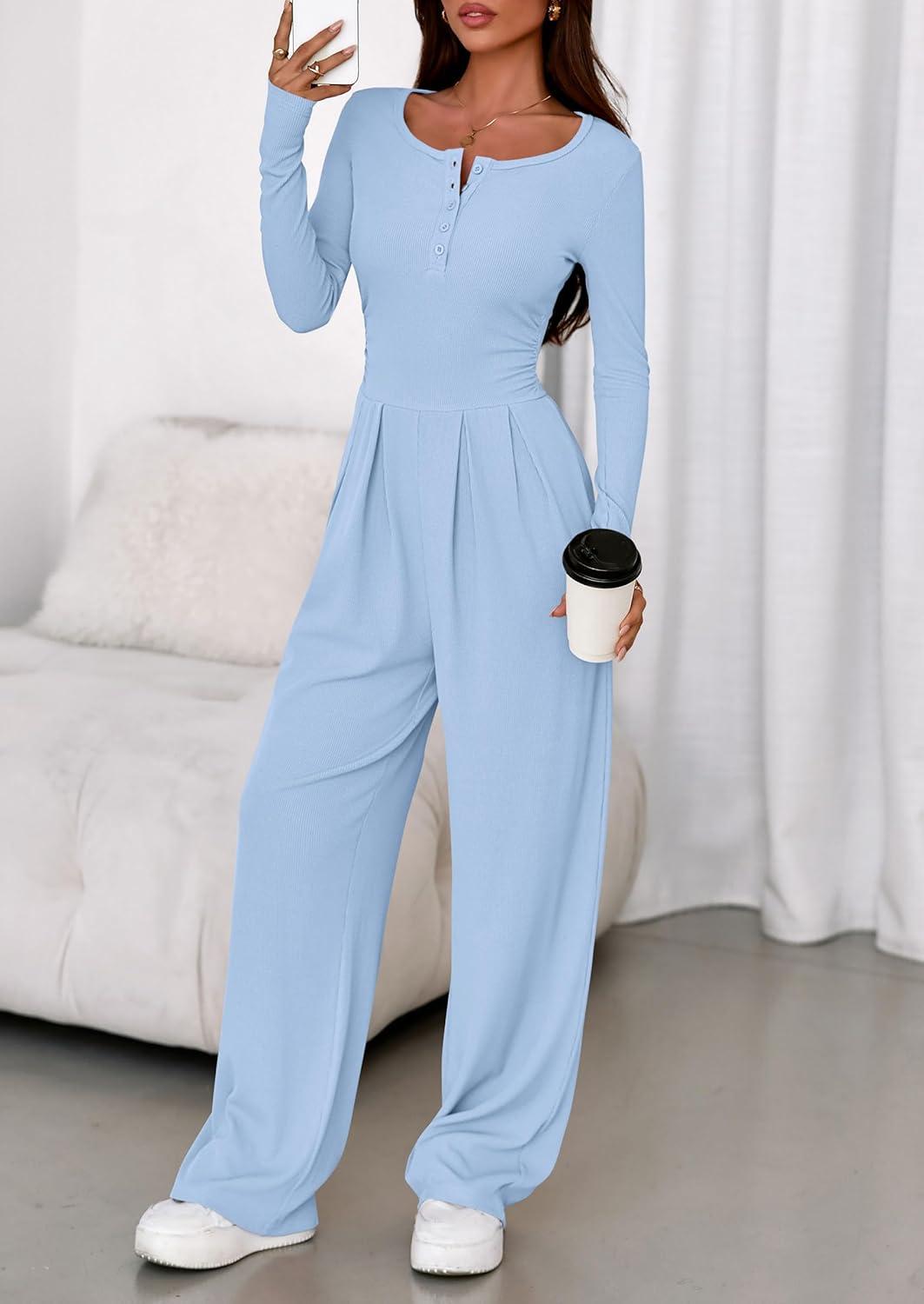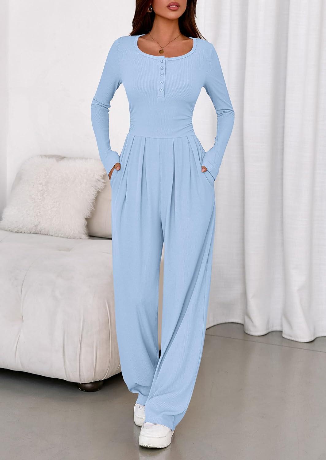 PRETTYGARDEN Jumpsuits for Women Dressy Casual 2025 Fall One Piece Outfits Long Sleeve Wide Leg Pants Romper Fashion Clothing(Light Blue)
