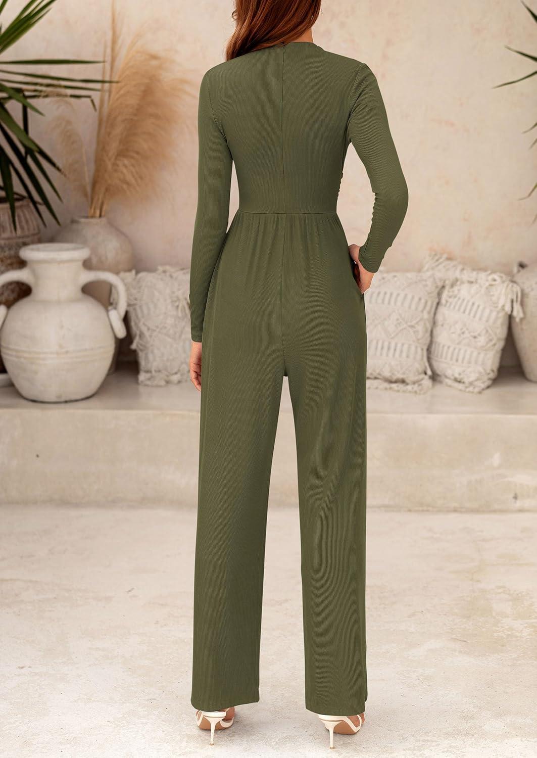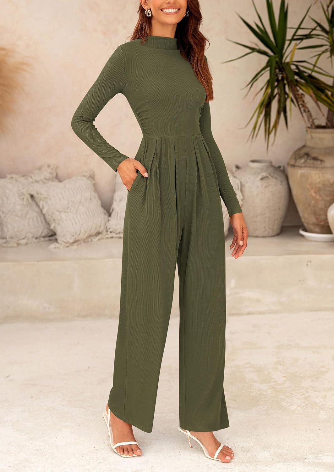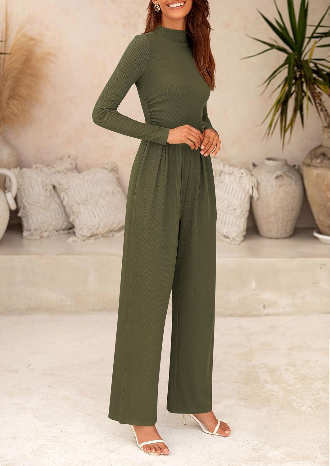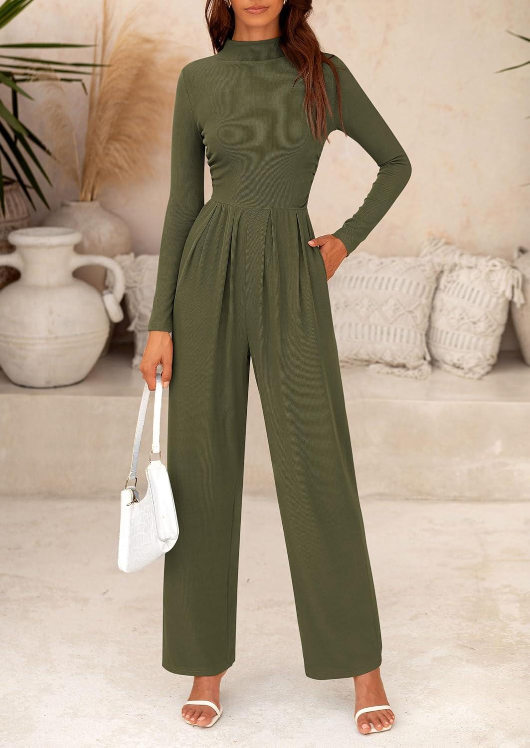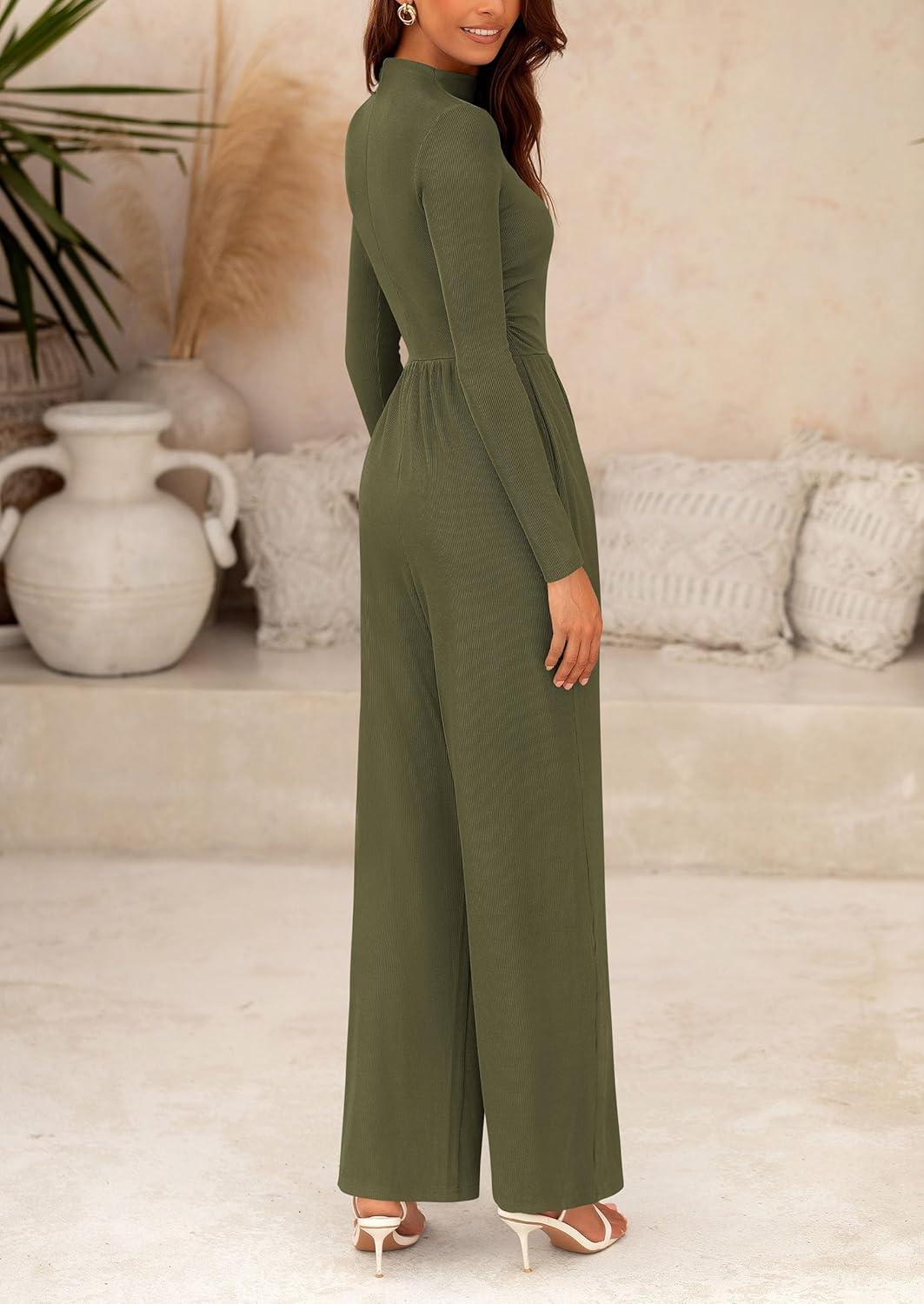 PRETTYGARDEN Jumpsuits For Women Dressy Fall Fashion Clothing 2025 Long Sleeve Mock Neck Date Night Rompers Business Outfits(Army Green)