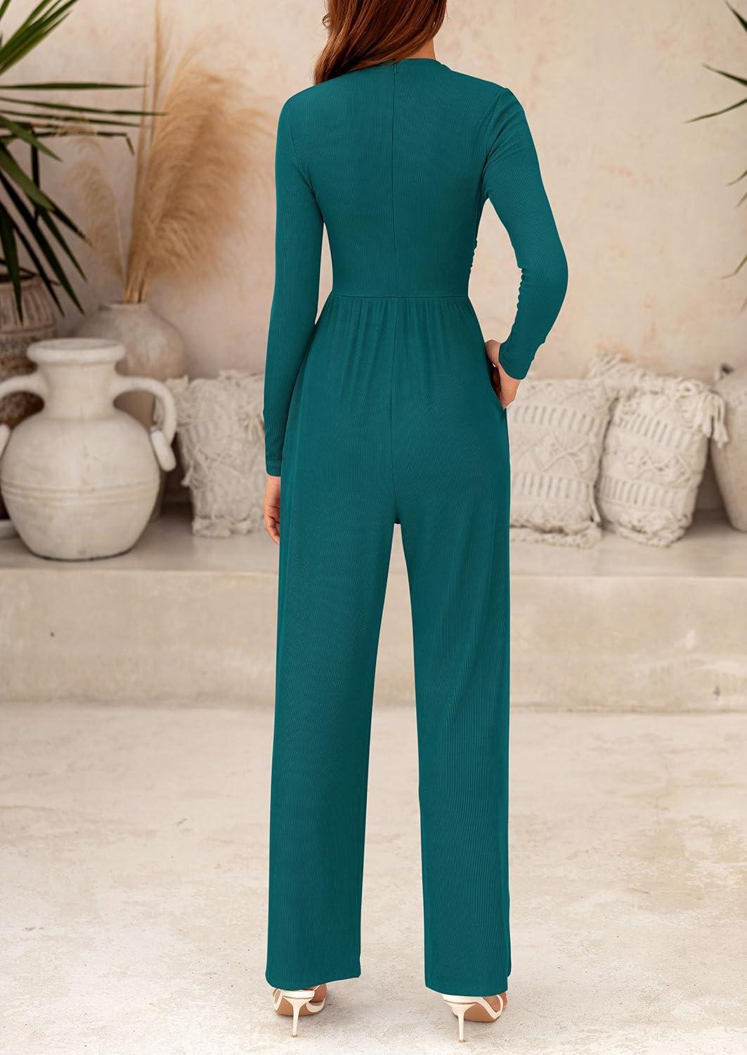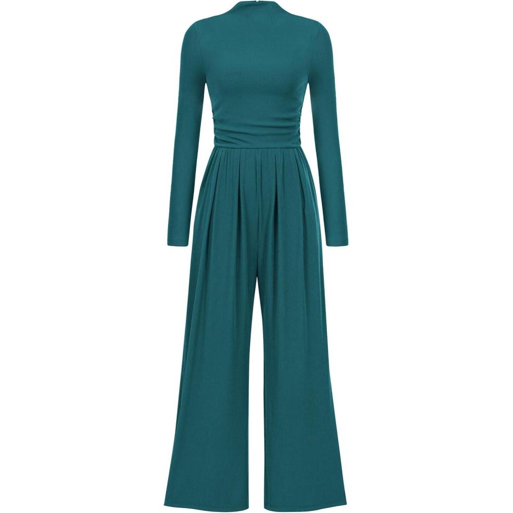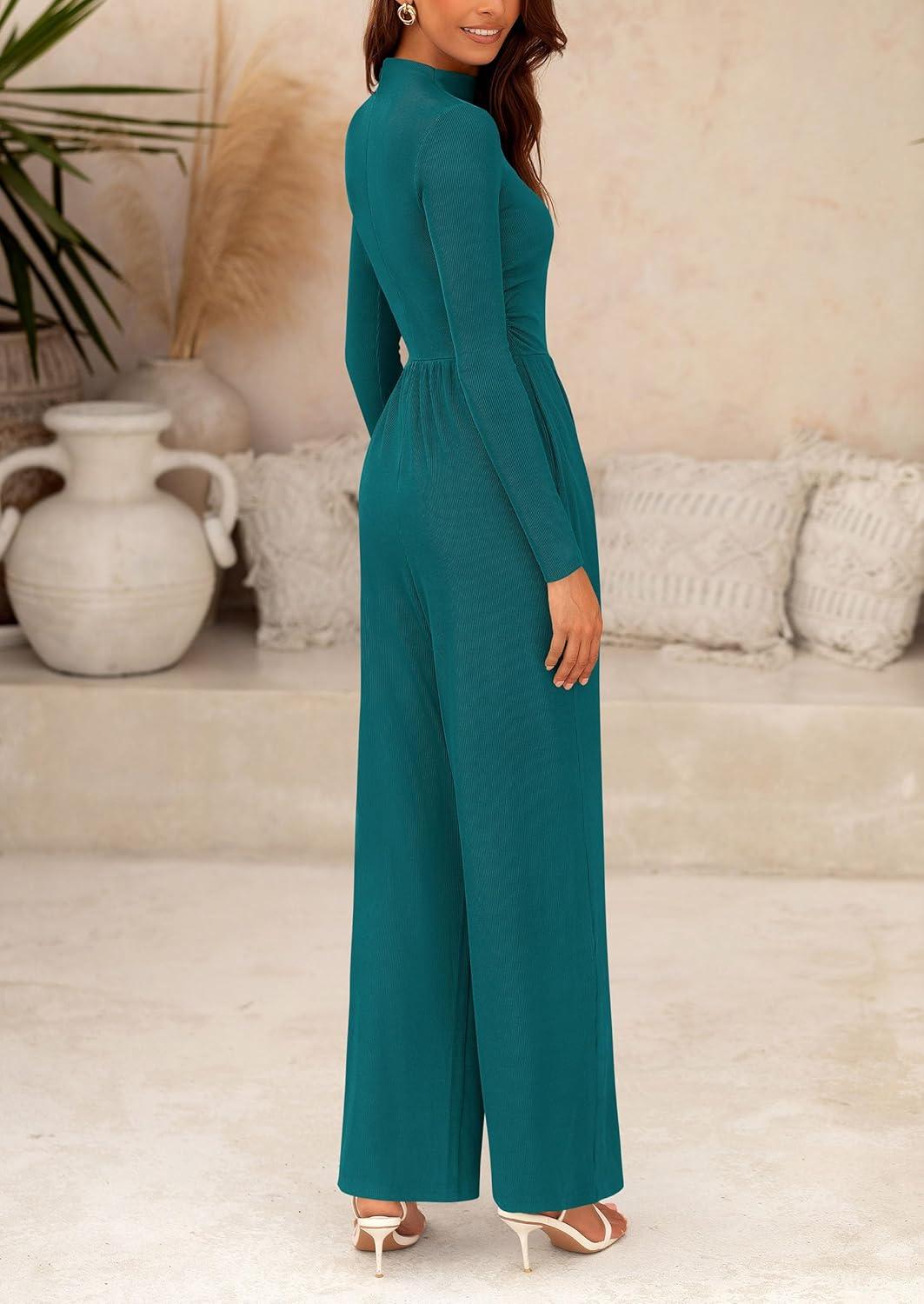 PRETTYGARDEN Jumpsuits For Women Dressy Fall Fashion Clothing 2025 Long Sleeve Mock Neck Date Night Rompers Business Outfits(Blue Green)