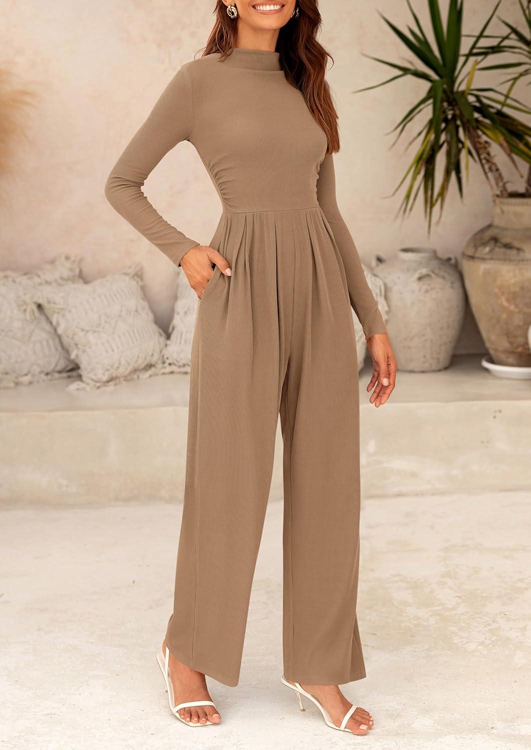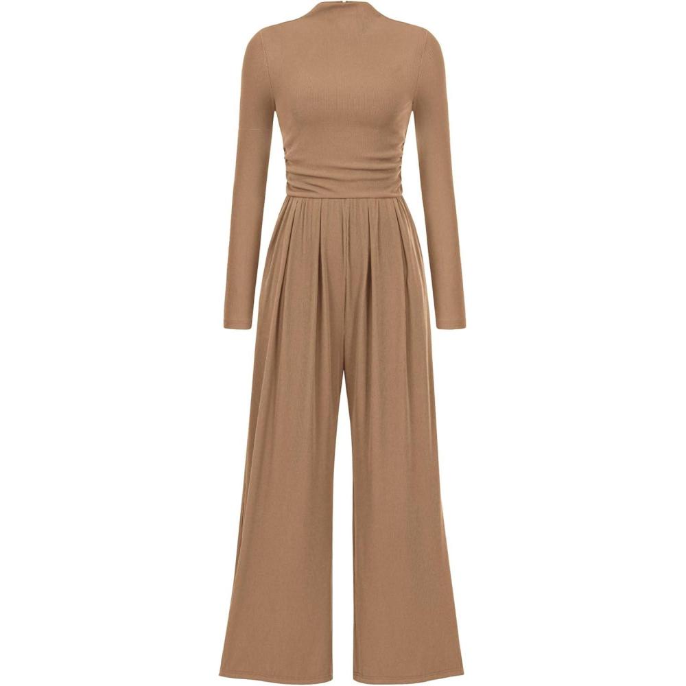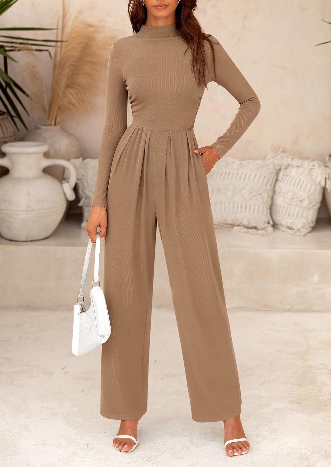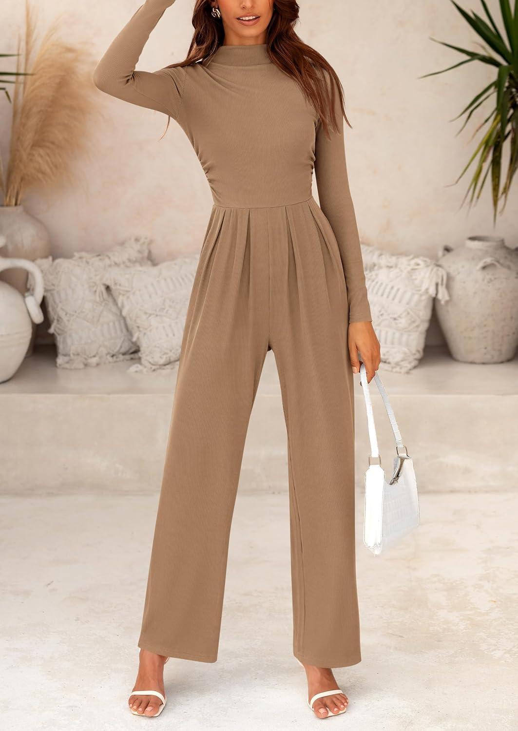 PRETTYGARDEN Jumpsuits For Women Dressy Fall Fashion Clothing 2025 Long Sleeve Mock Neck Date Night Rompers Business Outfits(Camel)