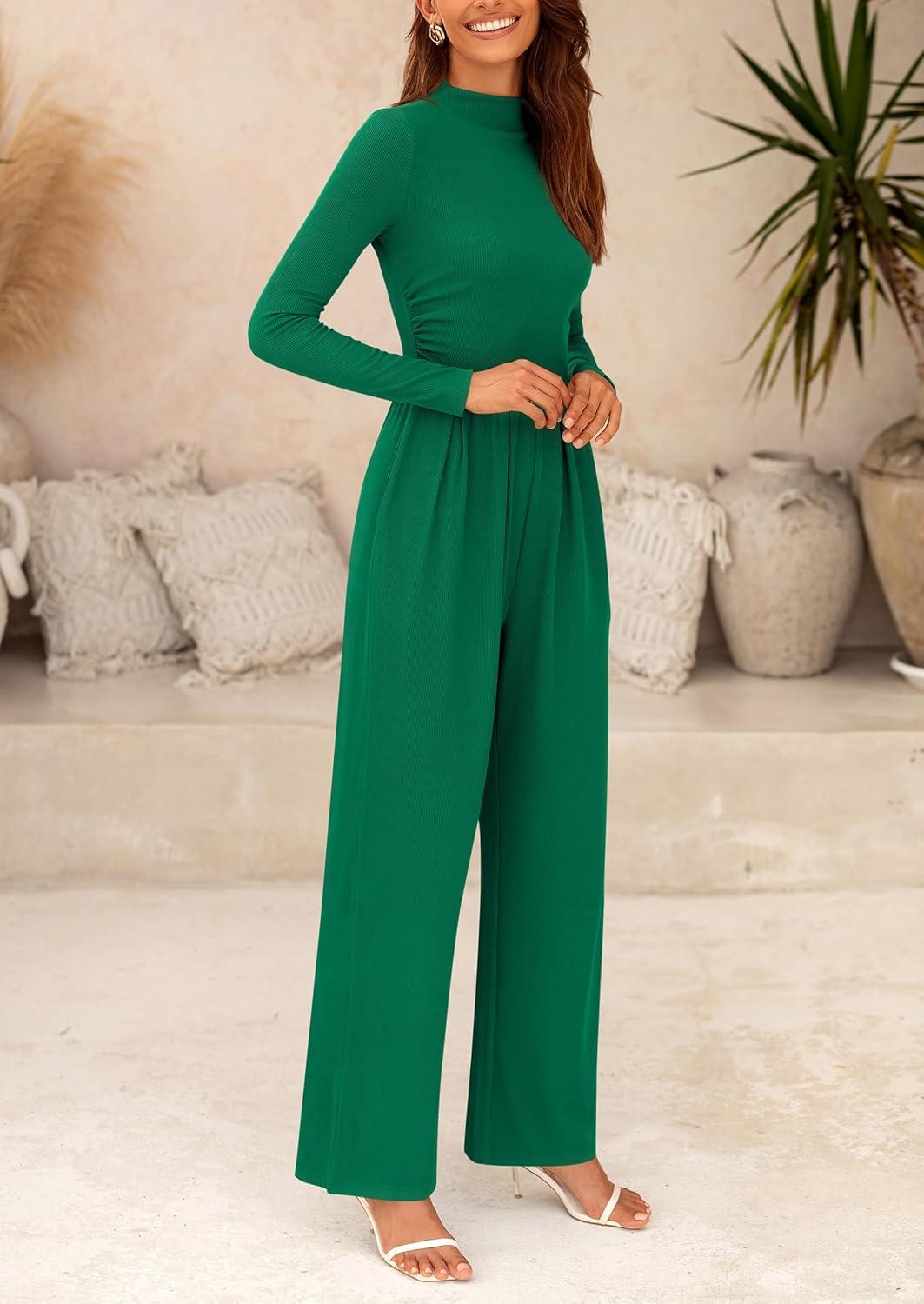 PRETTYGARDEN Jumpsuits For Women Dressy Fall Fashion Clothing 2025 Long Sleeve Mock Neck Date Night Rompers Business Outfits(Green)