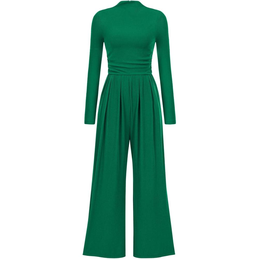 PRETTYGARDEN Jumpsuits For Women Dressy Fall Fashion Clothing 2025 Long Sleeve Mock Neck Date Night Rompers Business Outfits(Dark Green)