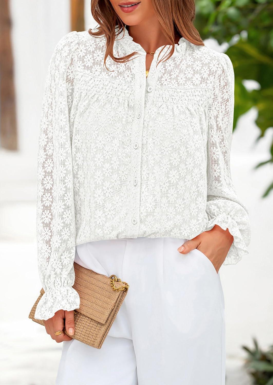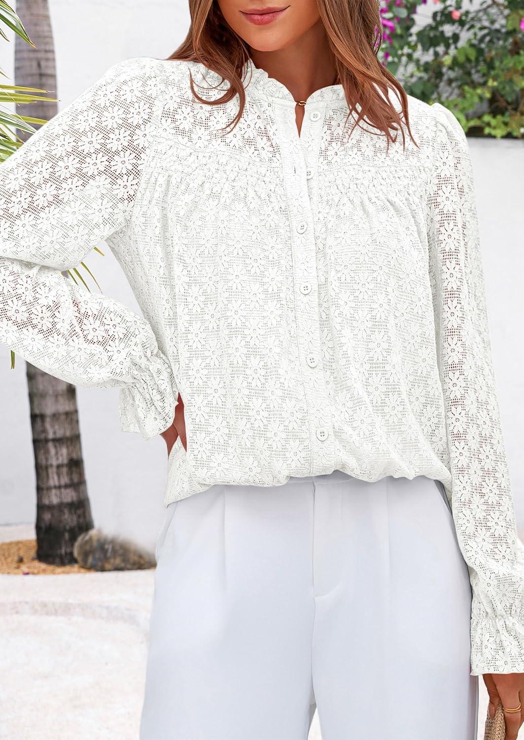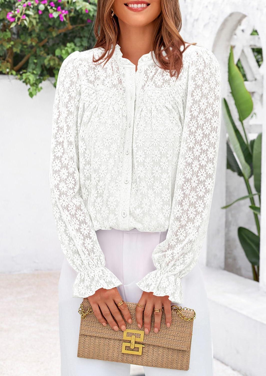 PRETTYGARDEN Lace Long Sleeve Shirts Fall Outfits for Women 2025 Casual Button Down Going Out Tops Hollow Out Eyelet Blouses(Cream White)