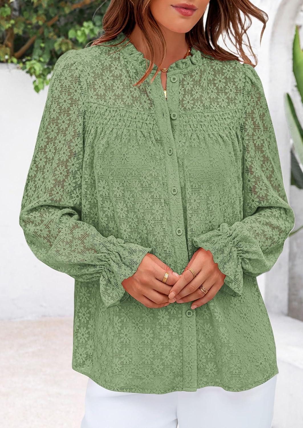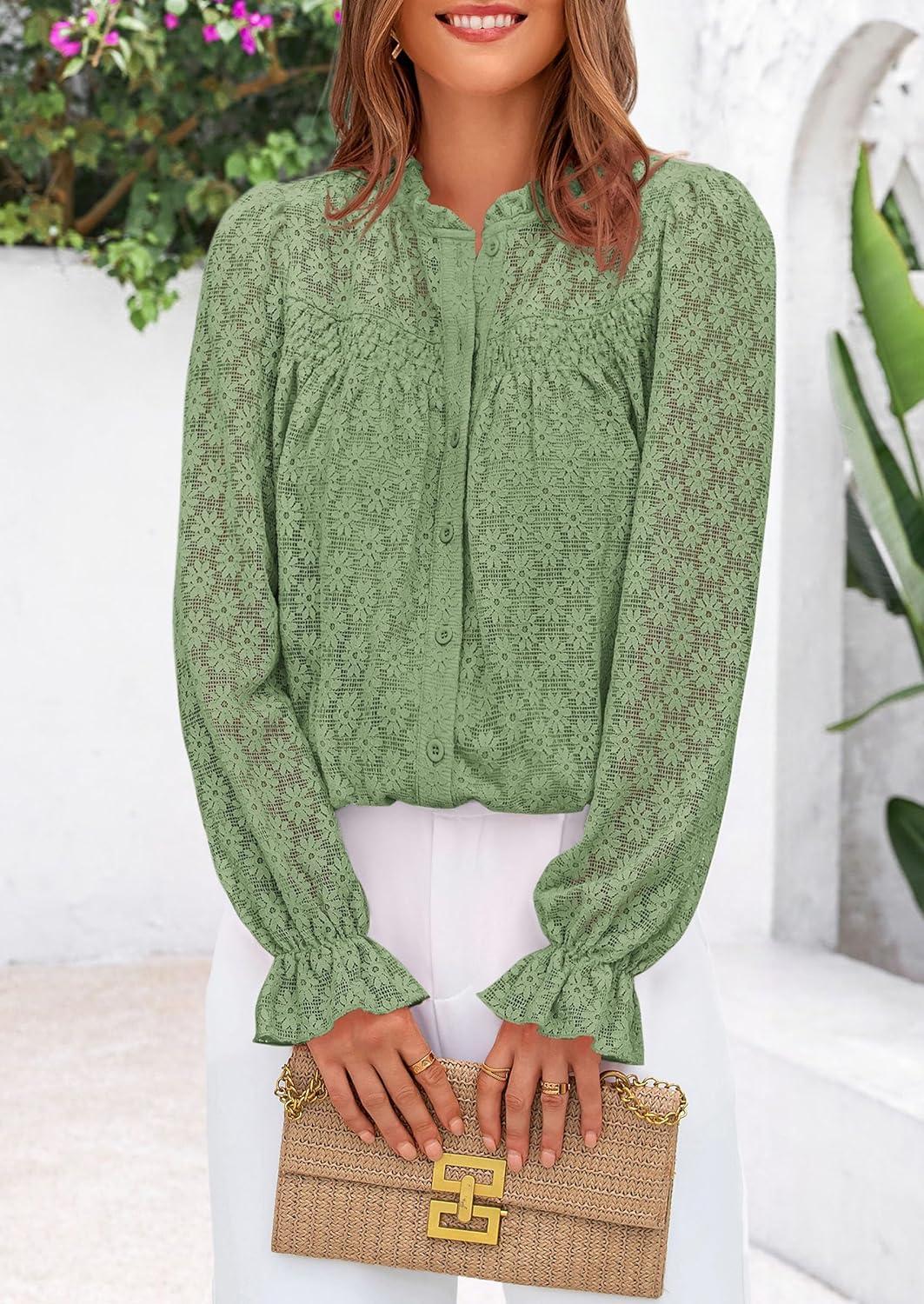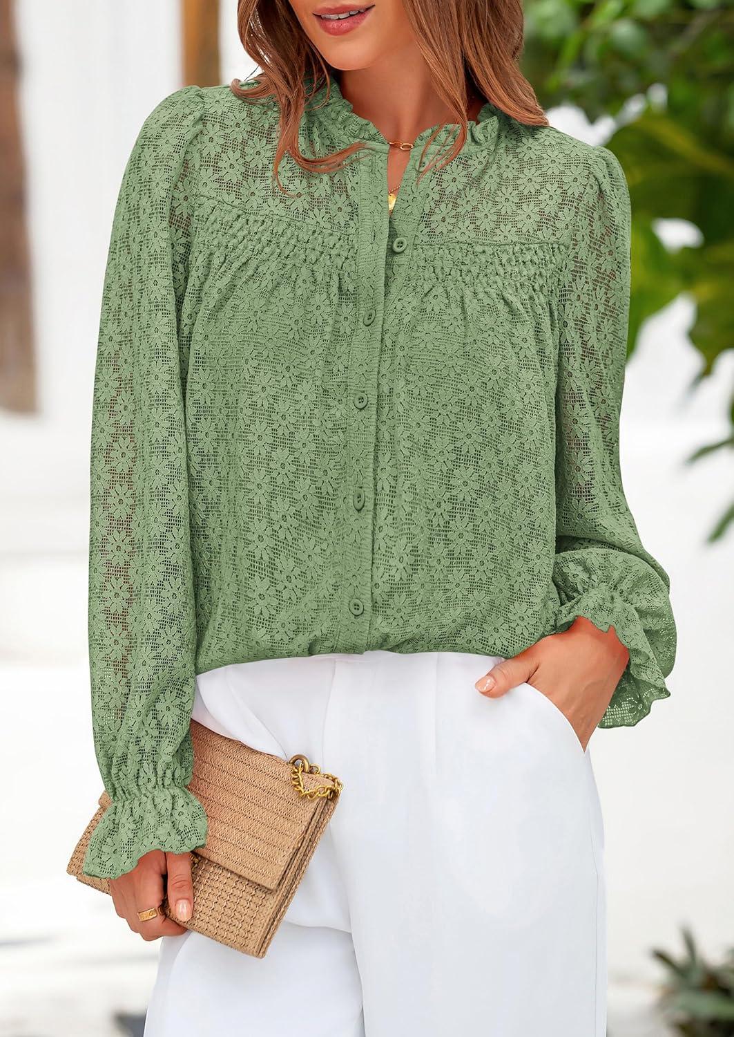 PRETTYGARDEN Lace Long Sleeve Shirts Fall Outfits for Women 2025 Casual Button Down Going Out Tops Hollow Out Eyelet Blouses(Grass Green)