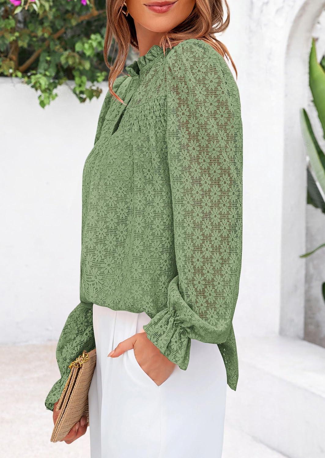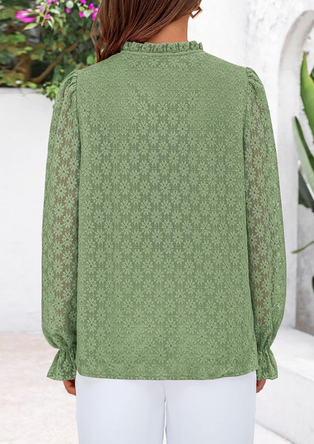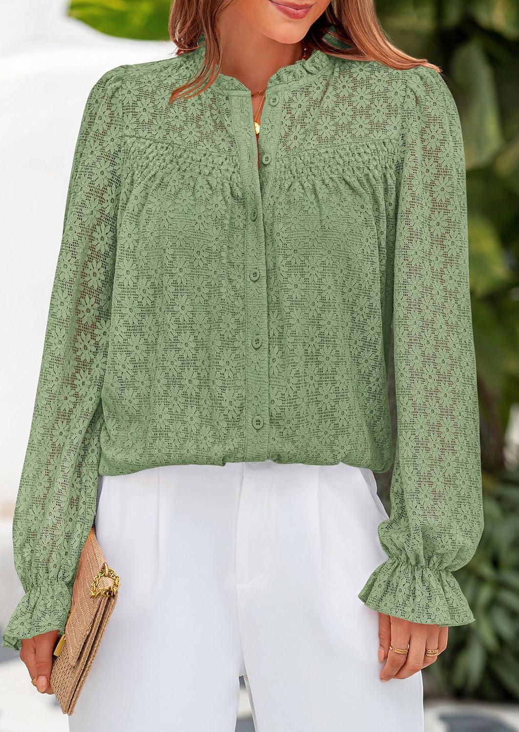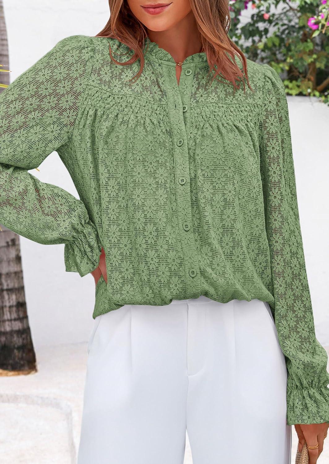 PRETTYGARDEN Lace Long Sleeve Shirts Fall Outfits for Women 2025 Casual Button Down Going Out Tops Hollow Out Eyelet Blouses(Grass Green)