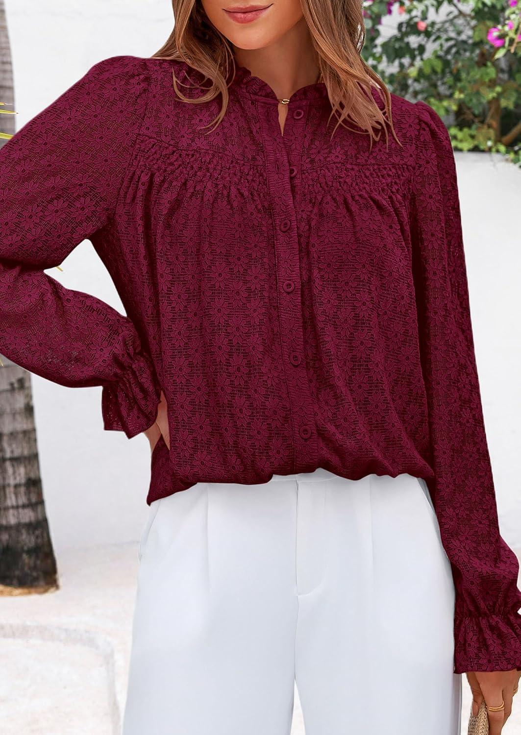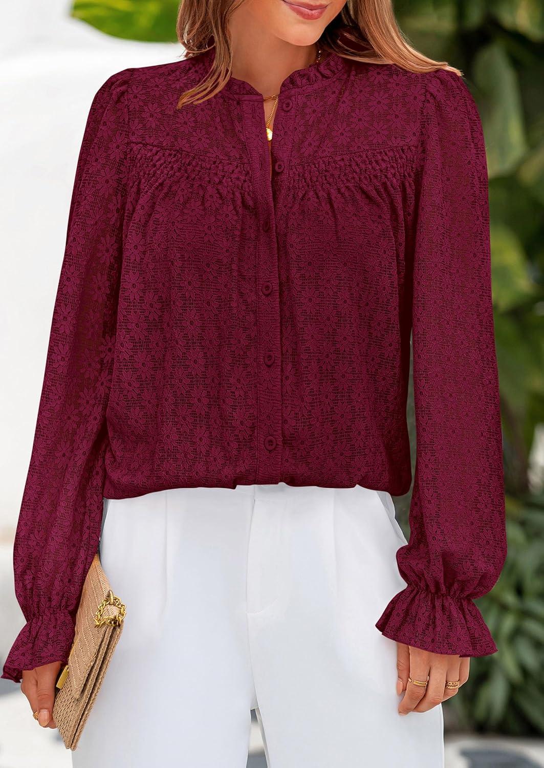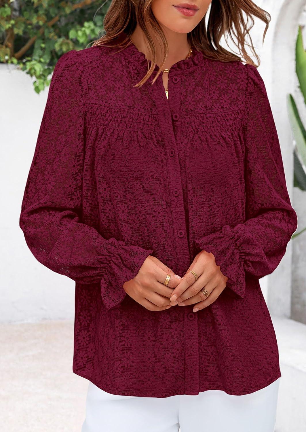 PRETTYGARDEN Lace Long Sleeve Shirts Fall Outfits for Women 2025 Casual Button Down Going Out Tops Hollow Out Eyelet Blouses(Jujube Red)