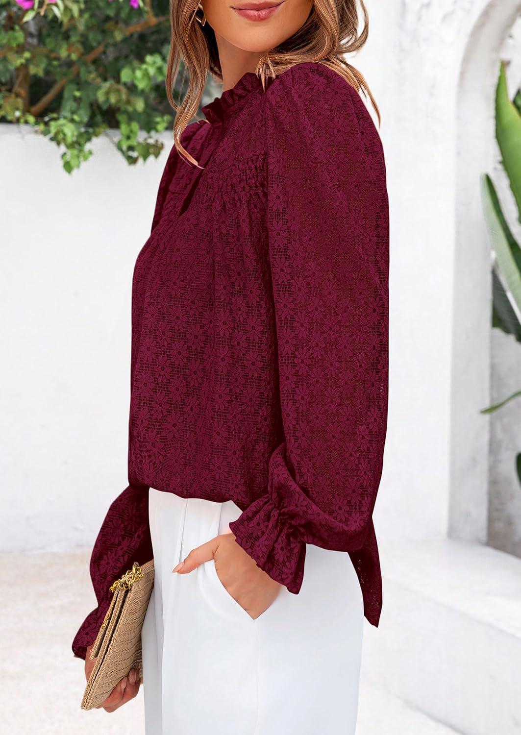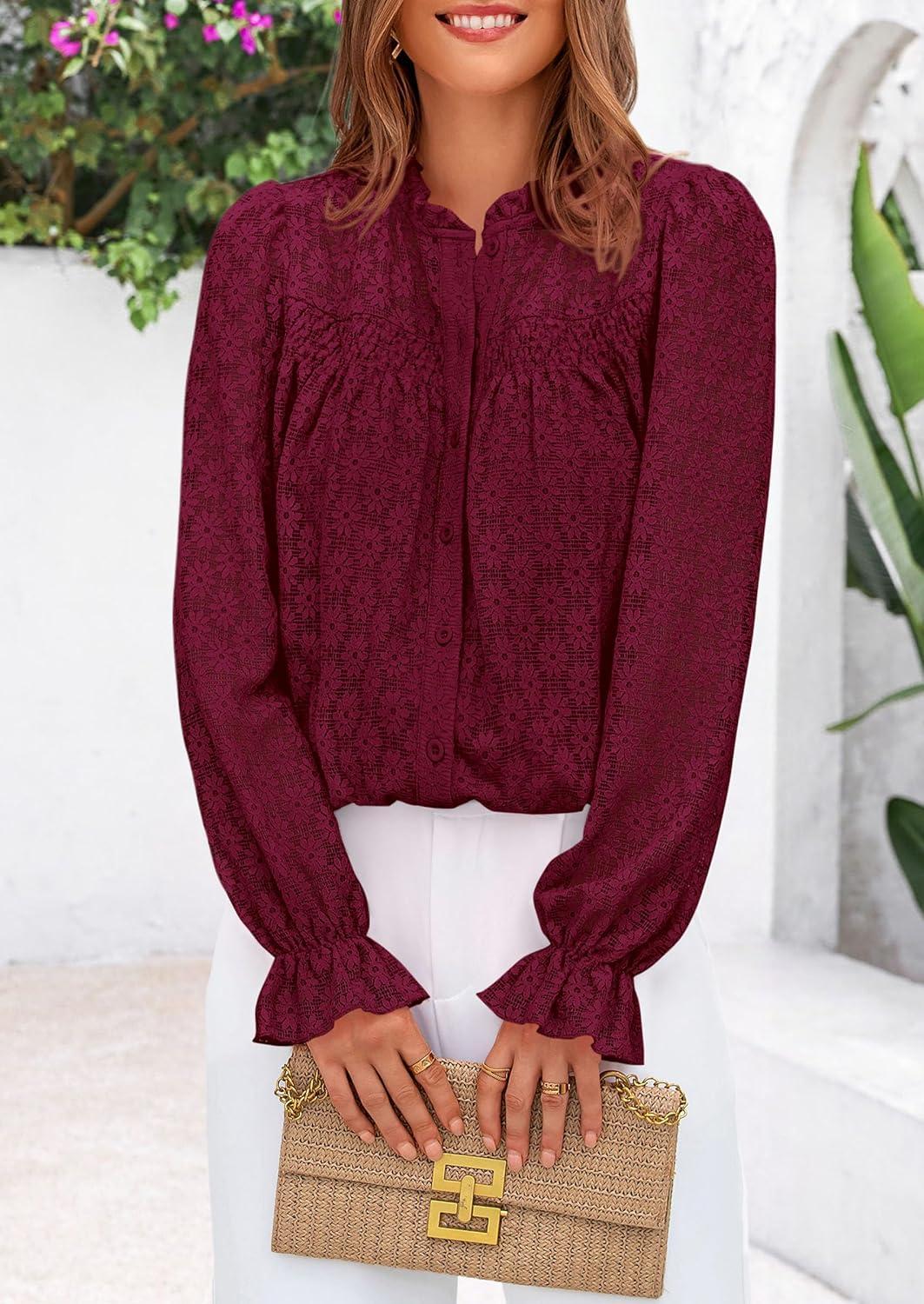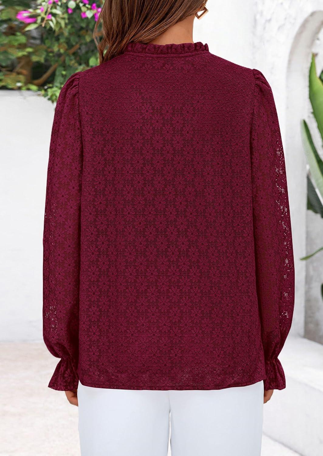 PRETTYGARDEN Lace Long Sleeve Shirts Fall Outfits for Women 2025 Casual Button Down Going Out Tops Hollow Out Eyelet Blouses(Jujube Red)