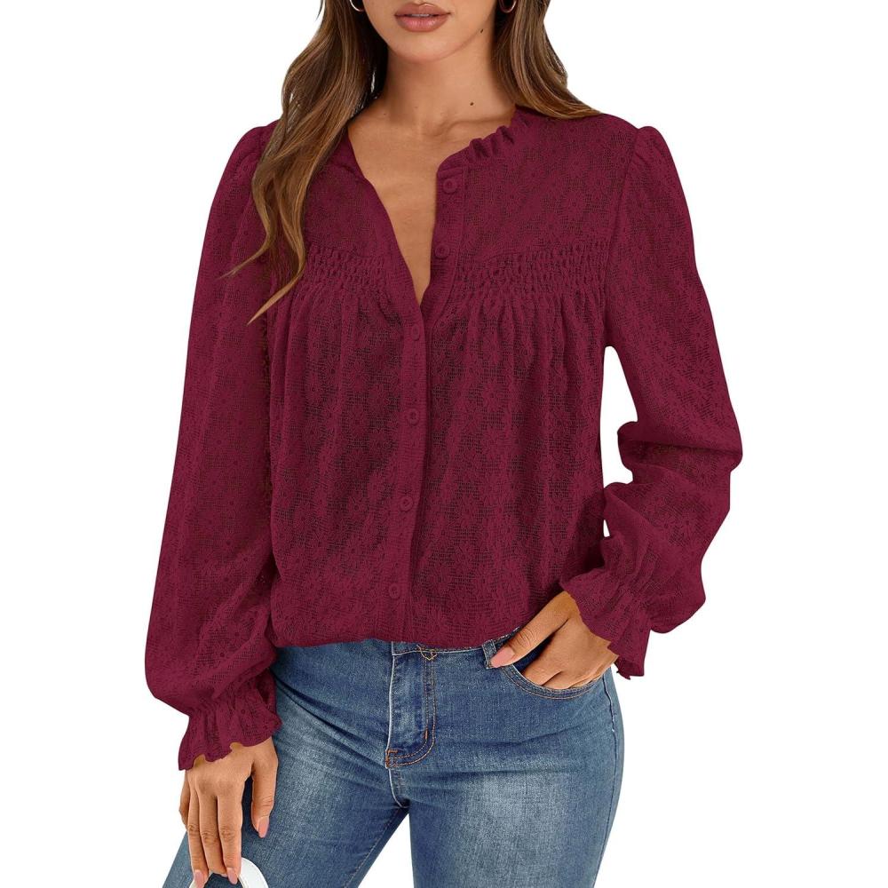imagePRETTYGARDEN Lace Long Sleeve Shirts Fall Outfits for Women 2025 Casual Button Down Going Out Tops Hollow Out Eyelet BlousesJujube Red
