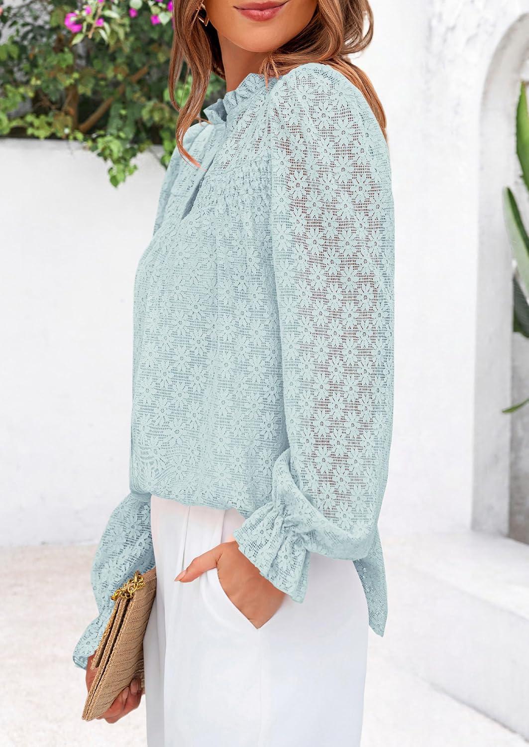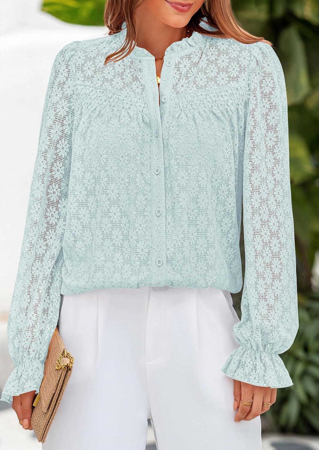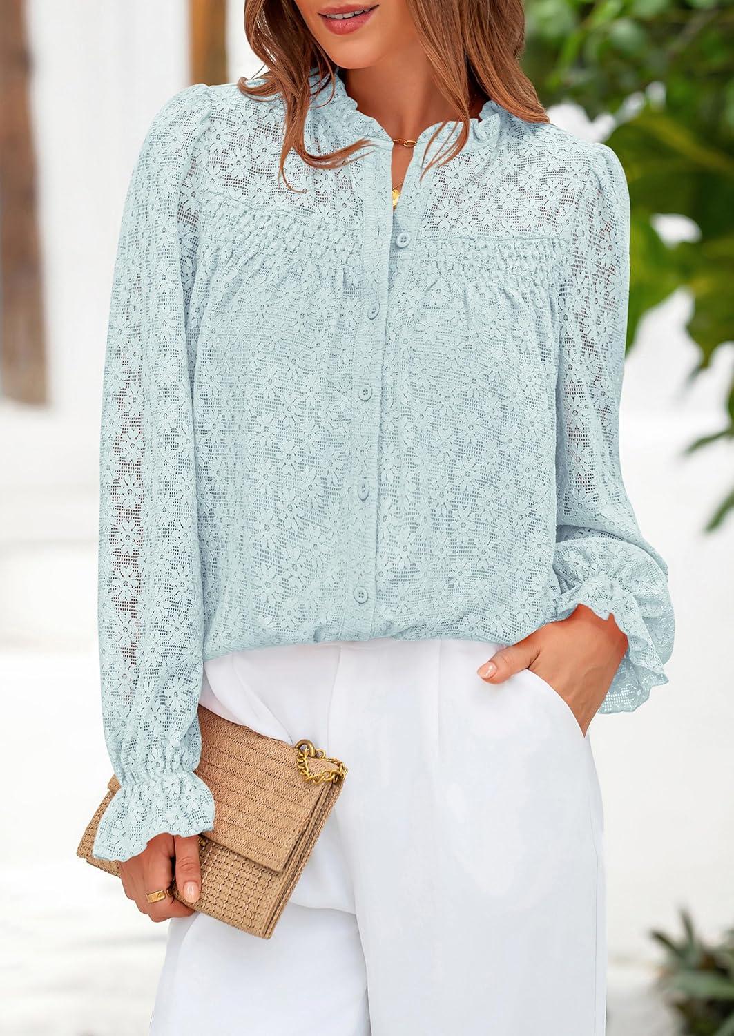 PRETTYGARDEN Lace Long Sleeve Shirts Fall Outfits for Women 2025 Casual Button Down Going Out Tops Hollow Out Eyelet Blouses(Light Blue)