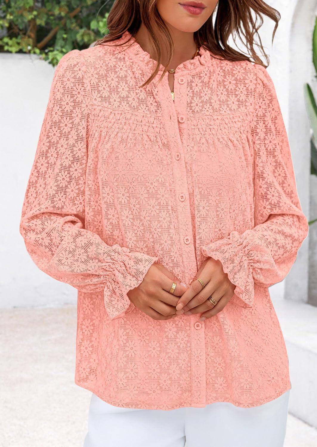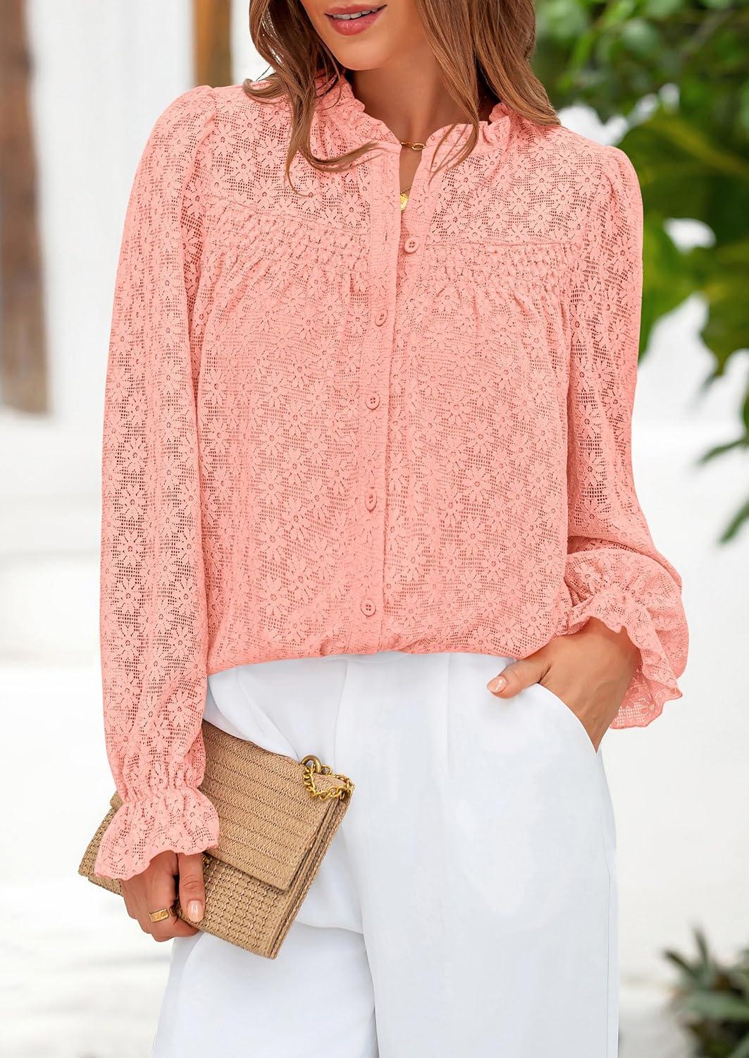 PRETTYGARDEN Lace Long Sleeve Shirts Fall Outfits for Women 2025 Casual Button Down Going Out Tops Hollow Out Eyelet Blouses(Pink)
