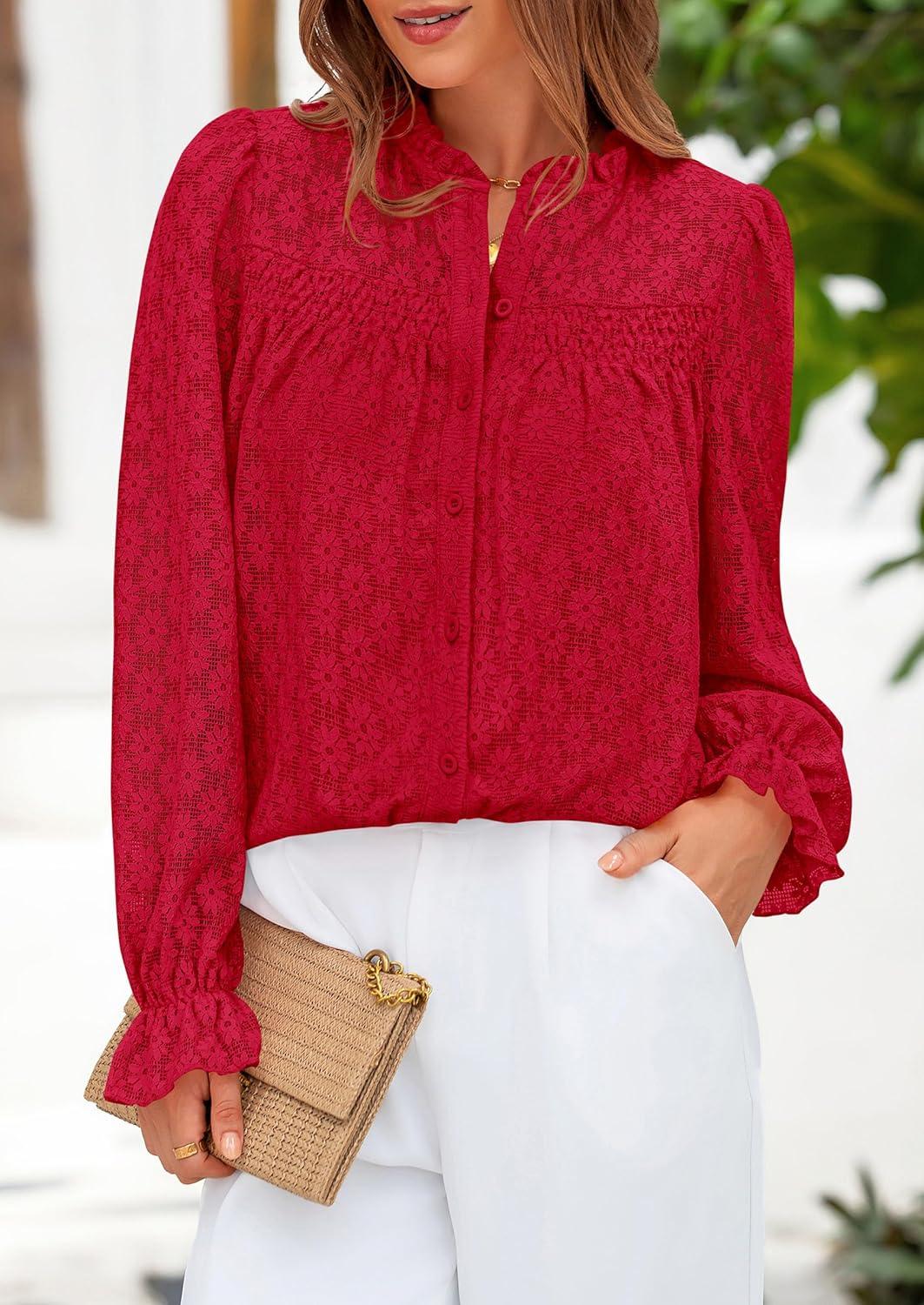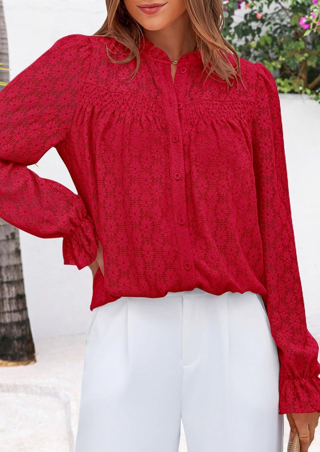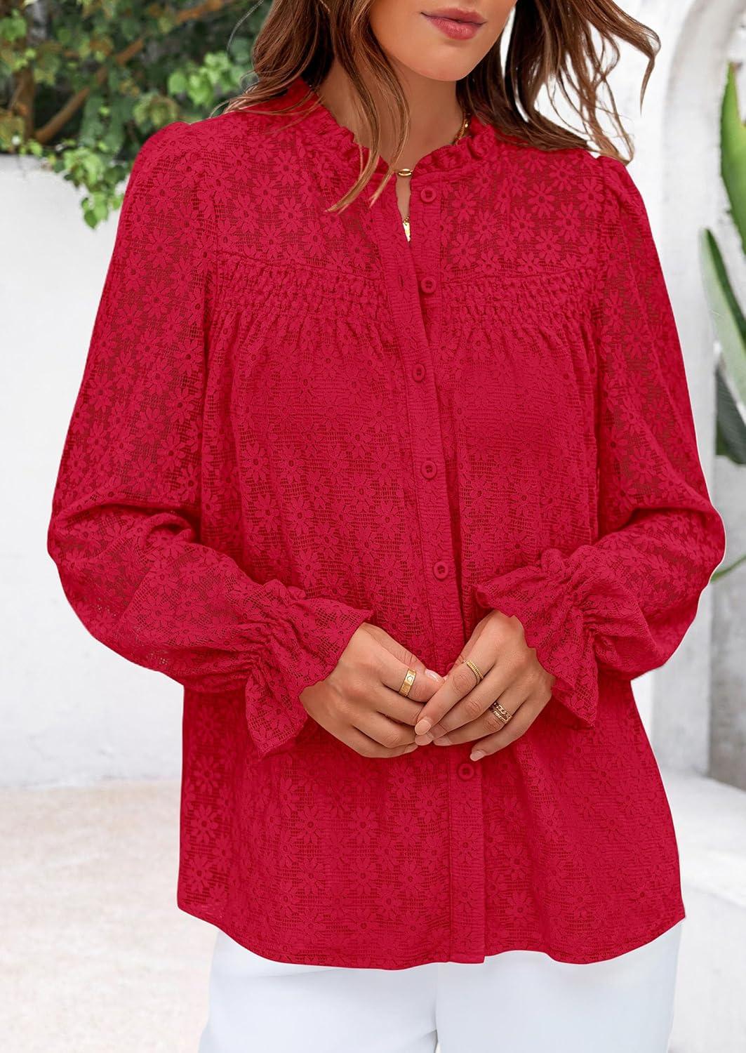 PRETTYGARDEN Lace Long Sleeve Shirts Fall Outfits for Women 2025 Casual Button Down Going Out Tops Hollow Out Eyelet Blouses(Red)