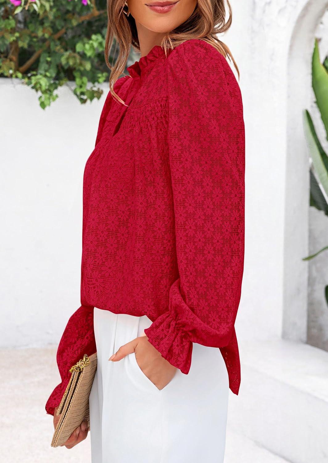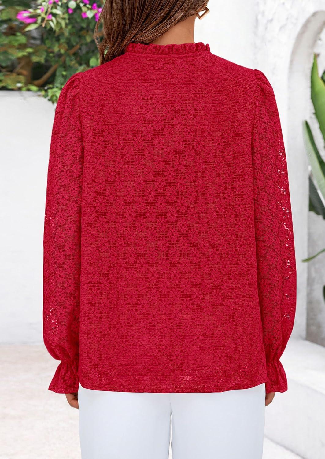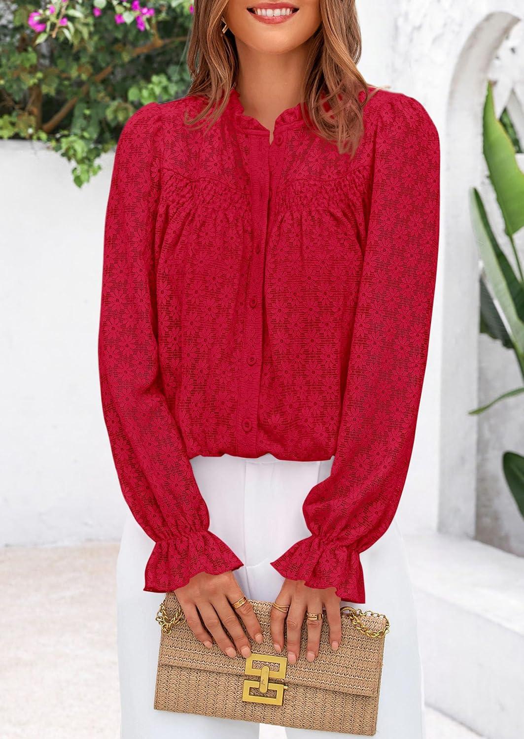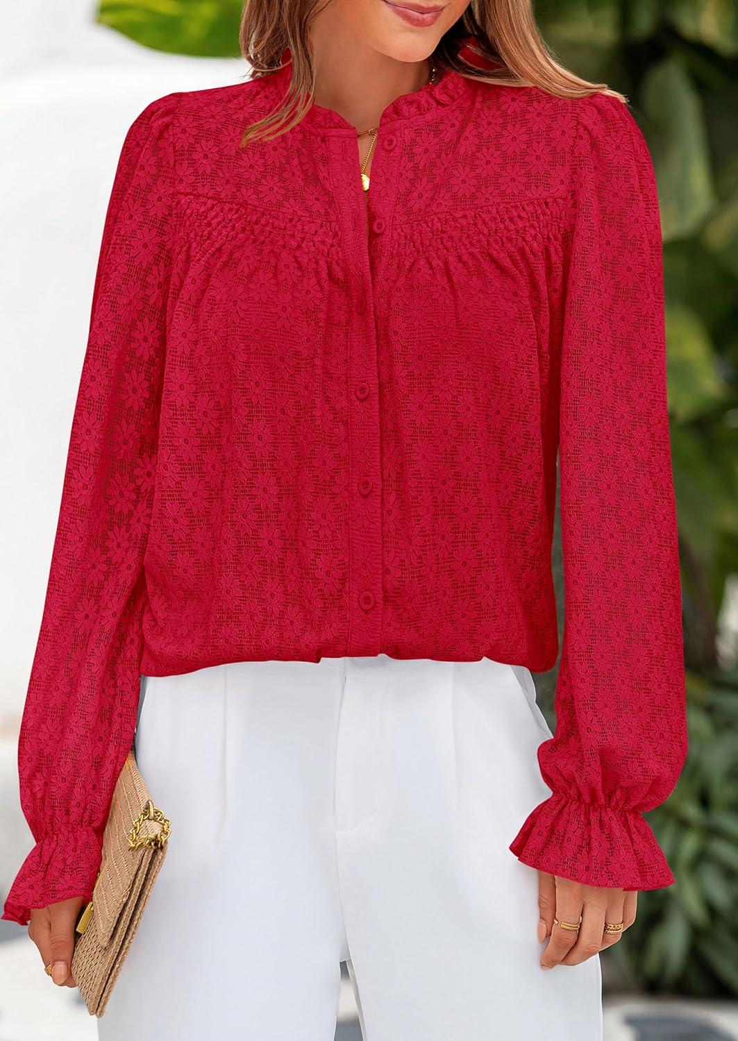 PRETTYGARDEN Lace Long Sleeve Shirts Fall Outfits for Women 2025 Casual Button Down Going Out Tops Hollow Out Eyelet Blouses(Red)
