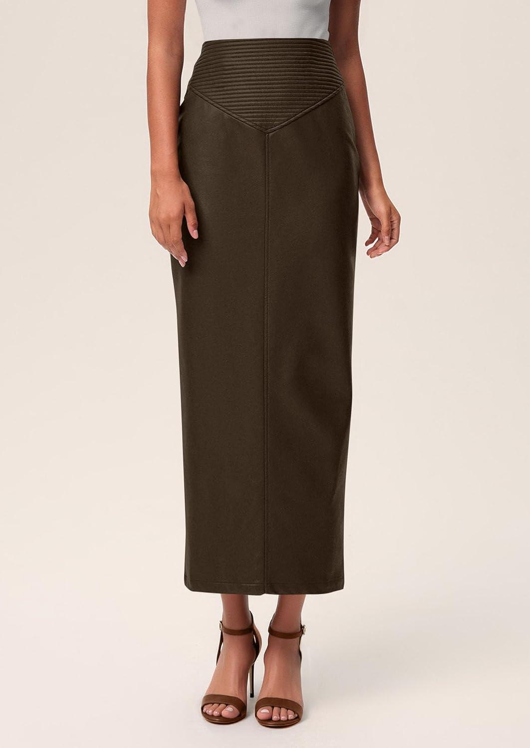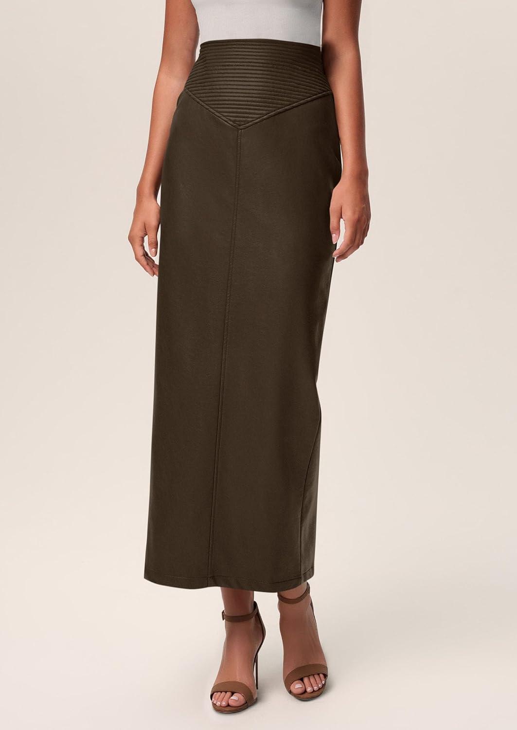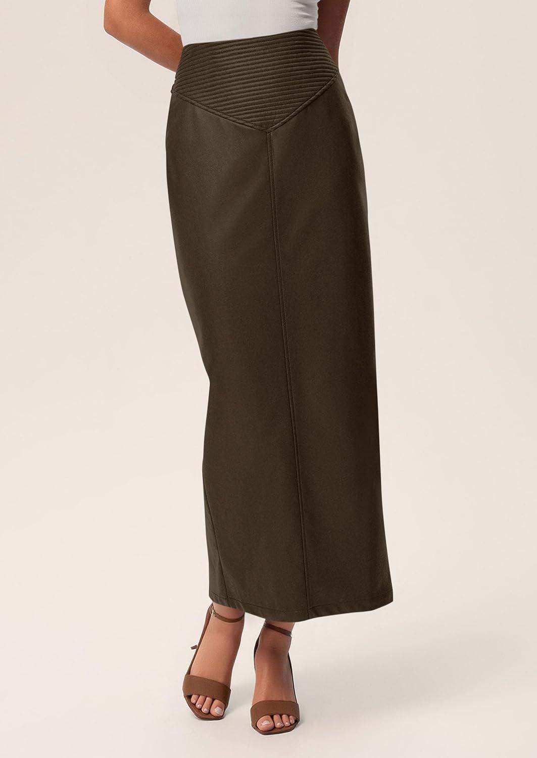 PRETTYGARDEN Long Skirts for Women 2025 Fall Fashion Clothing Faux Leather High Waist Dressy Casual Slit Pencil Maxi Skirt(Coffee)