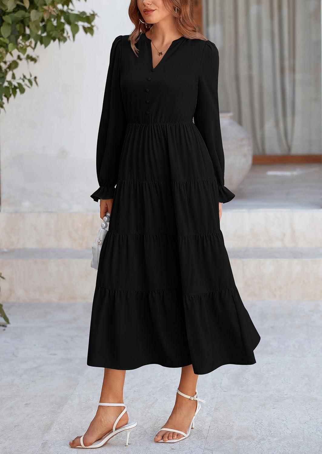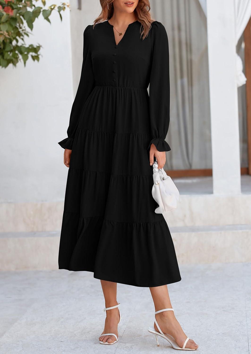 PRETTYGARDEN Long Sleeve Dress for Women 2025 Fall V Neck Tiered Aline Spring Elegant Modest Flowy Wedding Guest Maxi Dresses(Black)