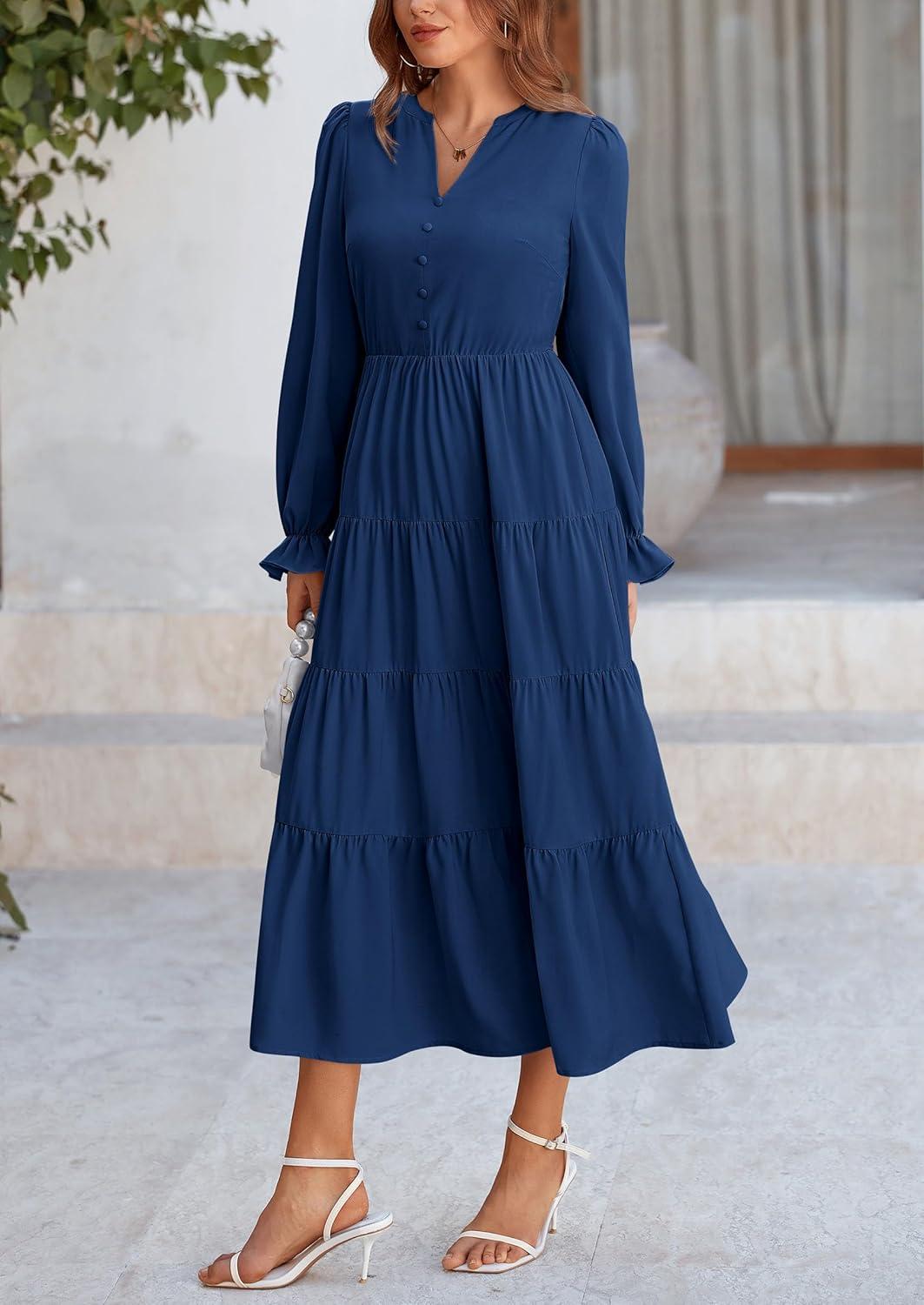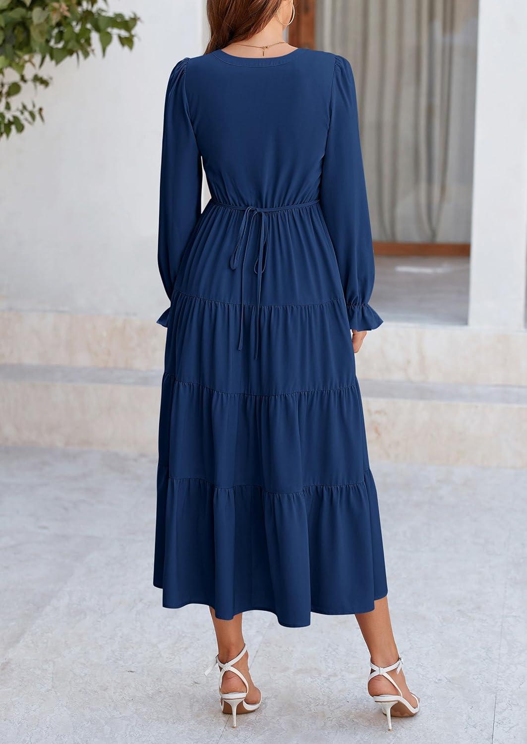 PRETTYGARDEN Long Sleeve Dress for Women 2025 Fall V Neck Tiered Aline Spring Elegant Modest Flowy Wedding Guest Maxi Dresses(Dark Blue)