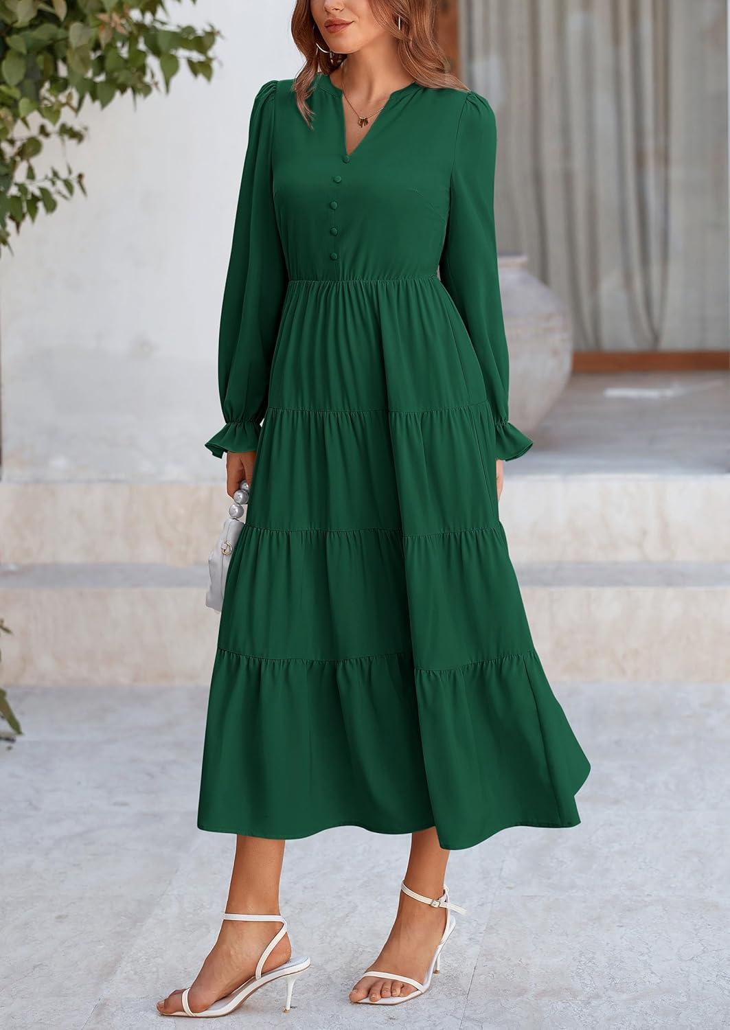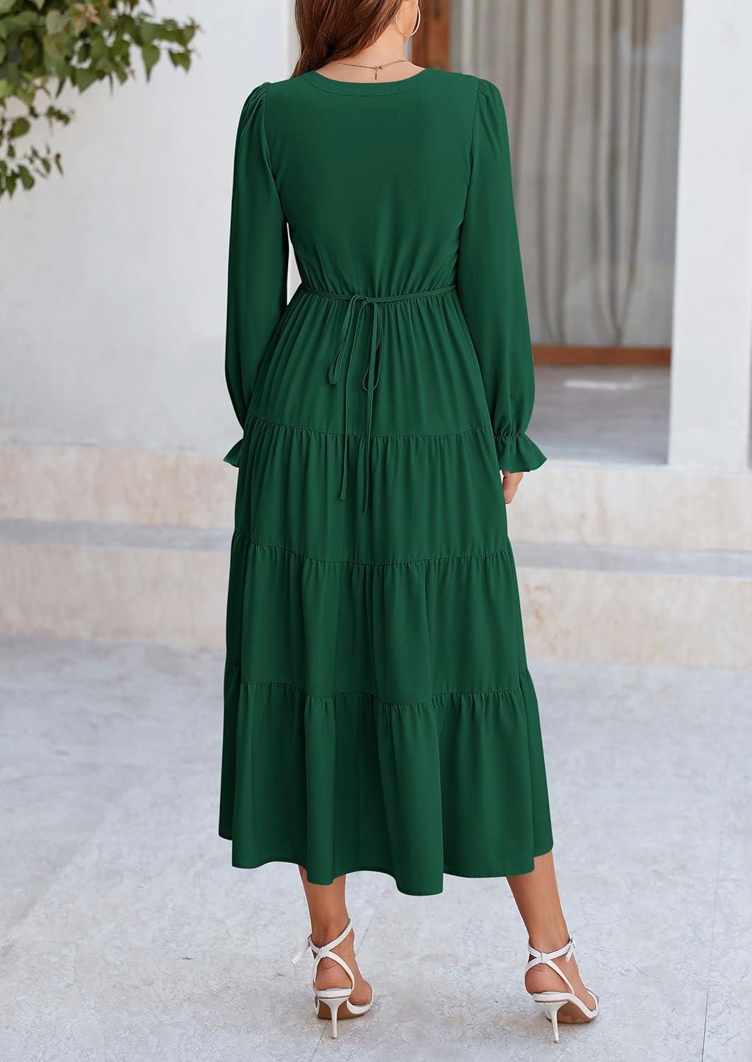 PRETTYGARDEN Long Sleeve Dress for Women 2025 Fall V Neck Tiered Aline Spring Elegant Modest Flowy Wedding Guest Maxi Dresses(Dark Green)