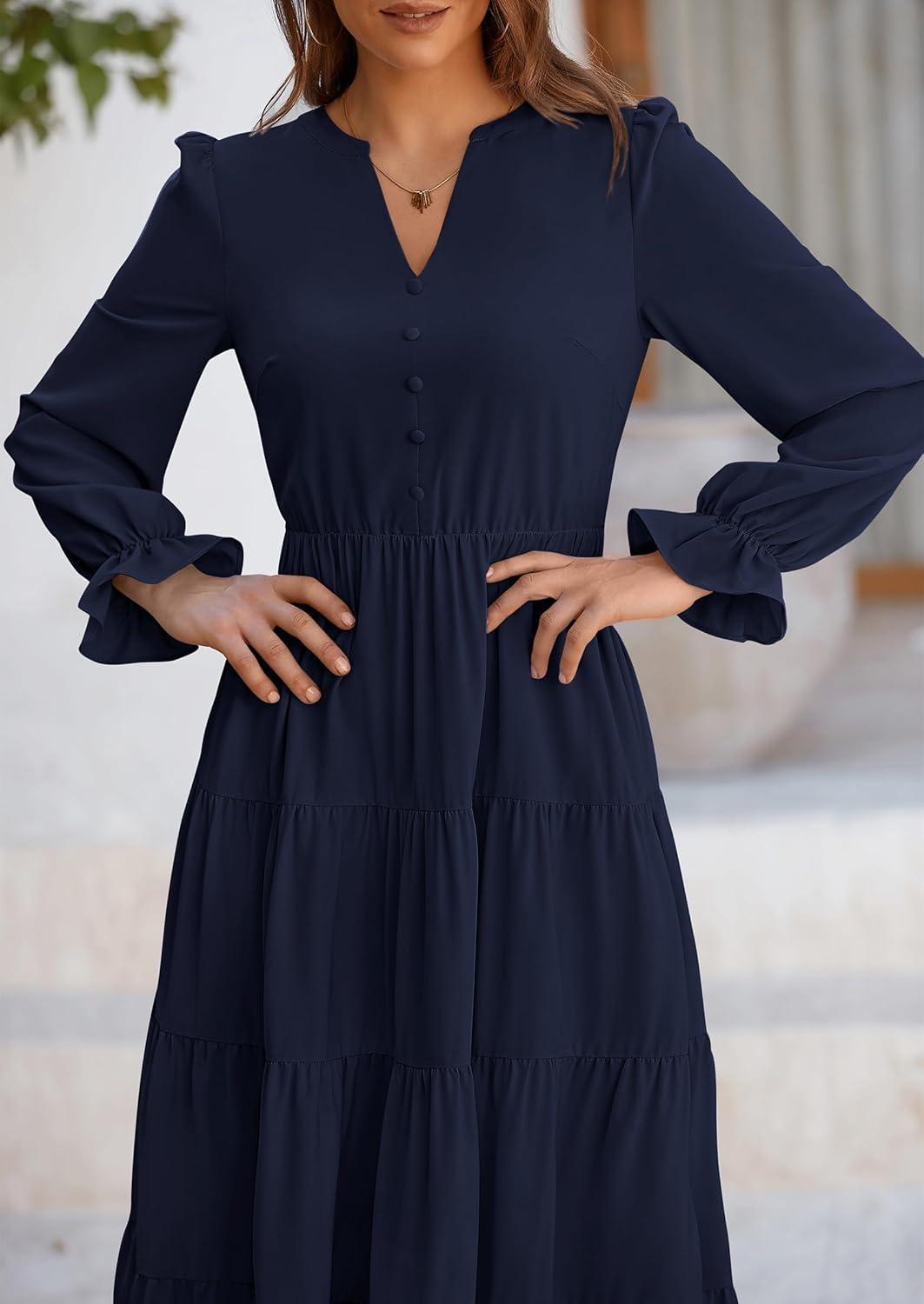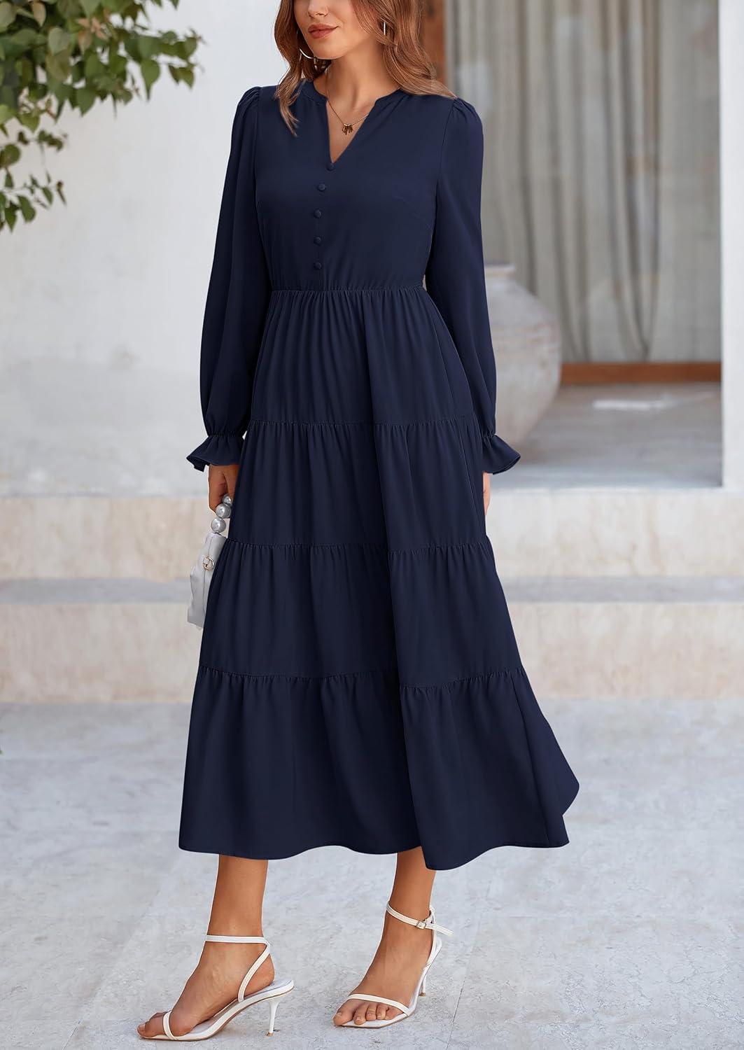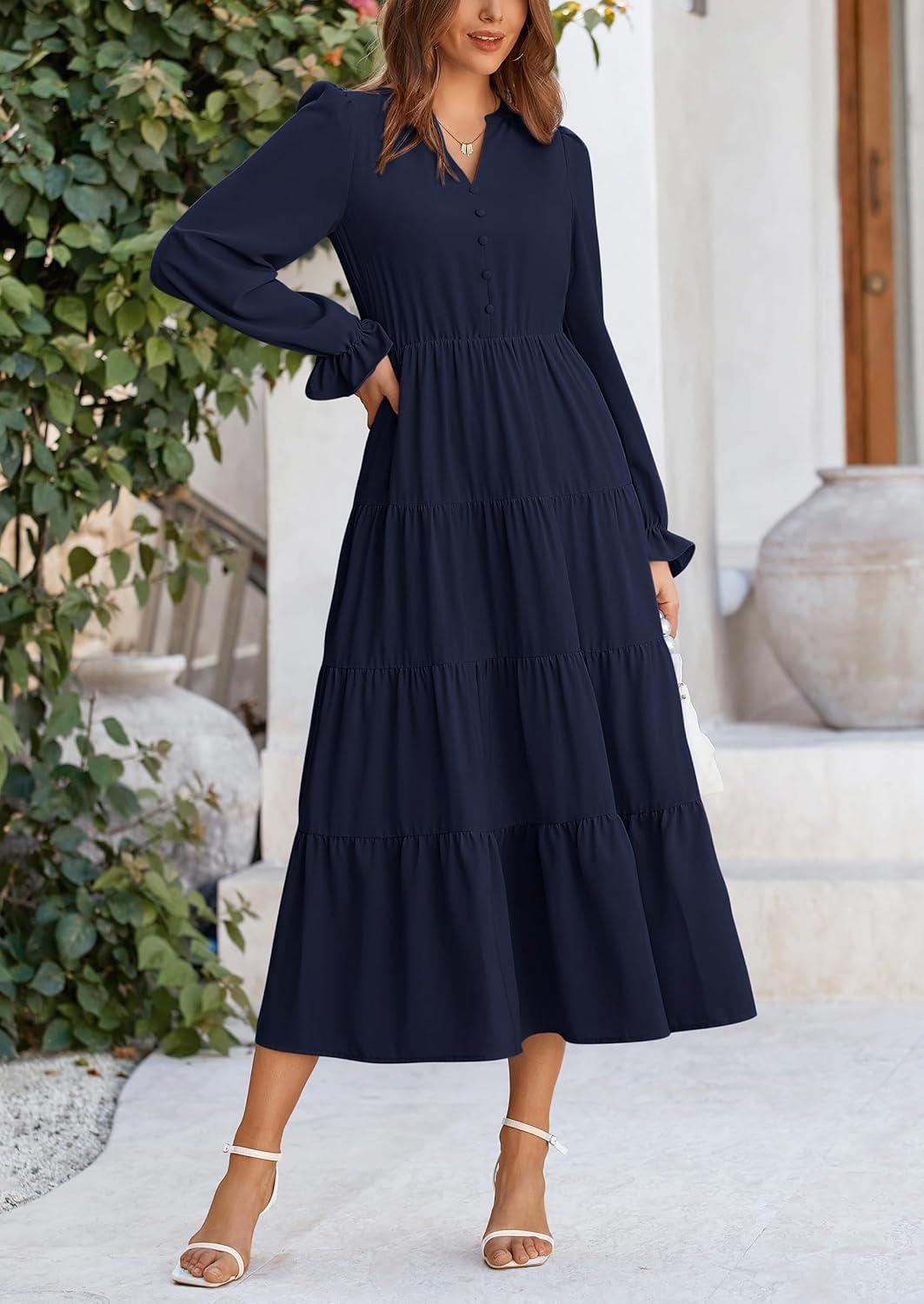 PRETTYGARDEN Long Sleeve Dress for Women 2025 Fall V Neck Tiered Aline Spring Elegant Modest Flowy Wedding Guest Maxi Dresses(Navy)