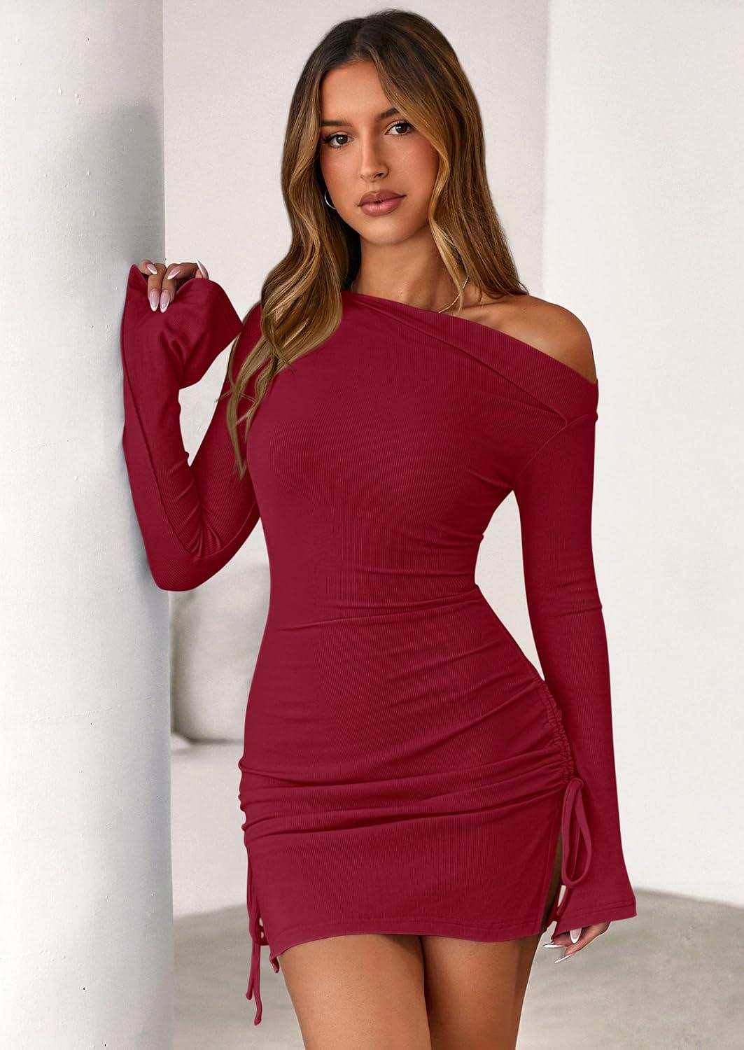 PRETTYGARDEN Long Sleeve Dress for Women Early Fall Fashion 2025 Cocktail Party Bodycon Off The Shoulder Mini Ruched Dresses(Red)