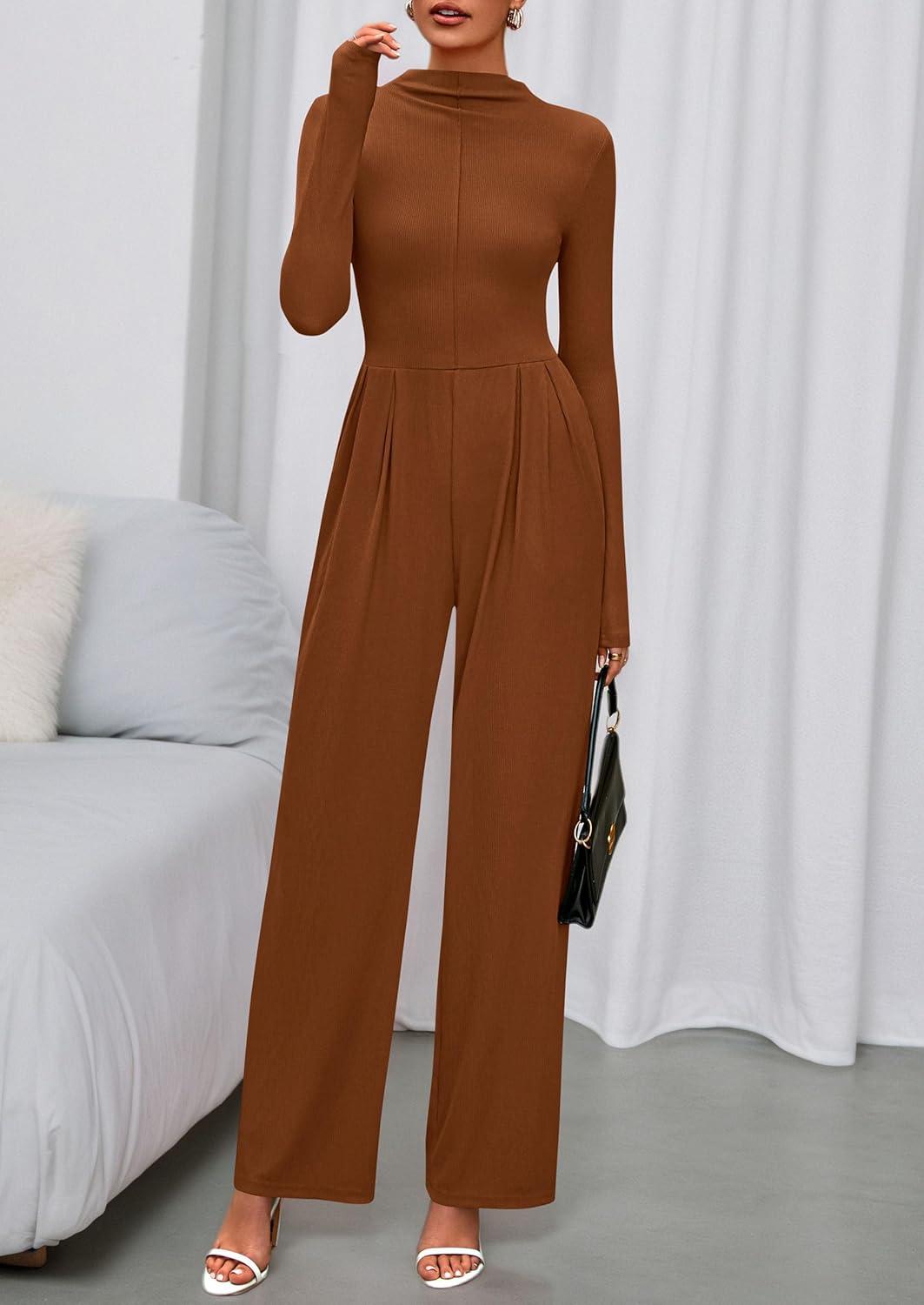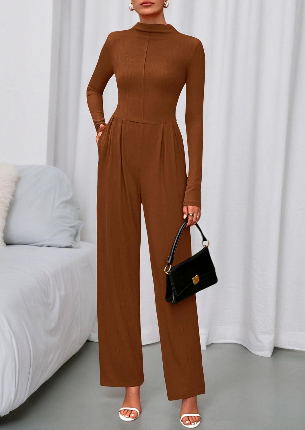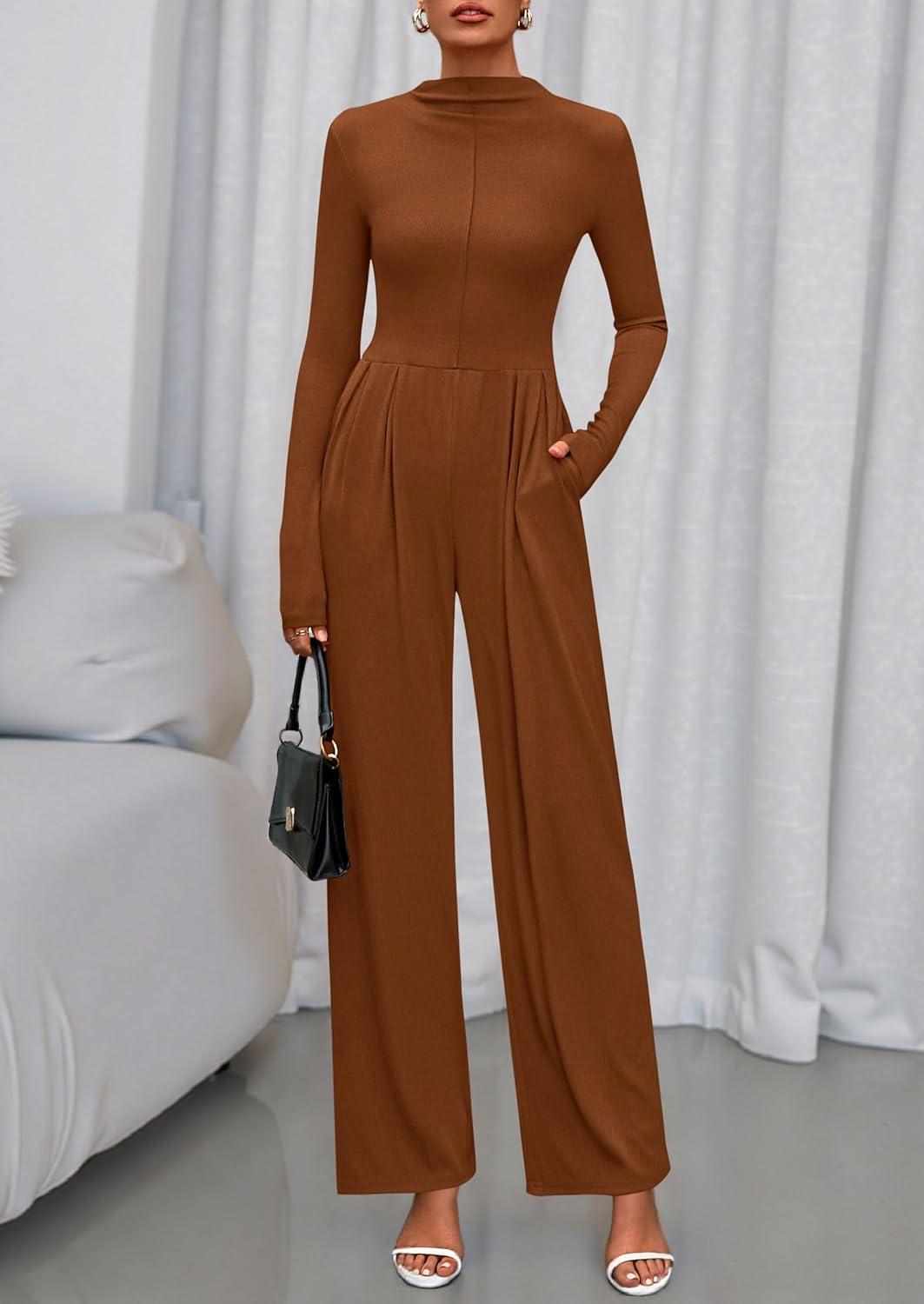PRETTYGARDEN Long Sleeve Jumpsuit for Women 2025 Fall Date Night Rompers Dressy Casual One Piece Mock Neck Jumpsuits Pockets(Brown)