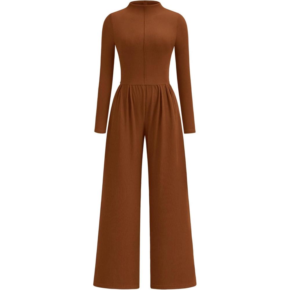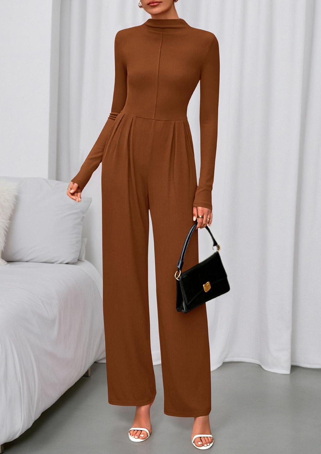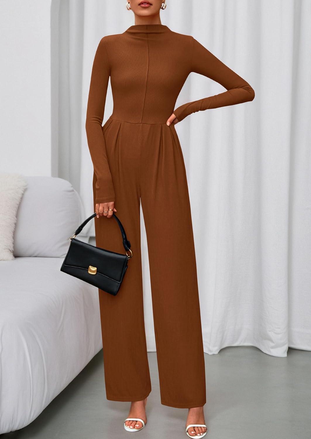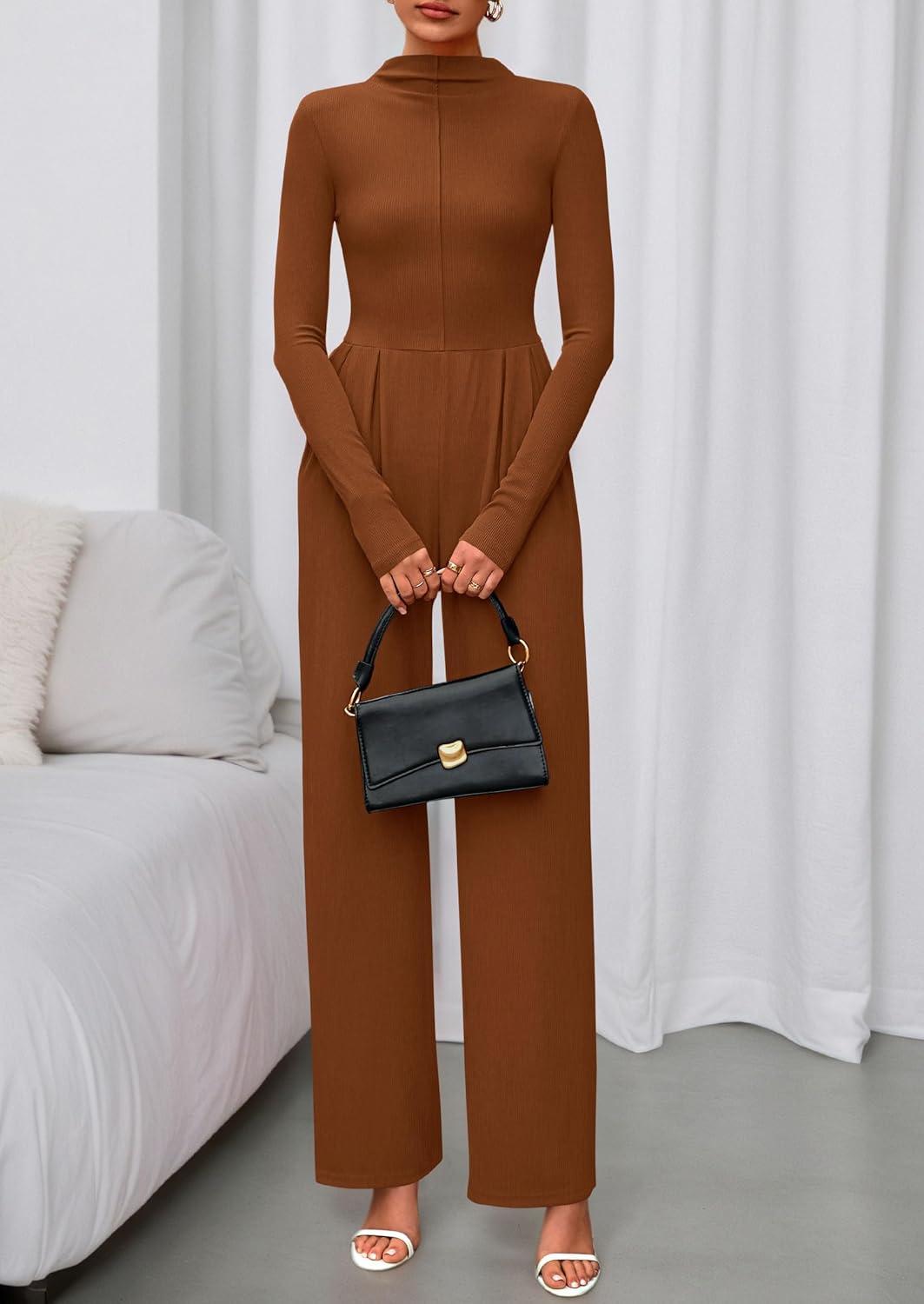 PRETTYGARDEN Long Sleeve Jumpsuit for Women 2025 Fall Date Night Rompers Dressy Casual One Piece Mock Neck Jumpsuits Pockets(Brown)