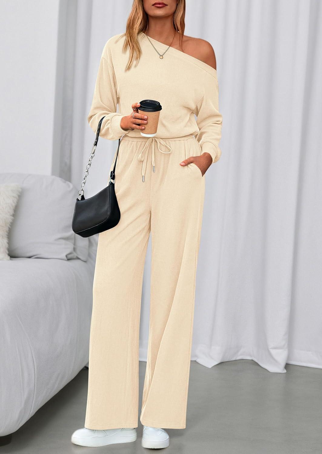 PRETTYGARDEN Long Sleeve Jumpsuit For Women Dressy 2025 Off Shoulder One Piece Loose Wide Leg Jumpsuits Casual Flowy Romper(Apricot)