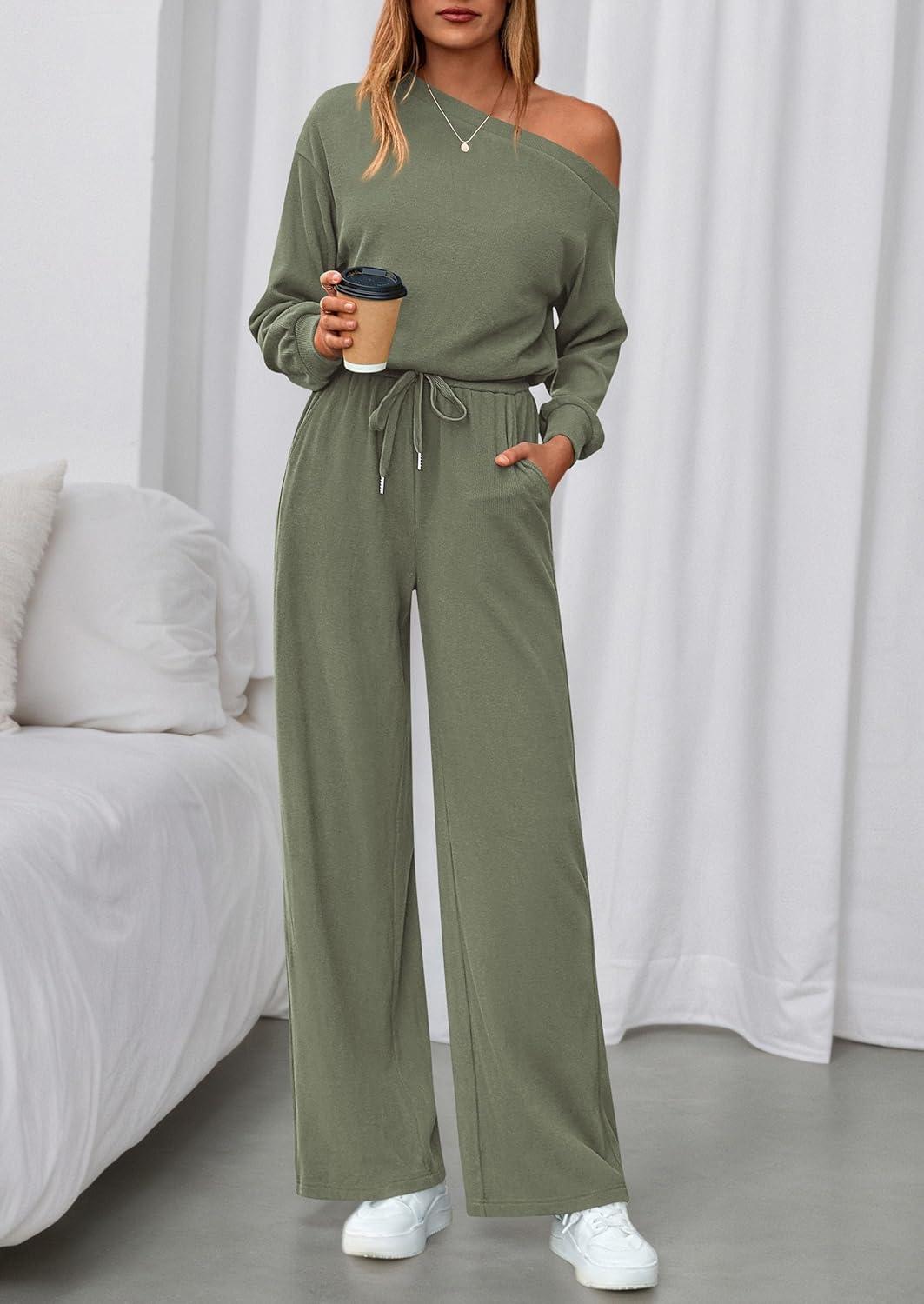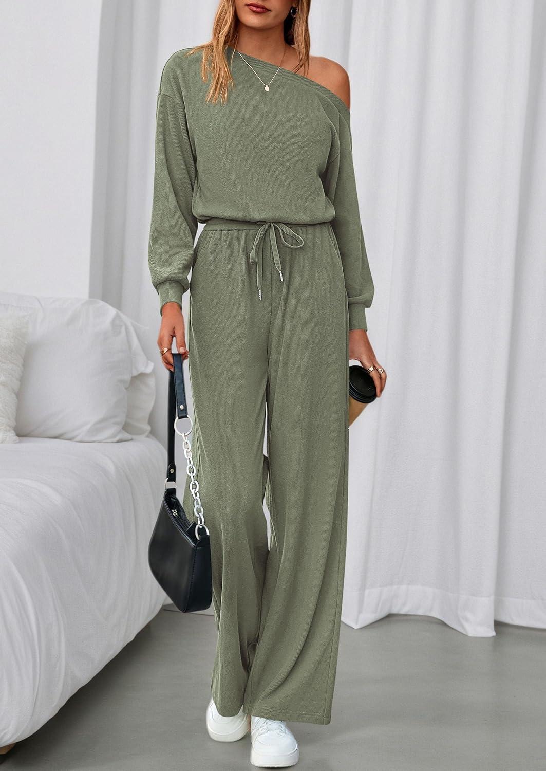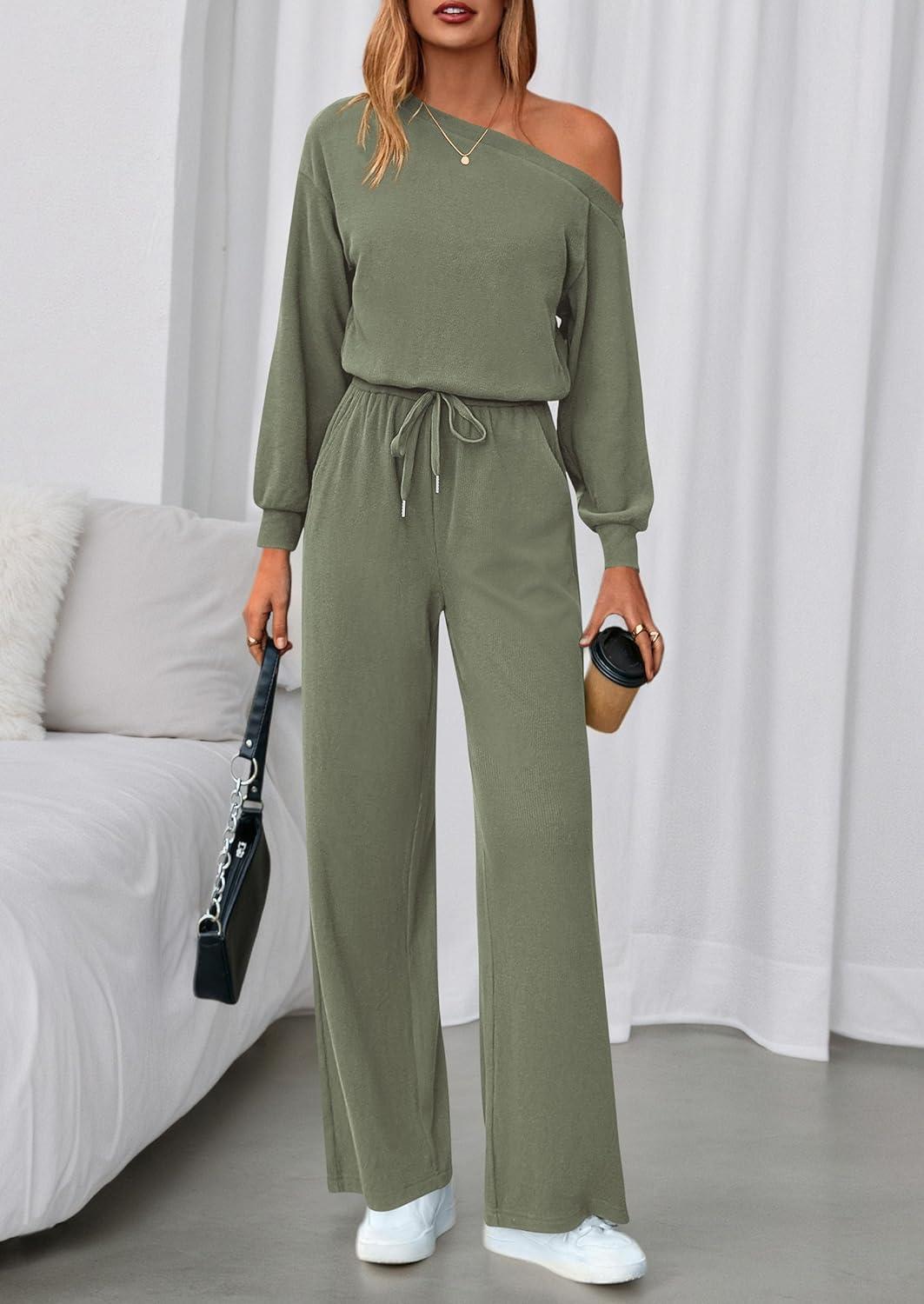PRETTYGARDEN Long Sleeve Jumpsuit For Women Dressy 2025 Off Shoulder One Piece Loose Wide Leg Jumpsuits Casual Flowy Romper(Bean Green)