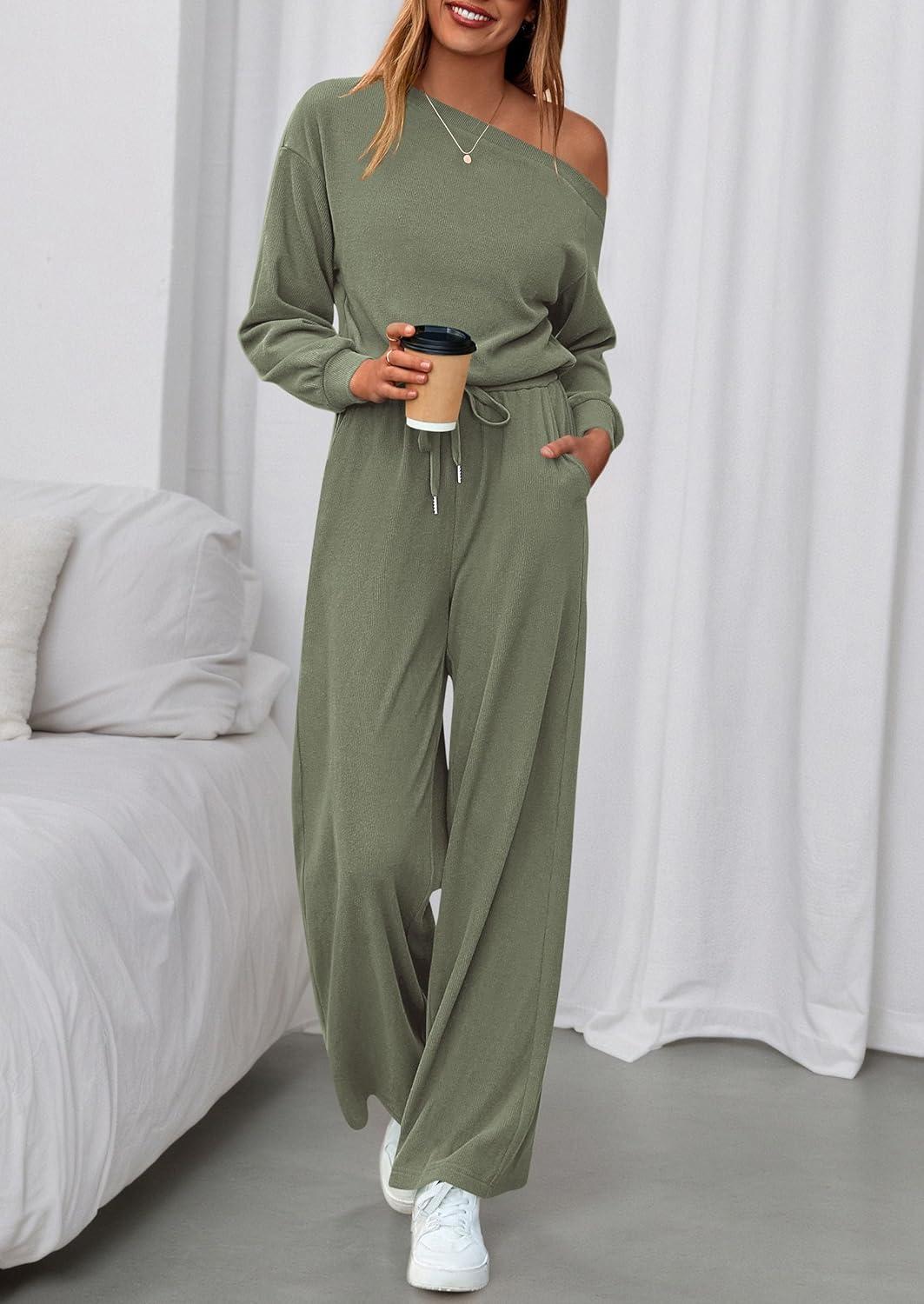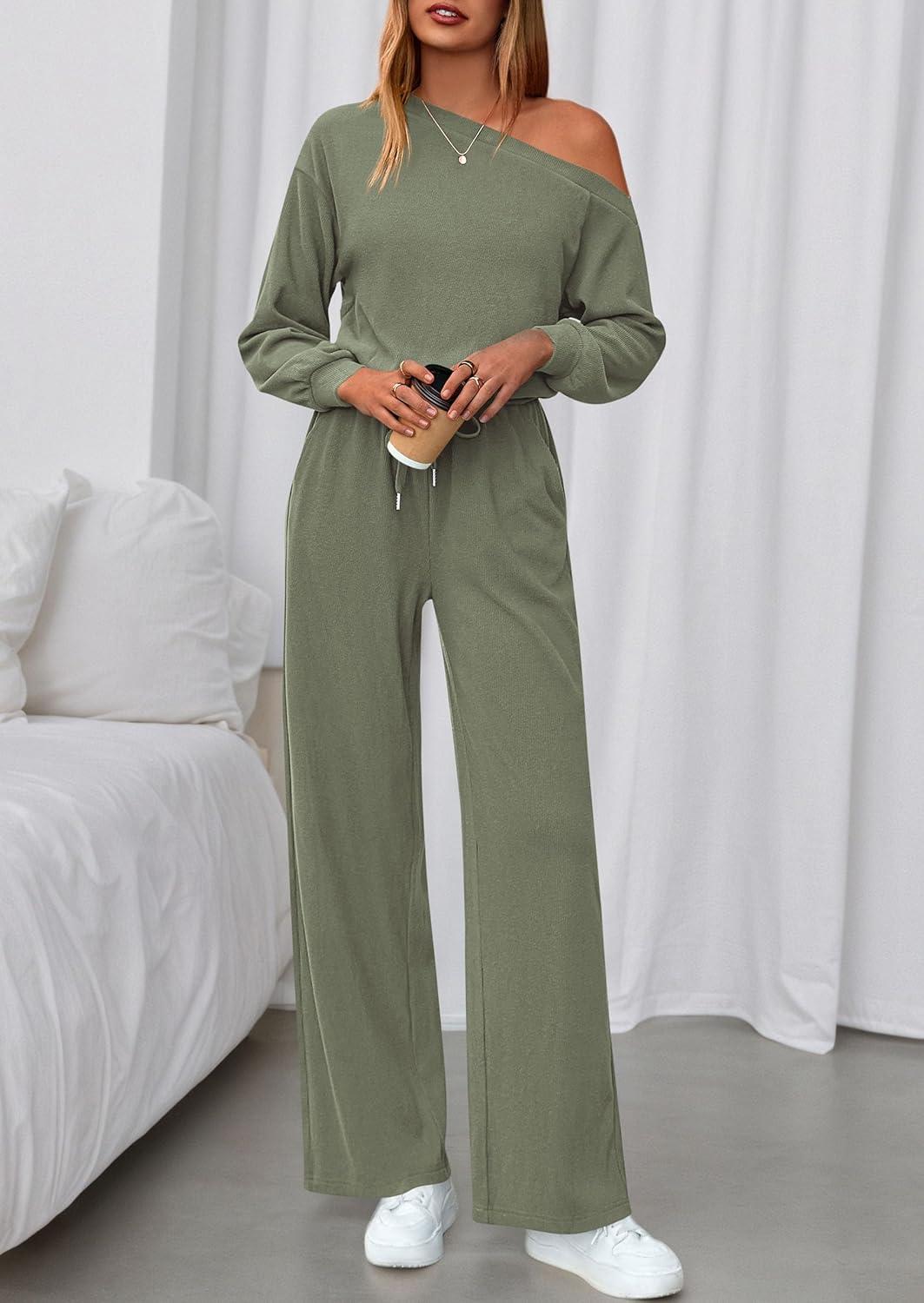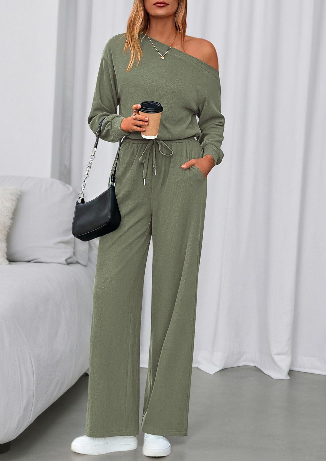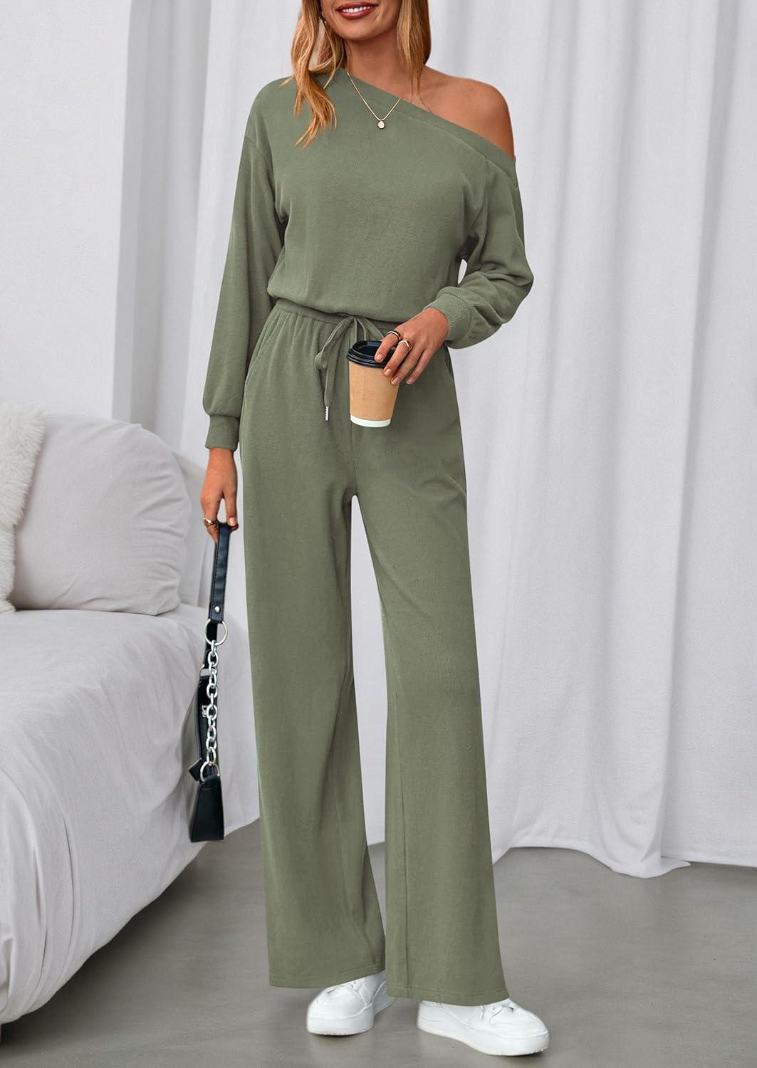 PRETTYGARDEN Long Sleeve Jumpsuit For Women Dressy 2025 Off Shoulder One Piece Loose Wide Leg Jumpsuits Casual Flowy Romper(Bean Green)