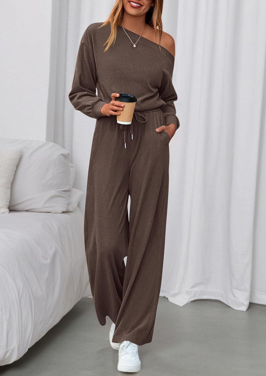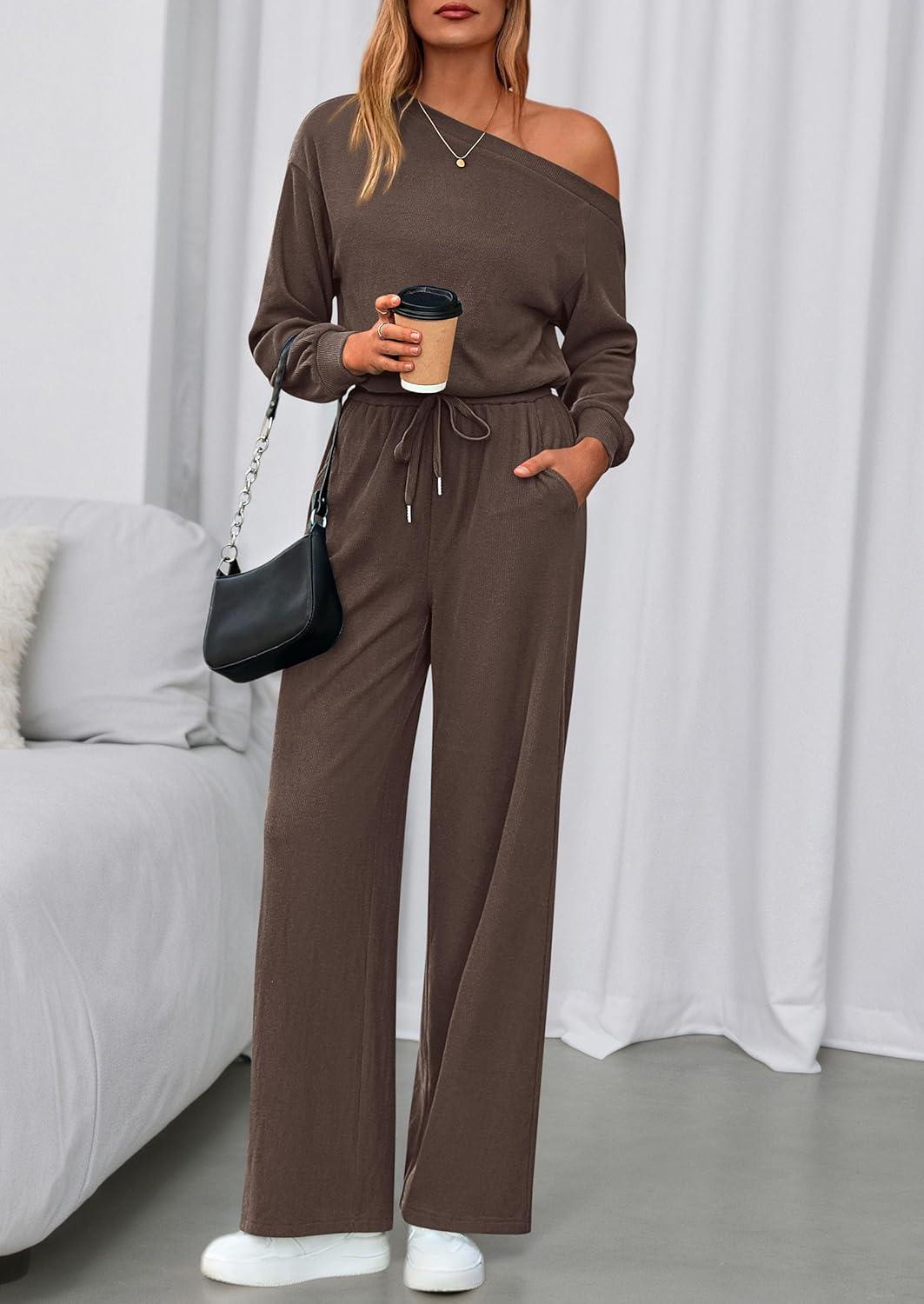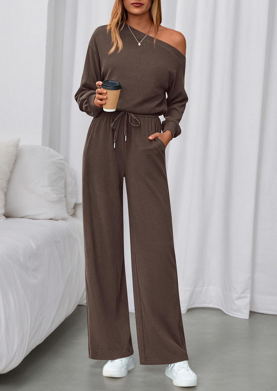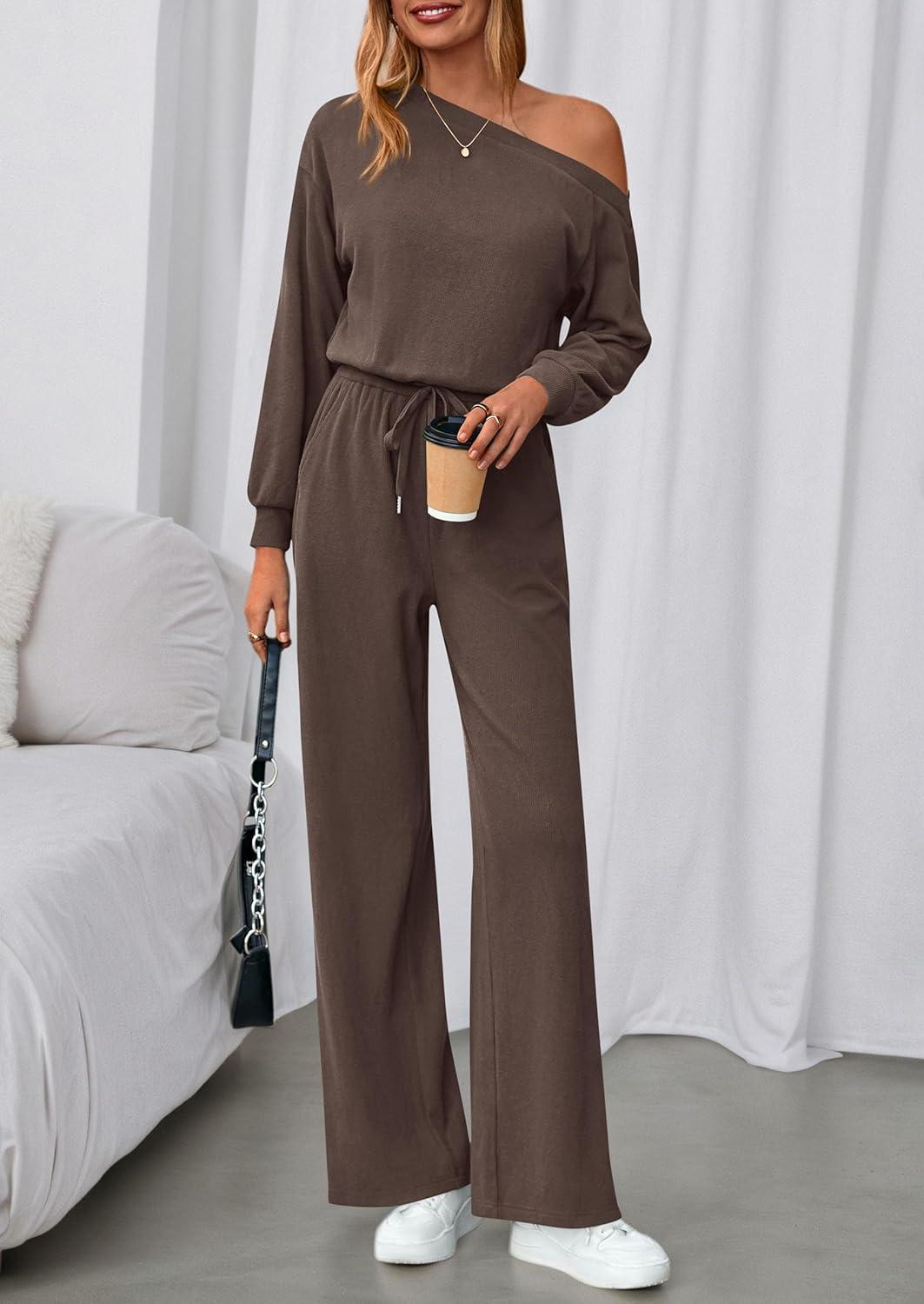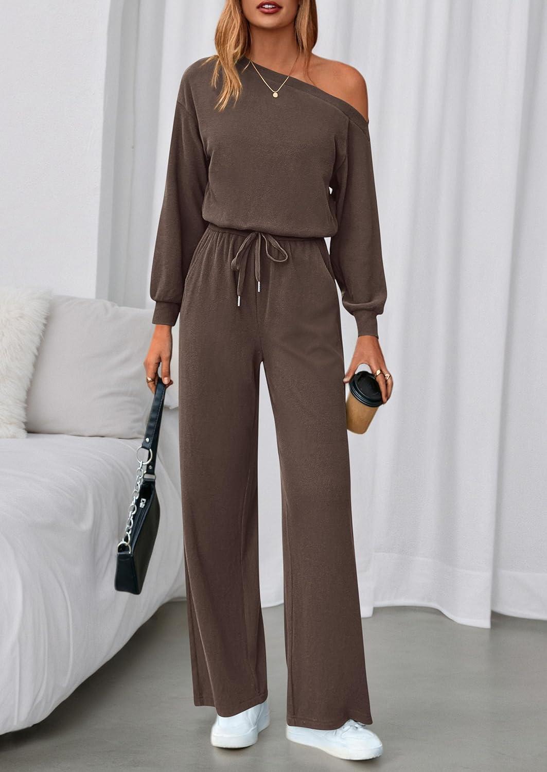 PRETTYGARDEN Long Sleeve Jumpsuit For Women Dressy 2025 Off Shoulder One Piece Loose Wide Leg Jumpsuits Casual Flowy Romper(Brown)