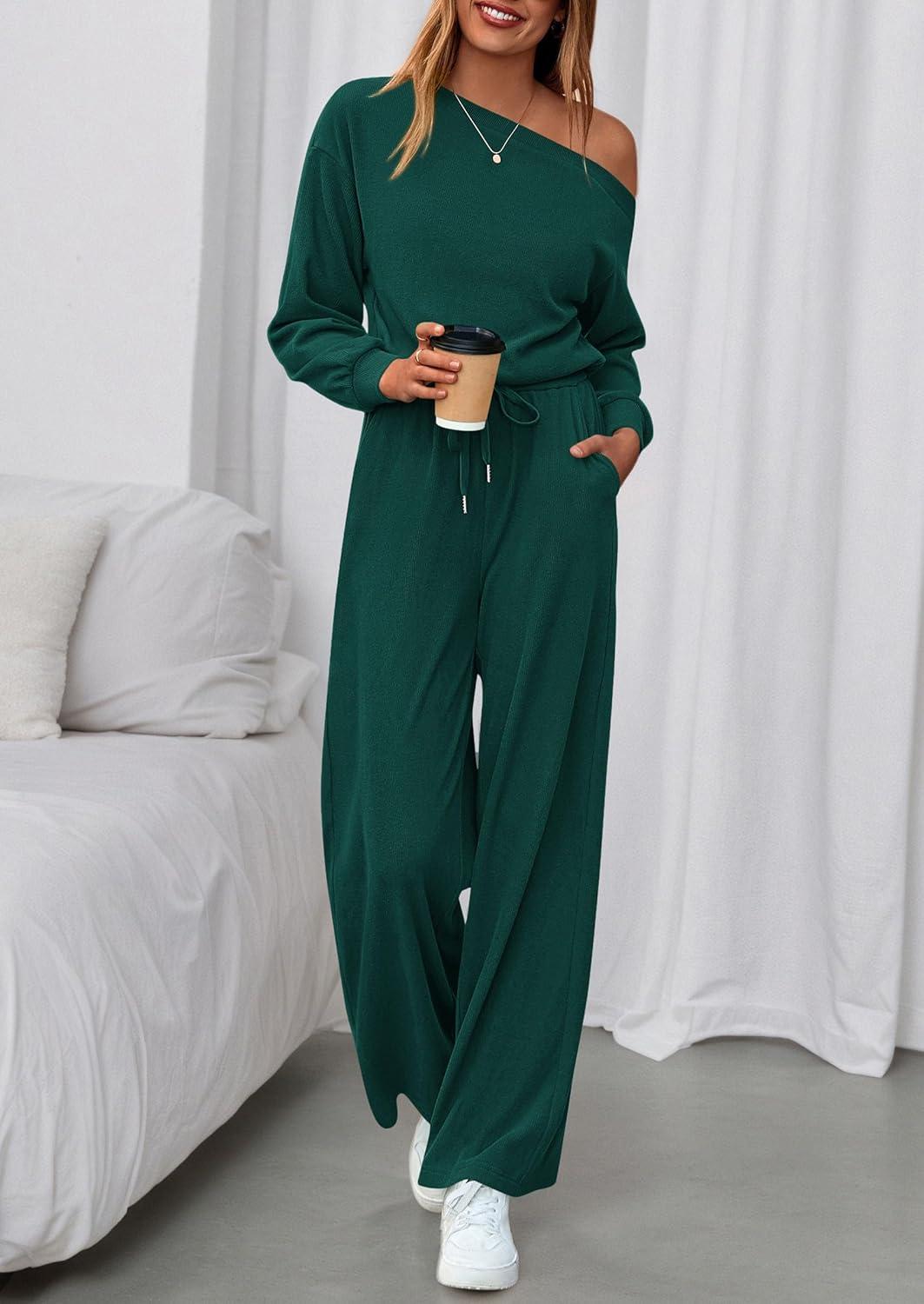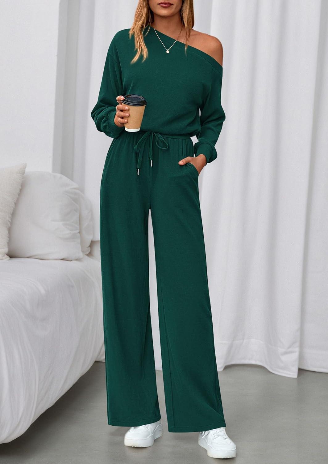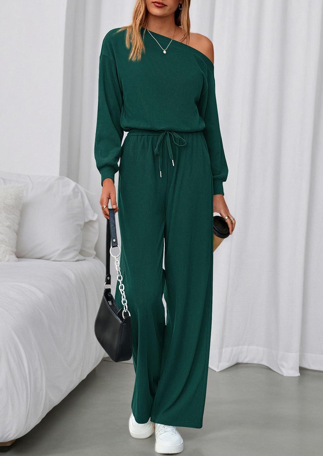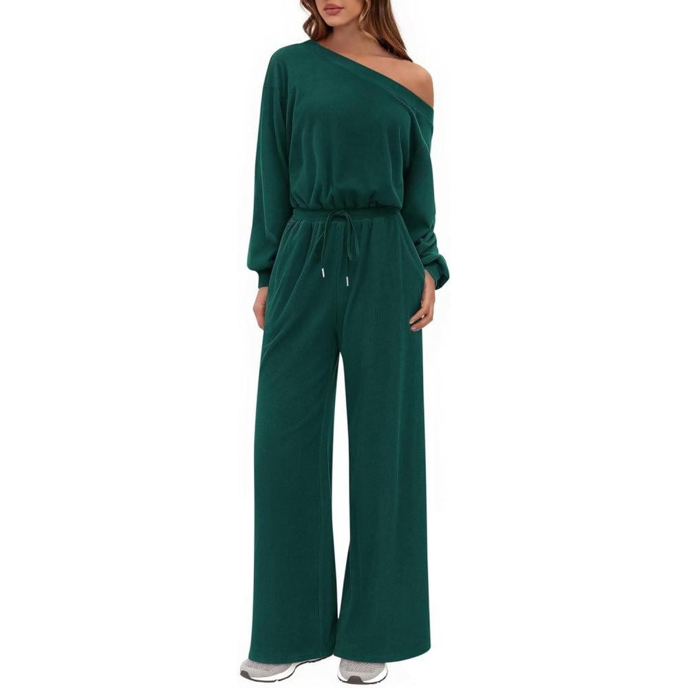 PRETTYGARDEN Long Sleeve Jumpsuit For Women Dressy 2025 Off Shoulder One Piece Loose Wide Leg Jumpsuits Casual Flowy Romper(Dark Green)