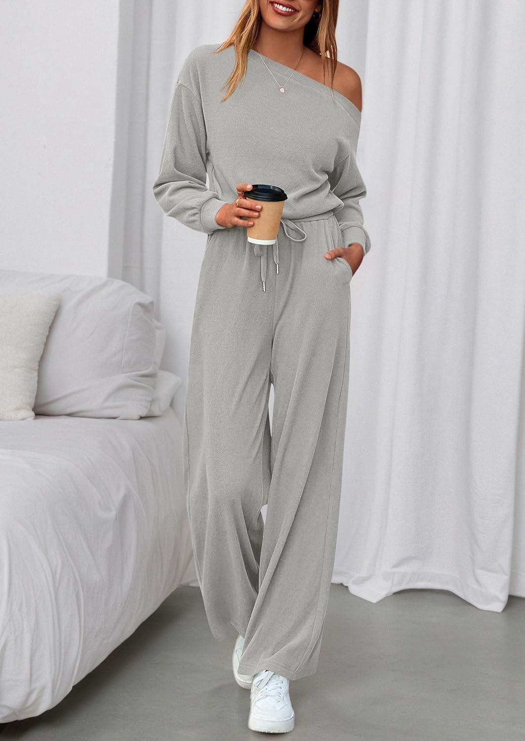 PRETTYGARDEN Long Sleeve Jumpsuit For Women Dressy 2025 Off Shoulder One Piece Loose Wide Leg Jumpsuits Casual Flowy Romper(Grey)