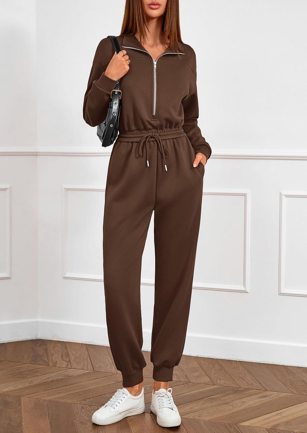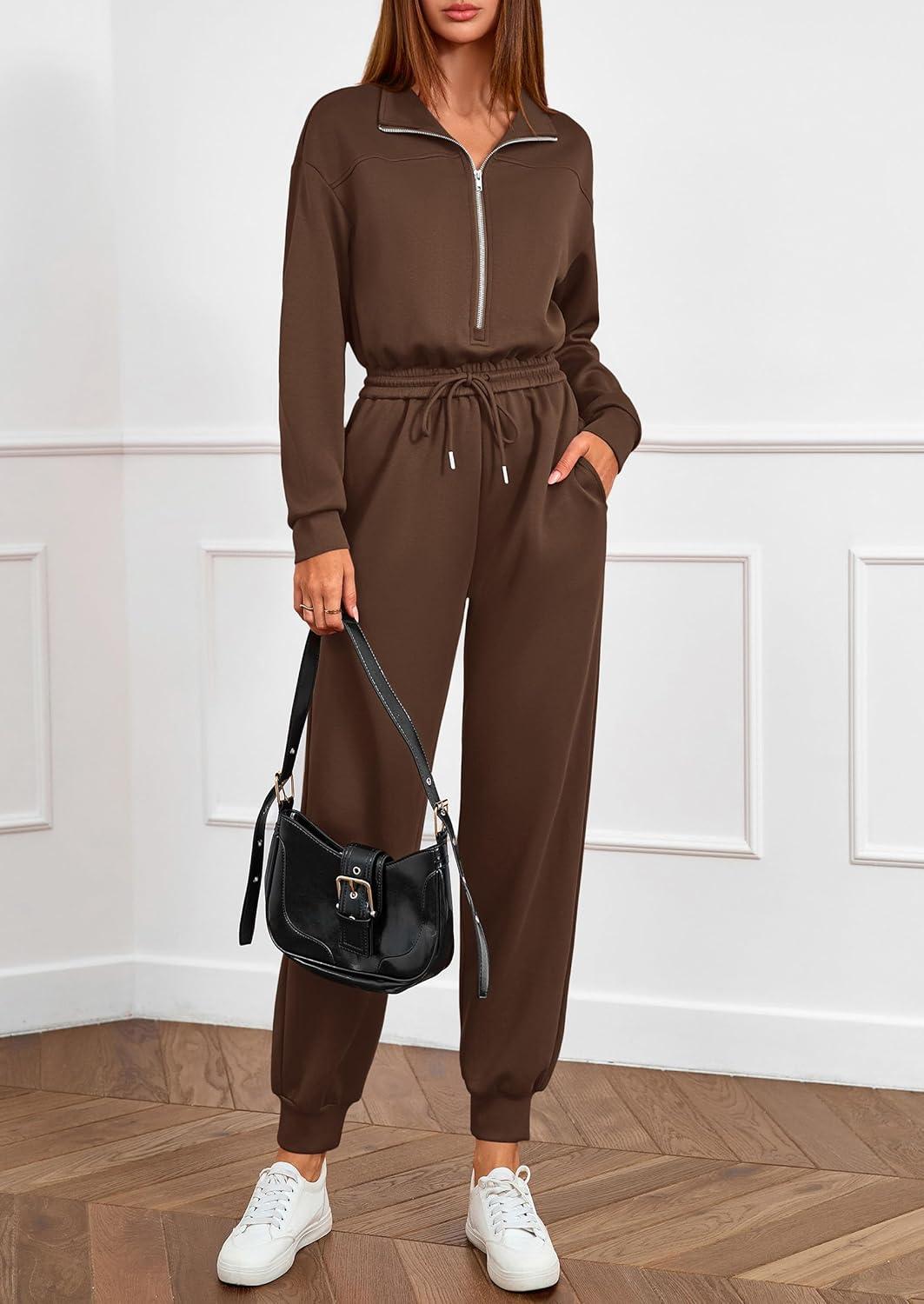 PRETTYGARDEN Long Sleeve Jumpsuits for Women Casual 2025 Fall Fashion Zip Up Pant Rompers One Piece Sweatsuits Travel Outfits(Brown)