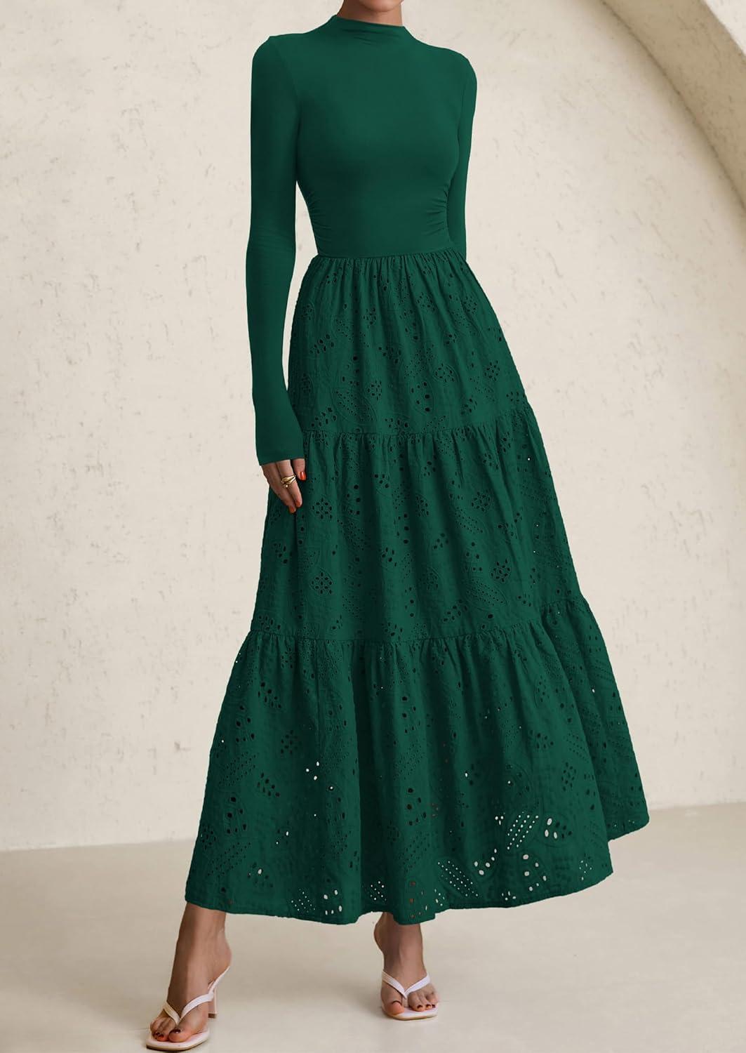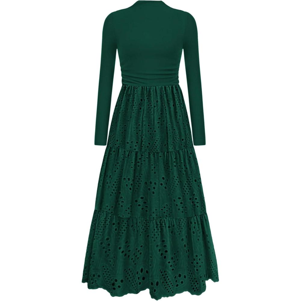 PRETTYGARDEN Long Sleeve Maxi Dress for Women 2025 Fall Eyelet A Line Elegant Classy Flowy Mock Neck Wedding Guest Dresses(Dark Green)