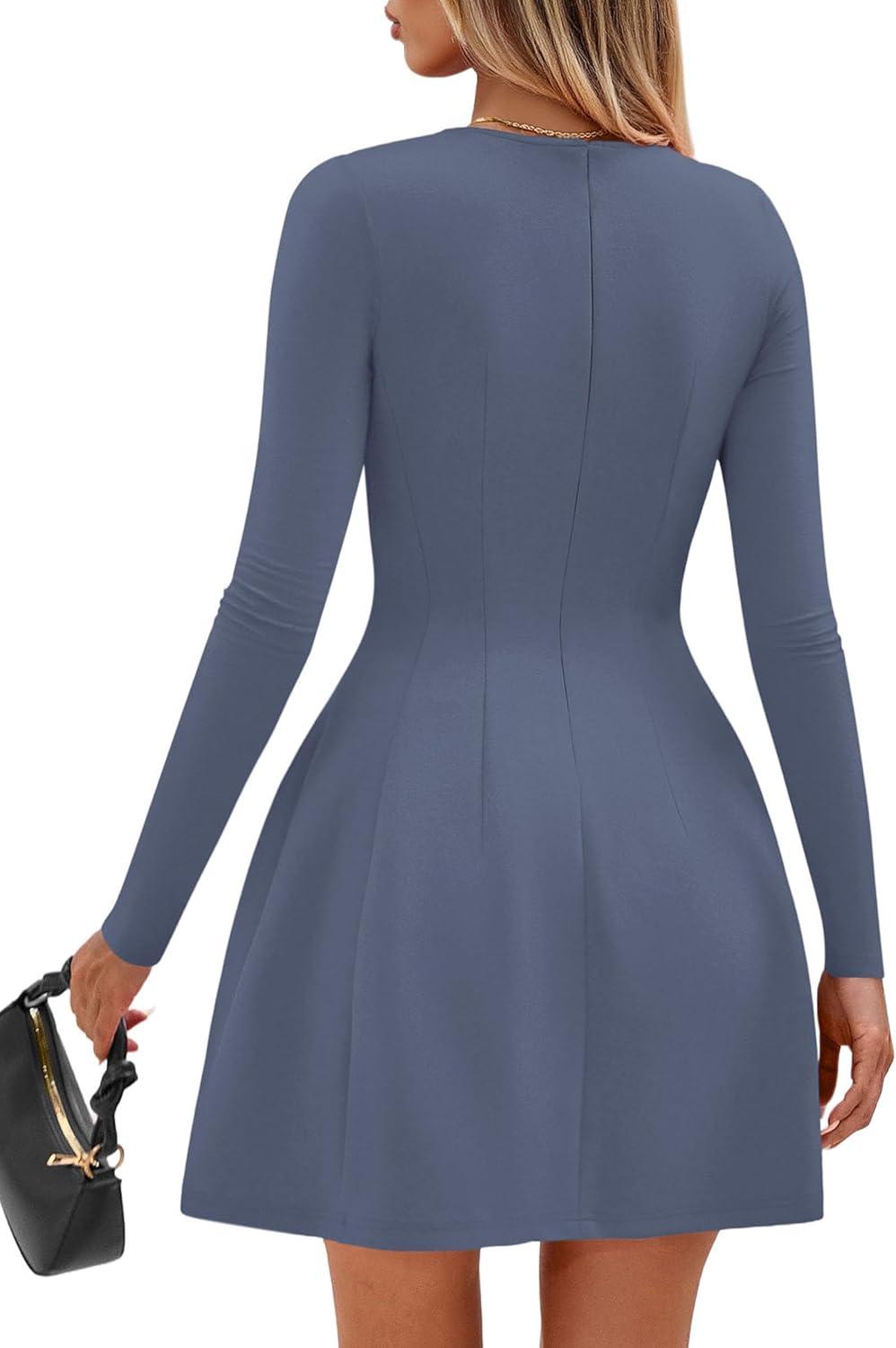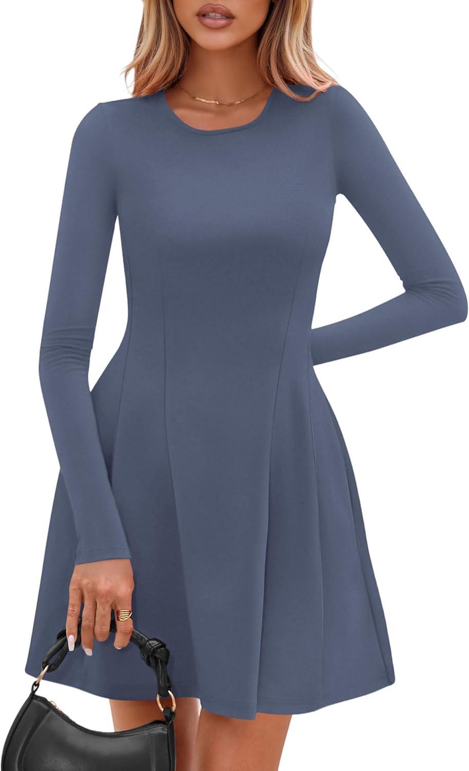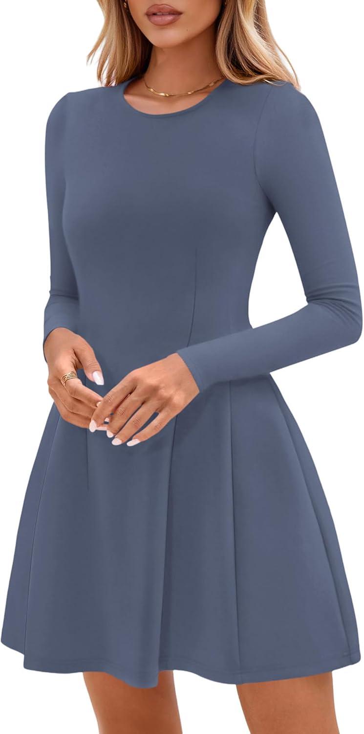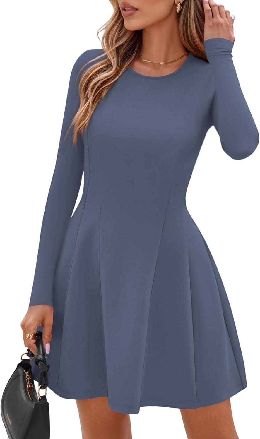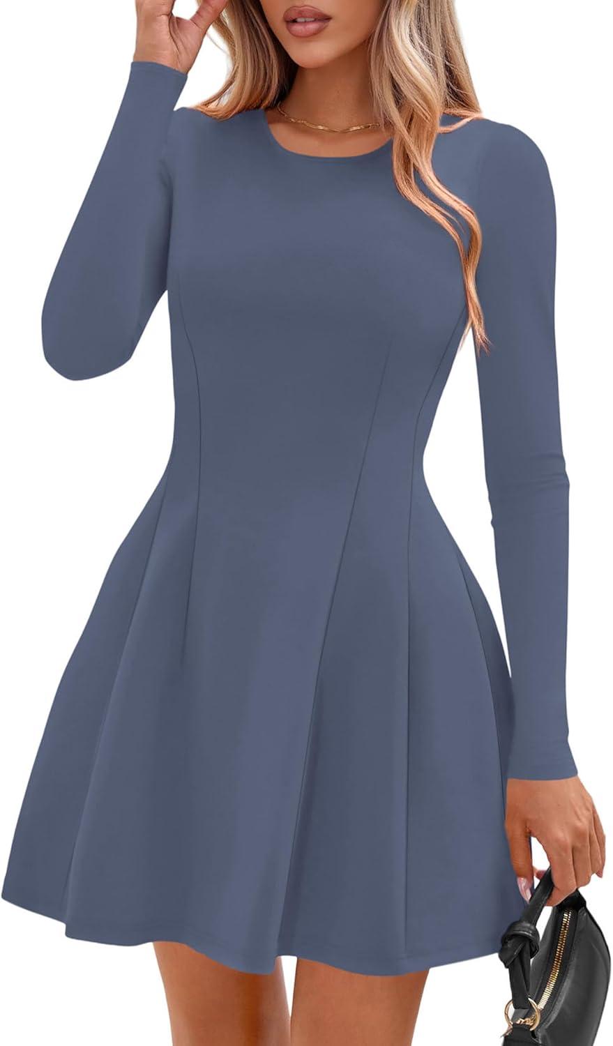 PRETTYGARDEN Long Sleeve Mini Dress for Women 2025 Fall Crewneck Knit Pleated Babydoll A Line Soft Casual Short Party Dresses(Blue)