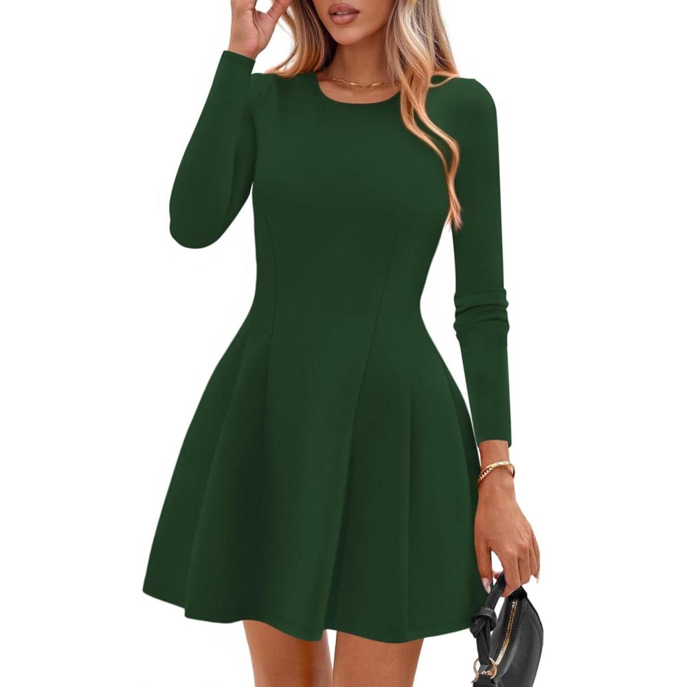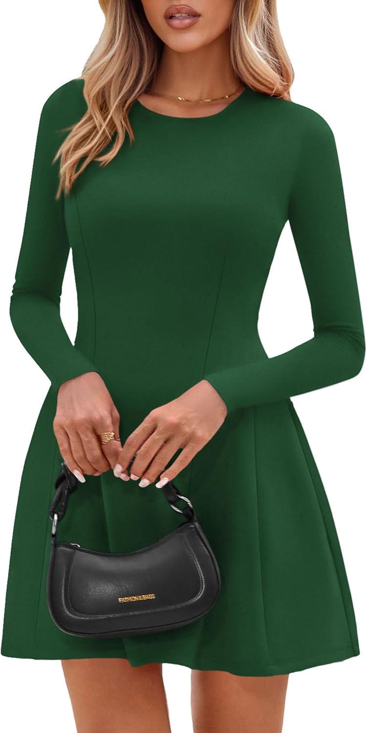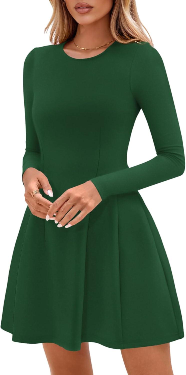 PRETTYGARDEN Long Sleeve Mini Dress for Women 2025 Fall Crewneck Knit Pleated Babydoll A Line Soft Casual Short Party Dresses(Green)