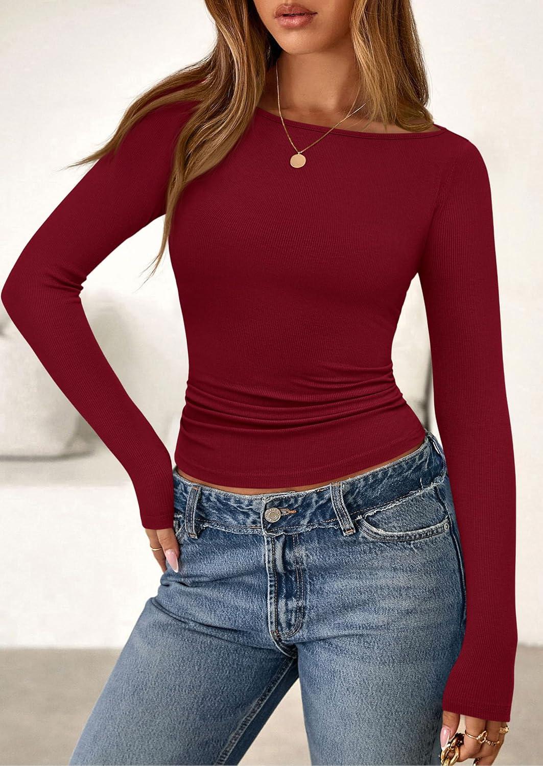 PRETTYGARDEN Long Sleeve Shirts for Women 2025 Fall Boat Neck Ribbed Knit Ruched Fitted Going Out Tops Casual Basic Tees(Burgundy)
