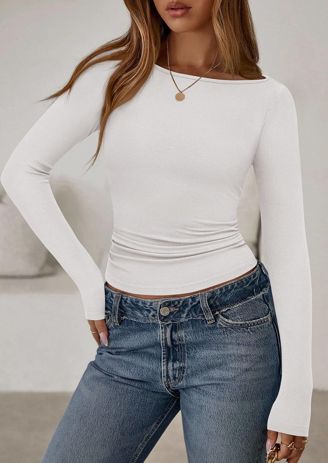 PRETTYGARDEN Long Sleeve Shirts for Women 2025 Fall Boat Neck Ribbed Knit Ruched Fitted Going Out Tops Casual Basic Tees(White)