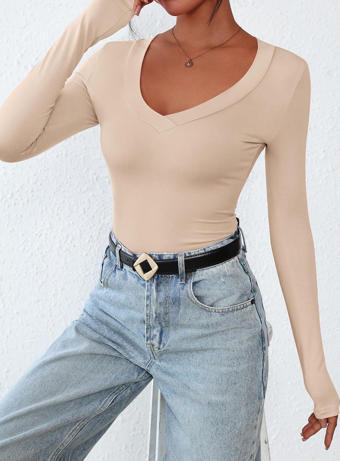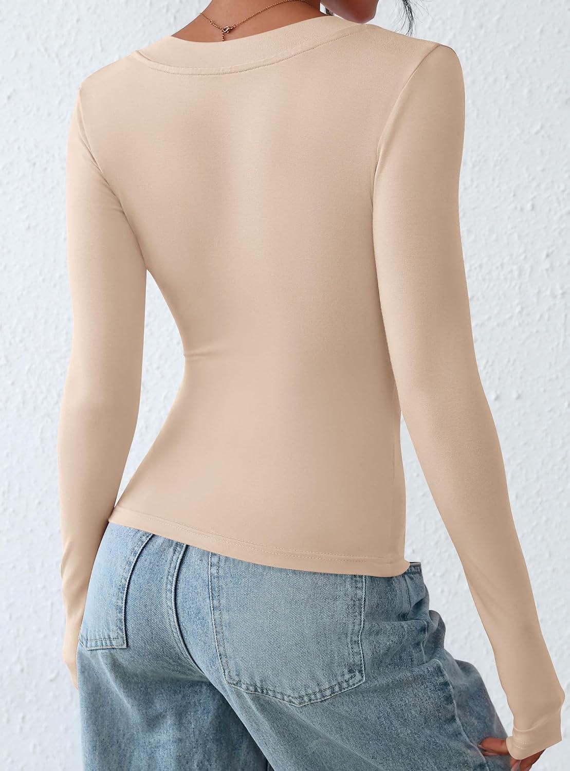 PRETTYGARDEN Long Sleeve Shirts for Women 2025 Fall Fashion V Neck Going Out Tops Slim Fit Basic Tees Y2K Clothes(Apricot)