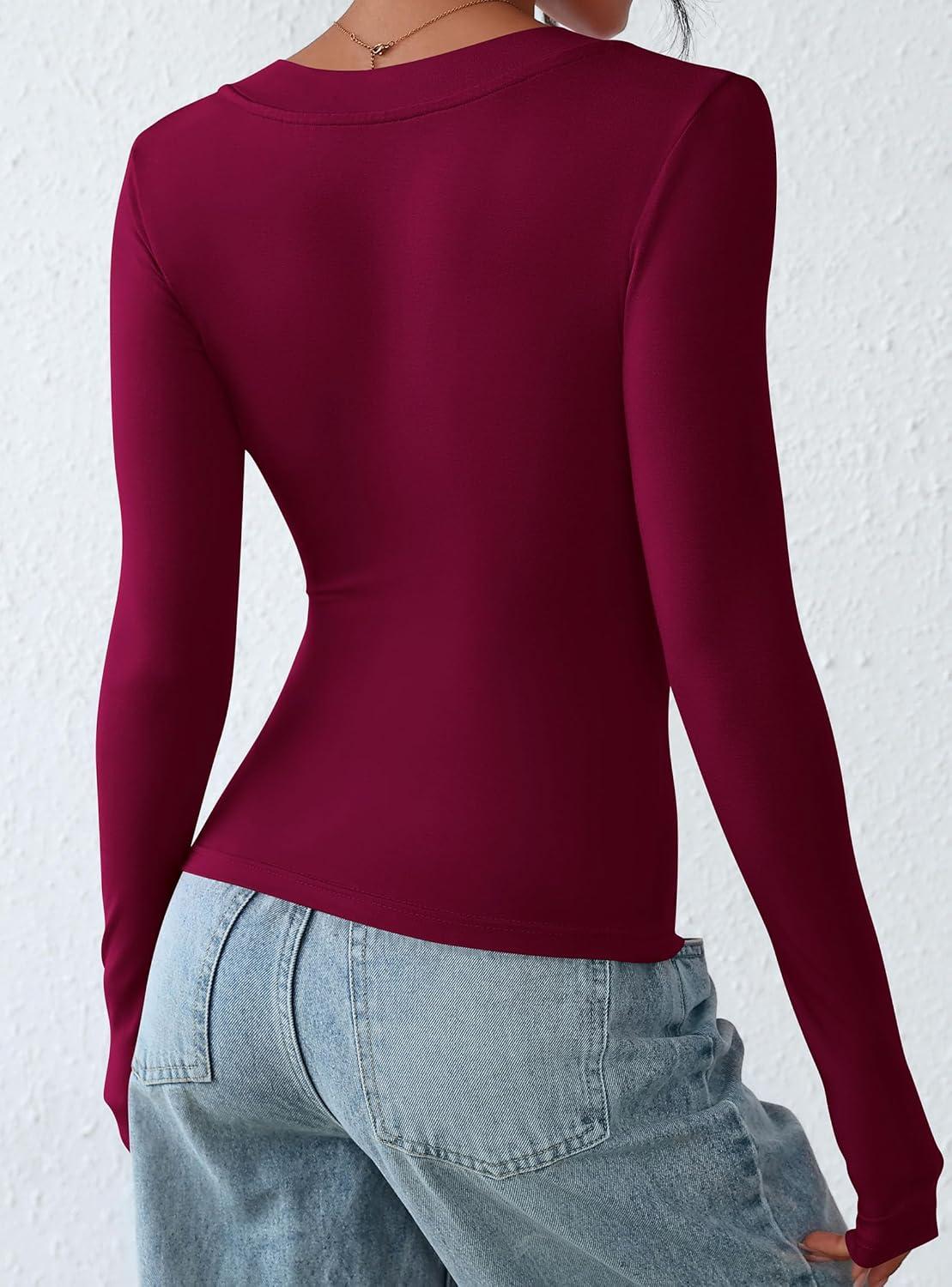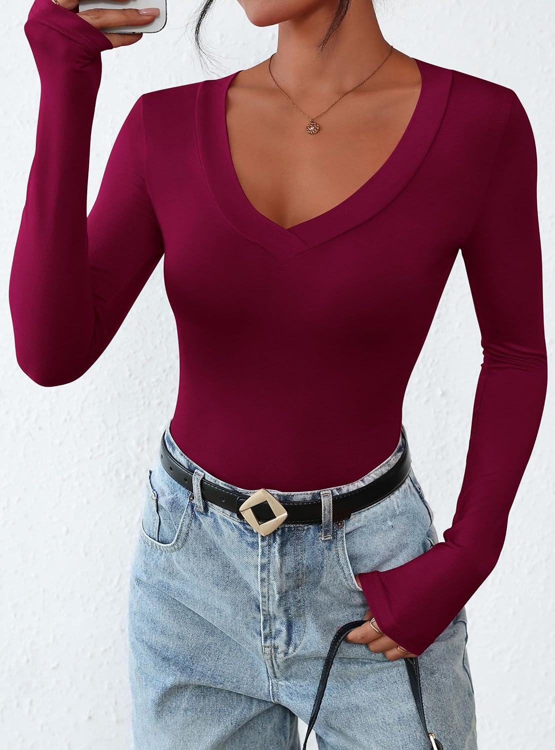 PRETTYGARDEN Long Sleeve Shirts for Women 2025 Fall Fashion V Neck Going Out Tops Slim Fit Basic Tees Y2K Clothes(Burgundy)