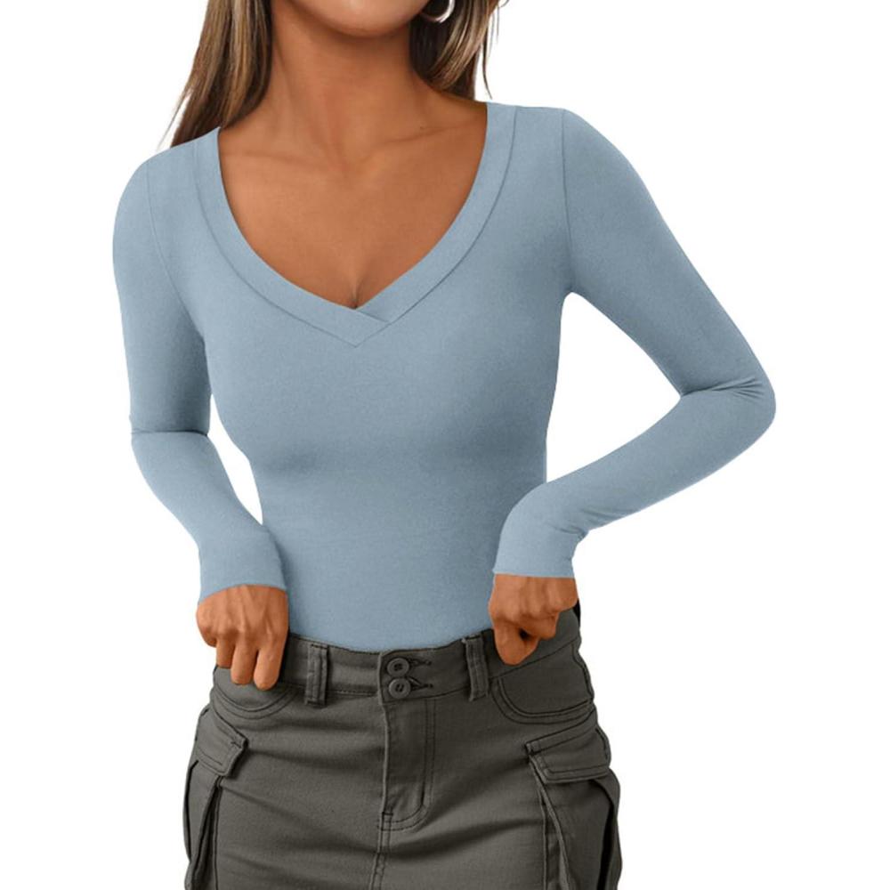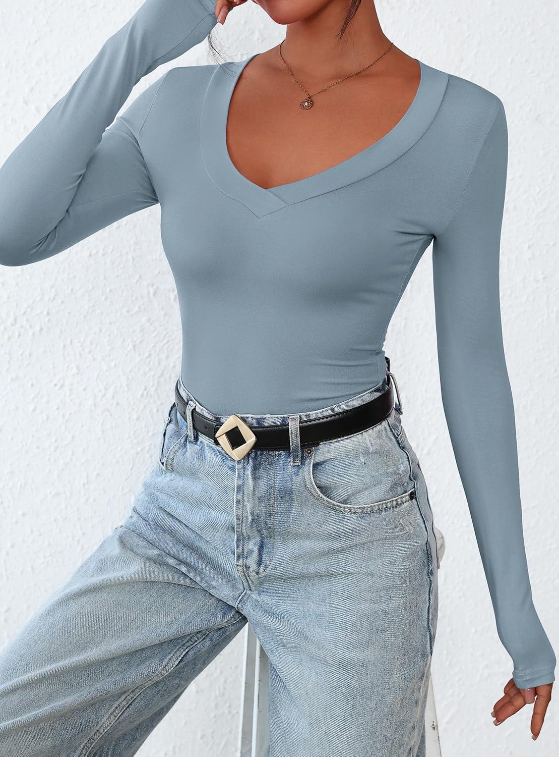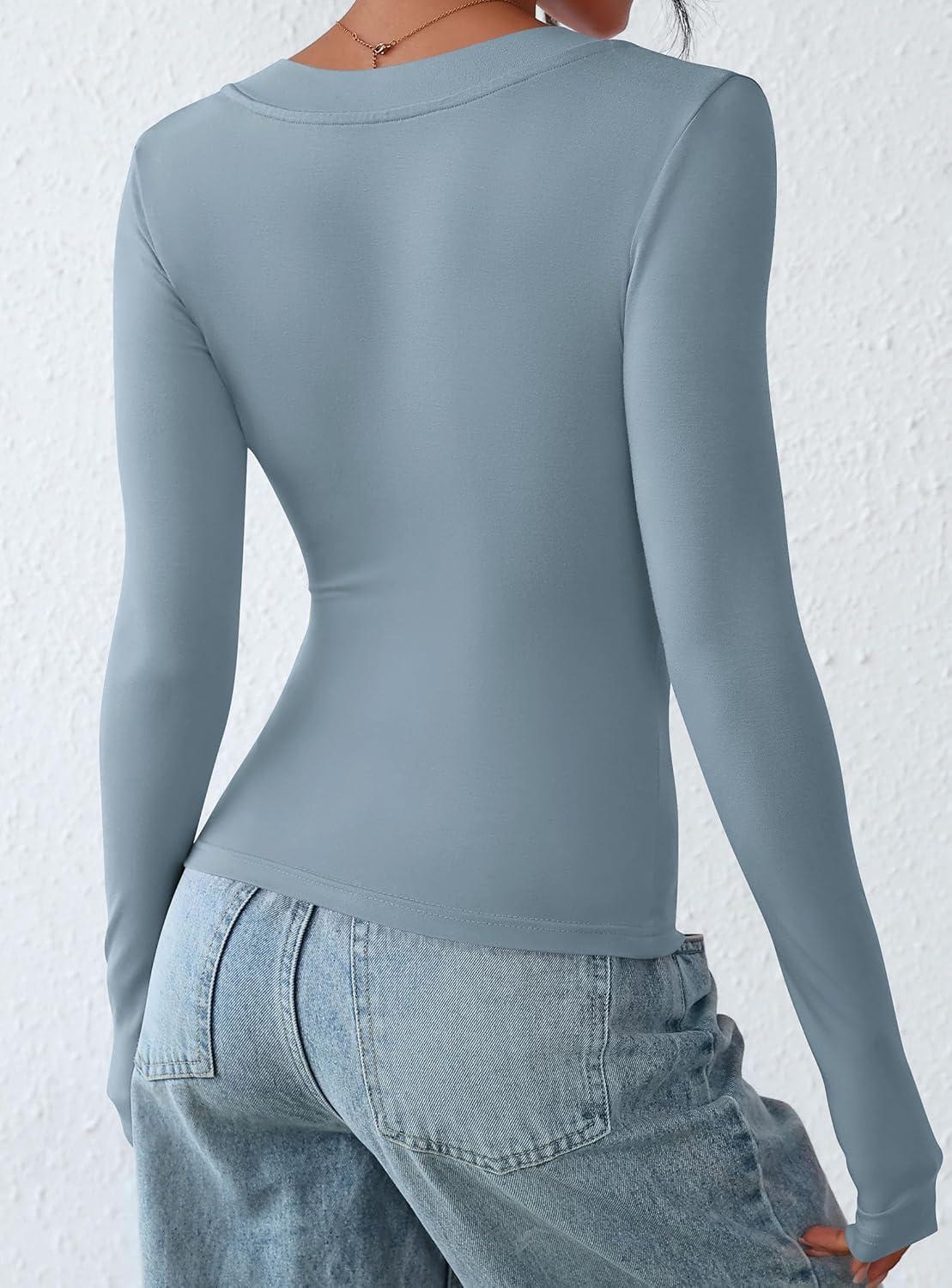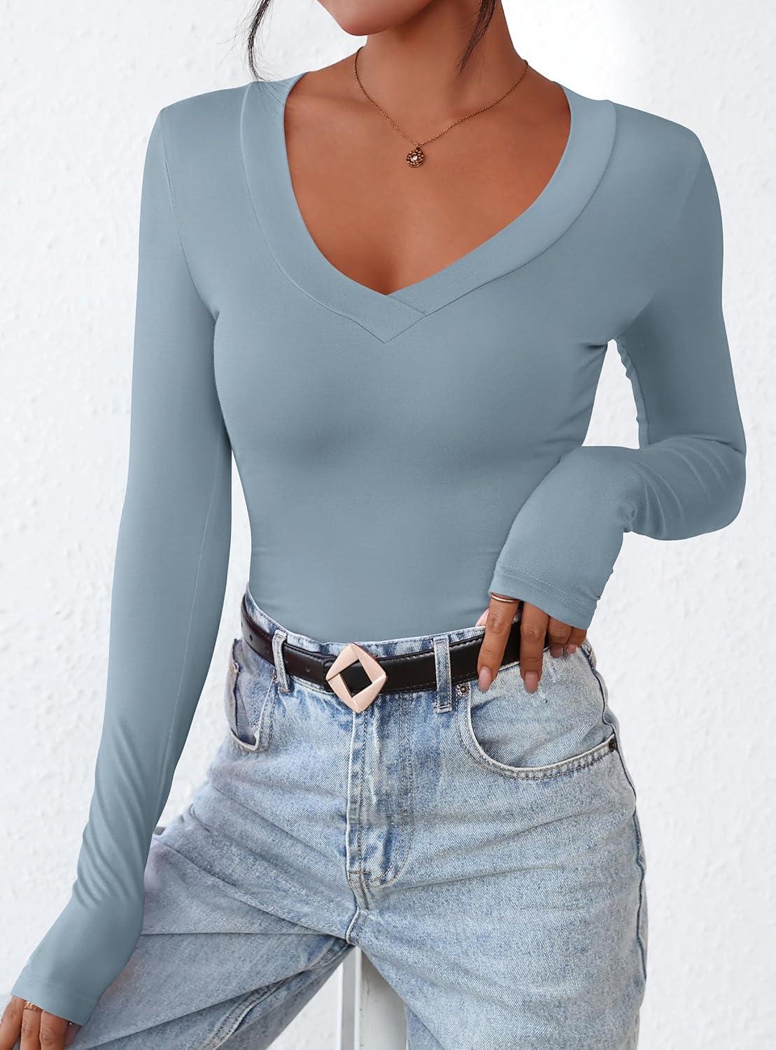 PRETTYGARDEN Long Sleeve Shirts for Women 2025 Fall Fashion V Neck Going Out Tops Slim Fit Basic Tees Y2K Clothes(Light Grey Blue)