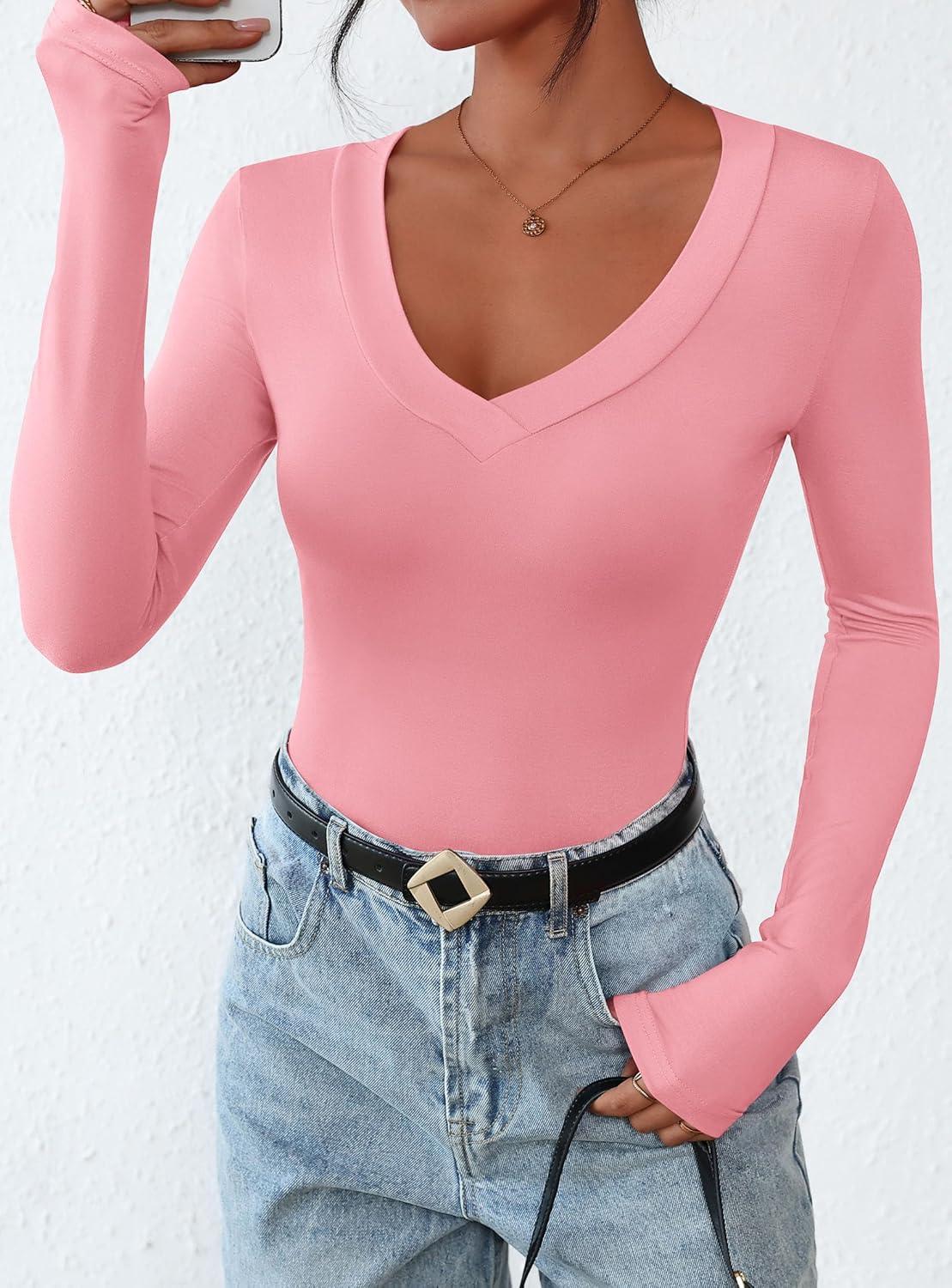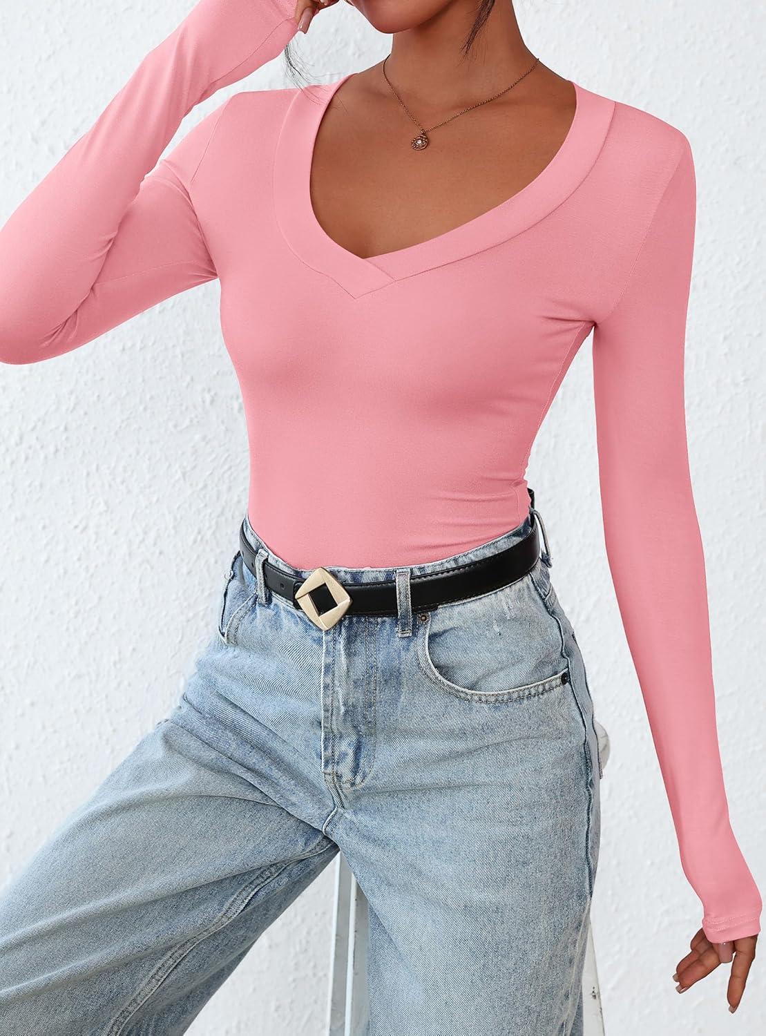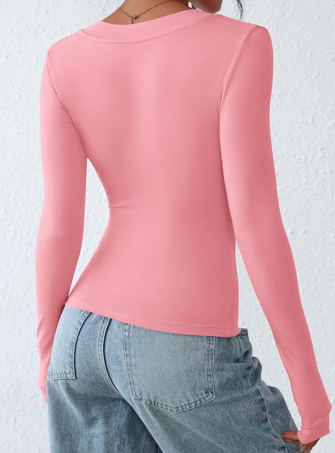 PRETTYGARDEN Long Sleeve Shirts for Women 2025 Fall Fashion V Neck Going Out Tops Slim Fit Basic Tees Y2K Clothes(Pink)