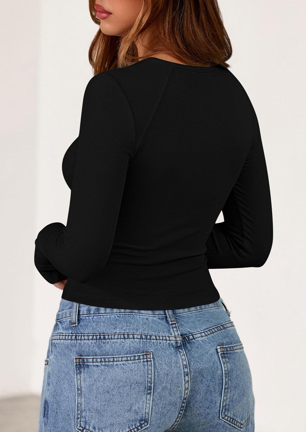 PRETTYGARDEN Long Sleeve Shirts for Women 2025 Fall Going Out Tops Casual Ribbed Knit Slim Fitted Basic Tees Y2K Clothes(Black)