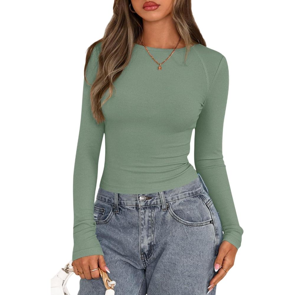 PRETTYGARDEN Long Sleeve Shirts for Women 2025 Fall Going Out Tops Casual Ribbed Knit Slim Fitted Basic Tees Y2K Clothes(Sage Green)