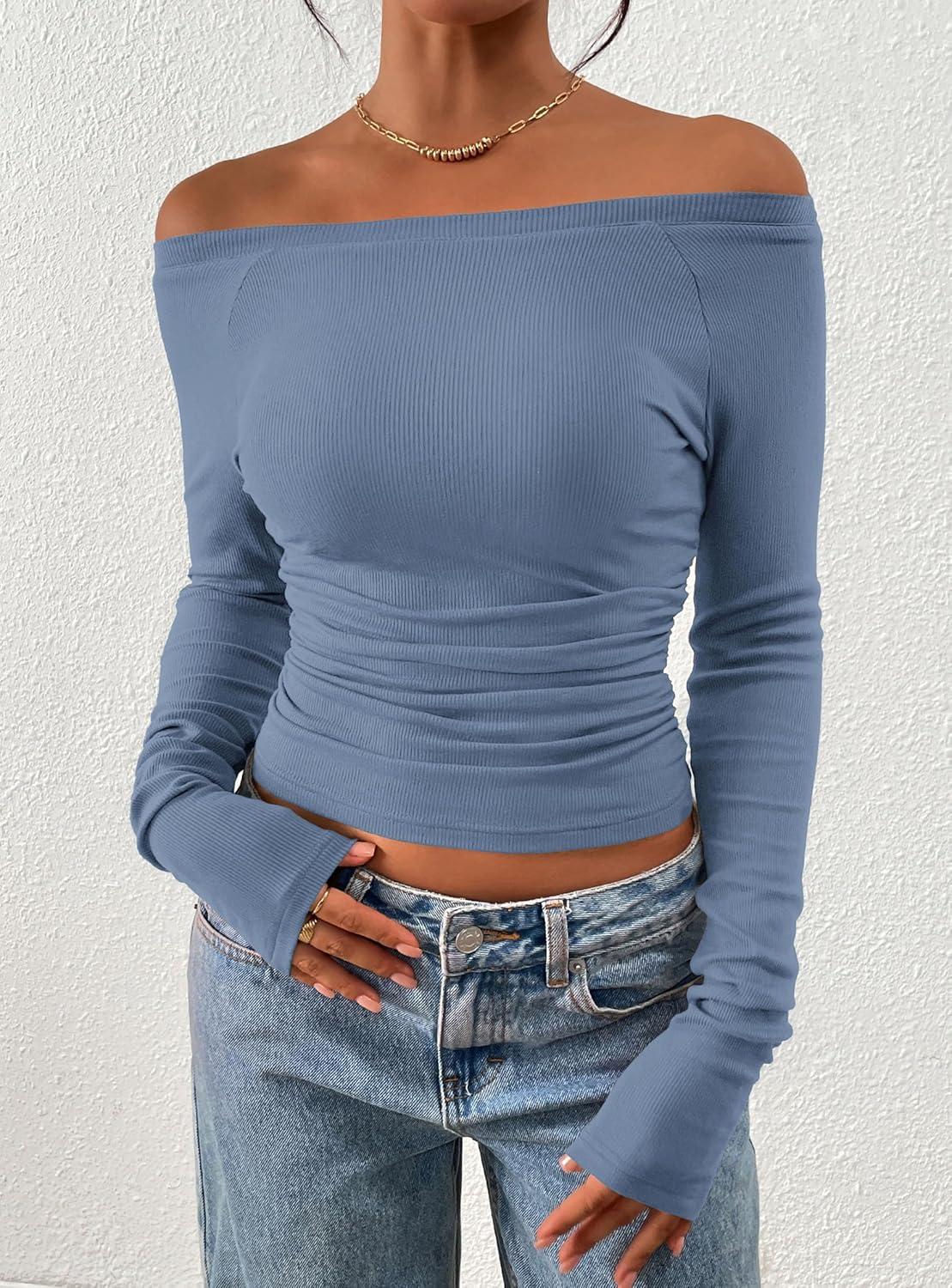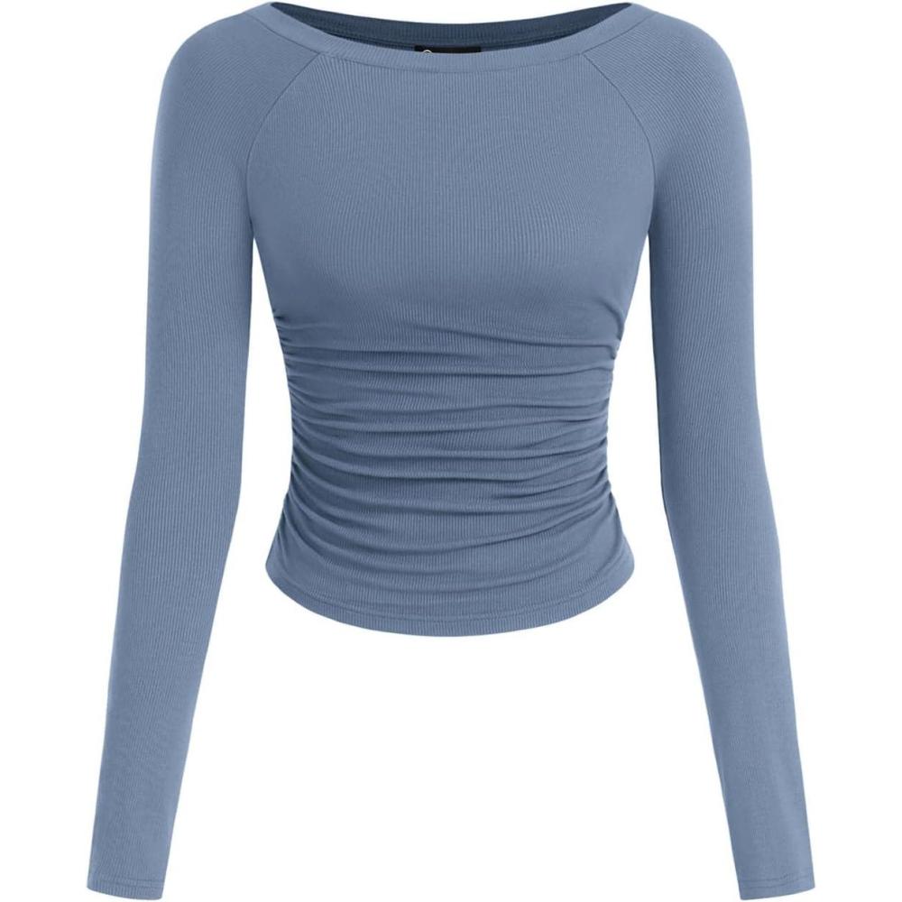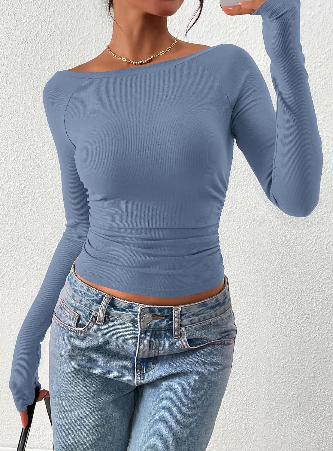PRETTYGARDEN Long Sleeve Shirts for Women 2025 Fall Ruched Sides Boat Neck Basic Tee Casual Fitted Ribbed Knit Crop Tops(Blue Grey)
