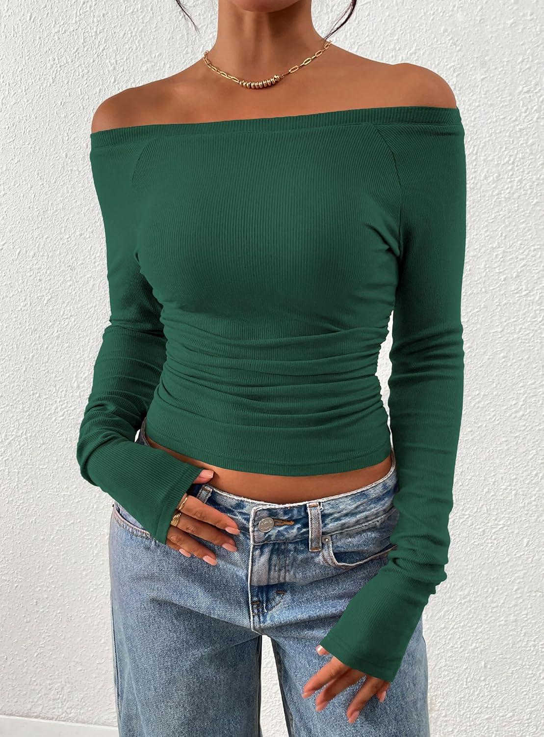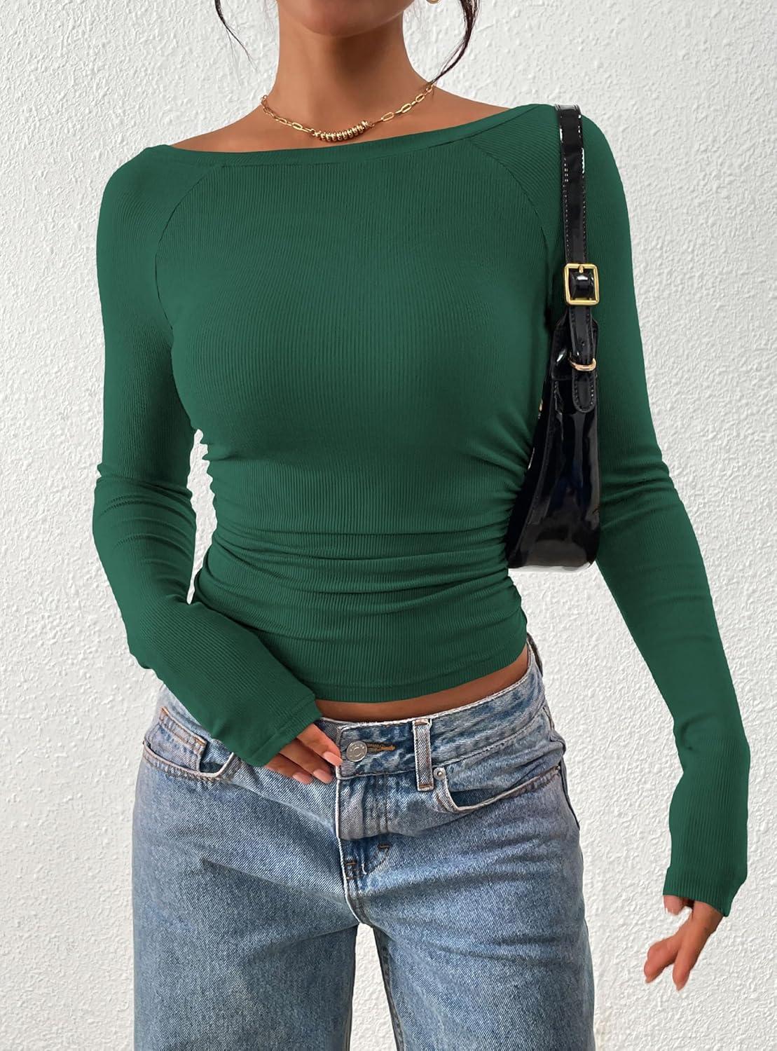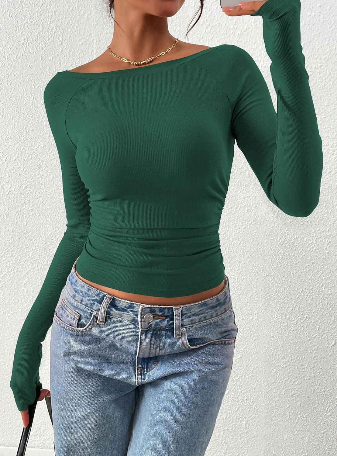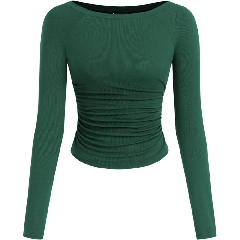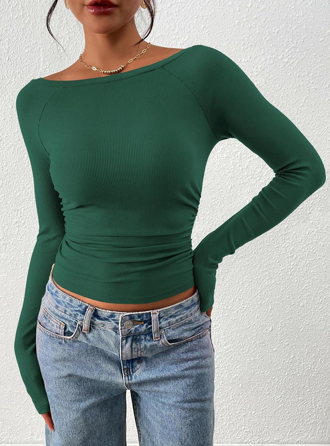 PRETTYGARDEN Long Sleeve Shirts for Women 2025 Fall Ruched Sides Boat Neck Basic Tee Casual Fitted Ribbed Knit Crop Tops(Dark Green)