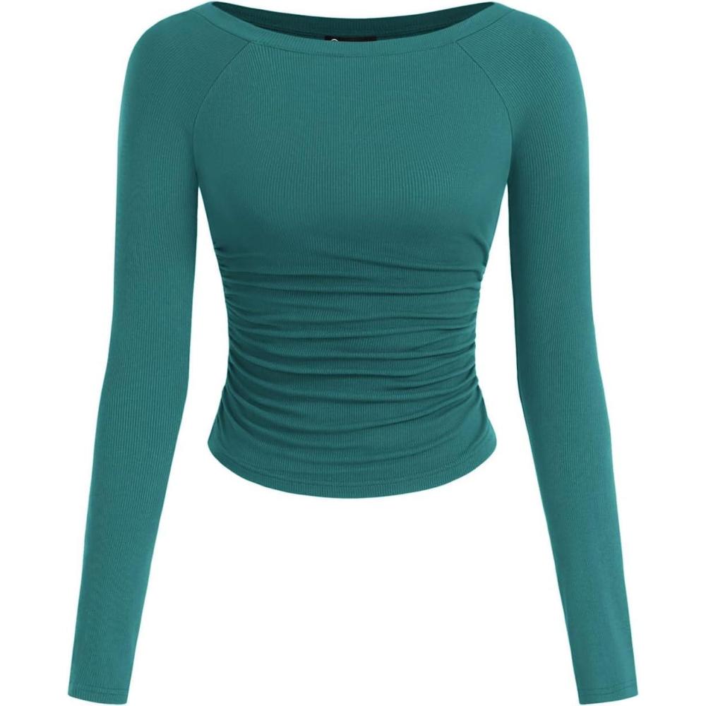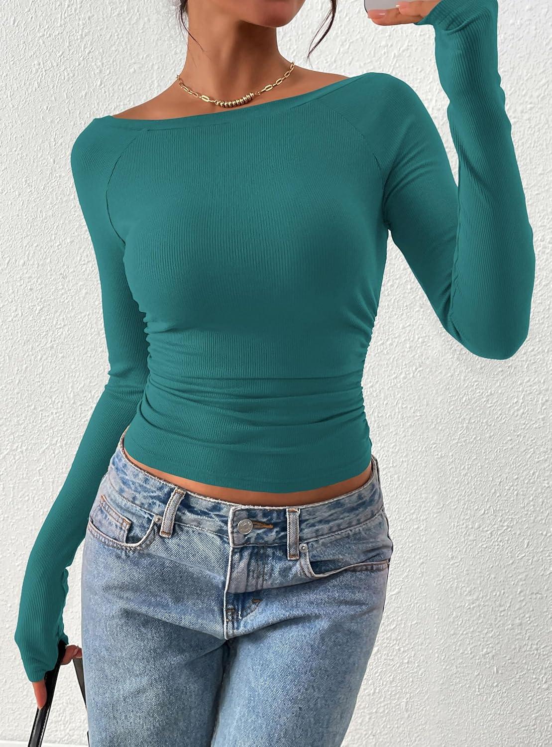 PRETTYGARDEN Long Sleeve Shirts for Women 2025 Fall Ruched Sides Boat Neck Basic Tee Casual Fitted Ribbed Knit Crop Tops(Lake Blue)