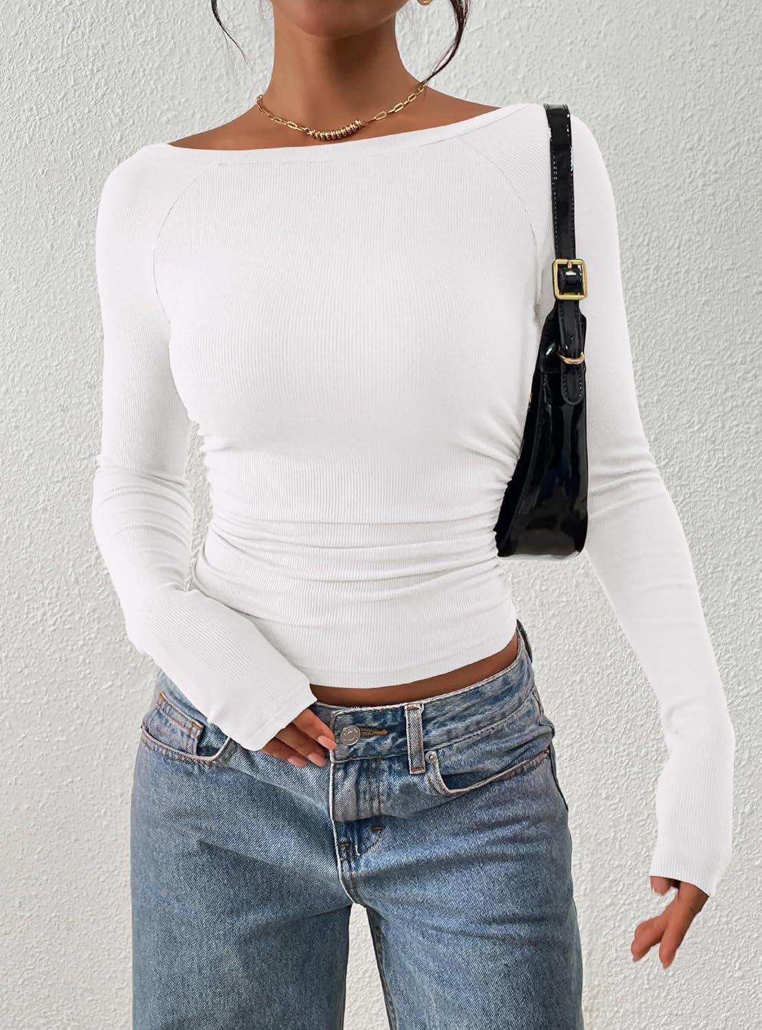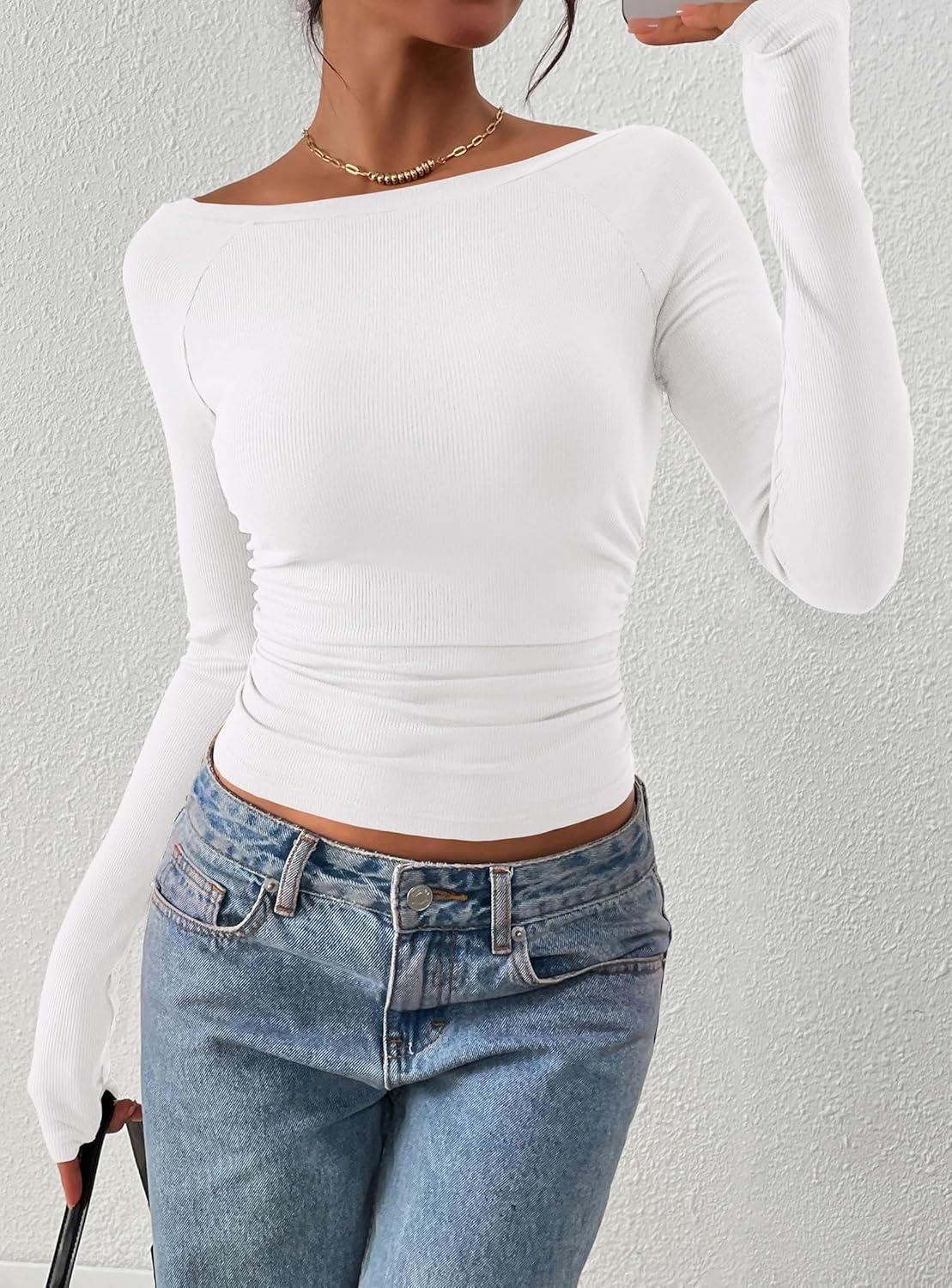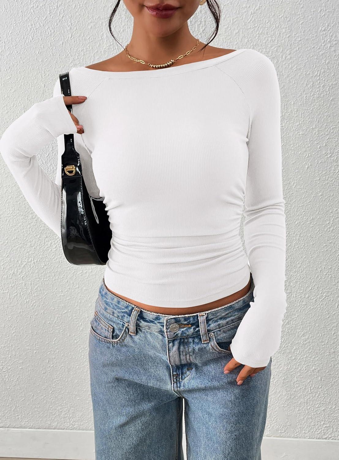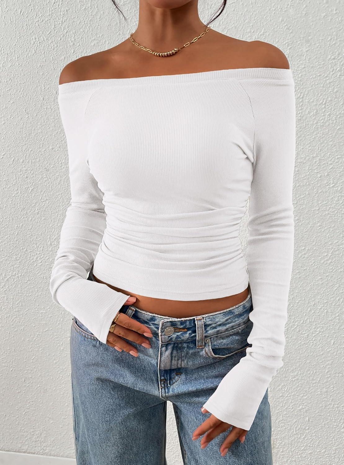 PRETTYGARDEN Long Sleeve Shirts for Women 2025 Fall Ruched Sides Boat Neck Basic Tee Casual Fitted Ribbed Knit Crop Tops(White)