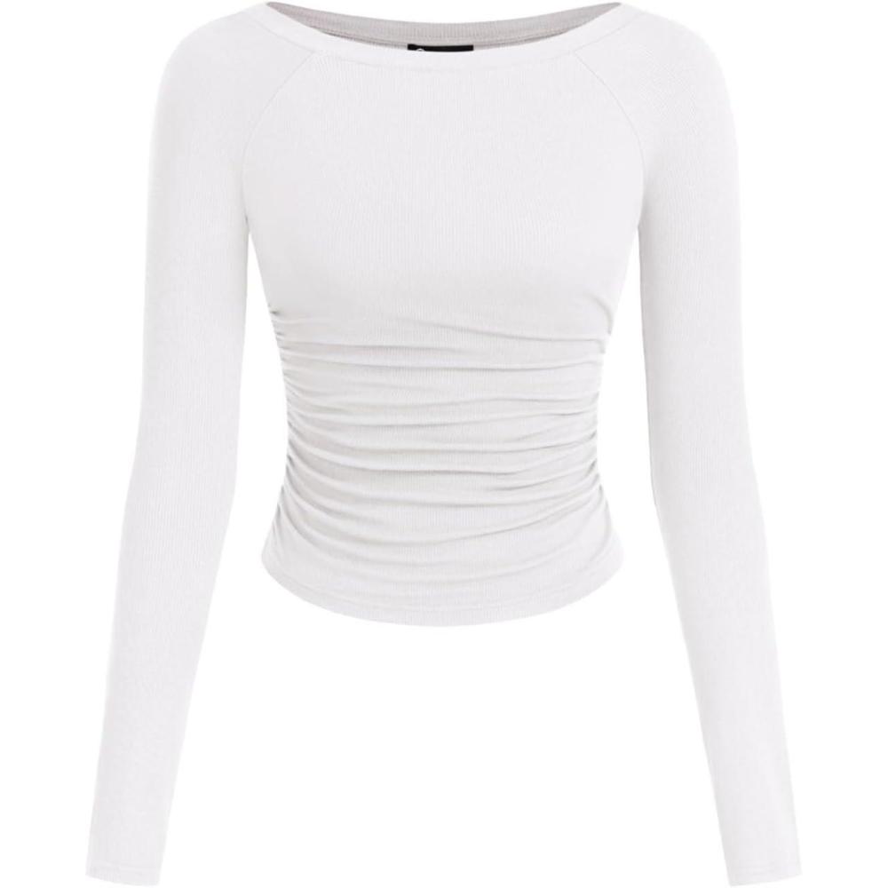 imagePRETTYGARDEN Long Sleeve Shirts for Women 2025 Fall Ruched Sides Boat Neck Basic Tee Casual Fitted Ribbed Knit Crop TopsWhite